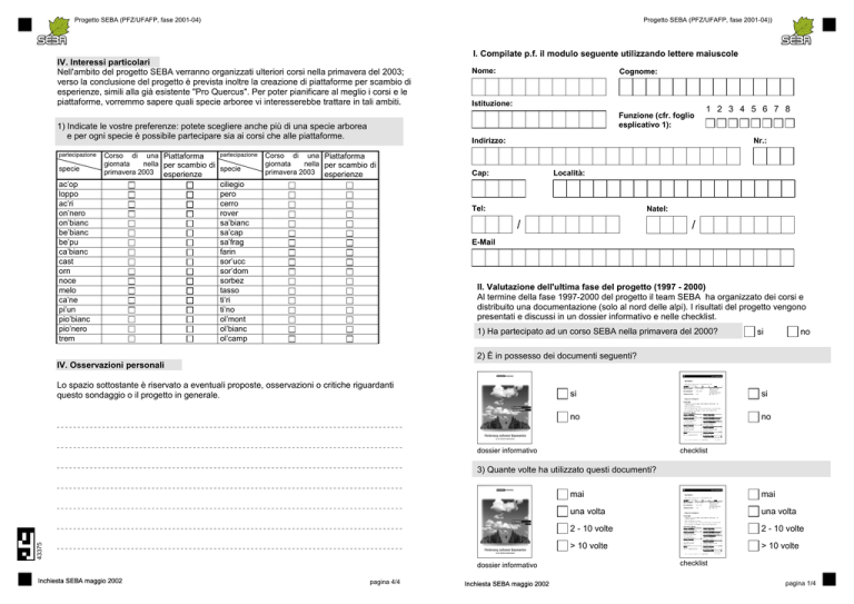 Progetto SEBA (PFZ/UFAFP, fase 2001-04) Progetto SEBA (PFZ/UFAFP, fase 2001-04)) IV. Interessi particolari Nell'ambito del progetto SEBA verranno organizzati ulteriori corsi nella primavera del 2003; verso la conclusione del progetto è prevista inoltre la creazione di piattaforme per scambio di esperienze, simili alla già esistente "Pro Quercus". Per poter pianificare al meglio i corsi e le piattaforme, vorremmo sapere quali specie arboree vi interesserebbe trattare in tali ambiti. specie partecipazione Corso di una Piattaforma giornata nella per scambio di specie primavera 2003 esperienze ac’op loppo ac’ri on’nero on’bianc be’bianc be’pu ca’bianc cast orn noce melo ca’ne pi’un pio’bianc pio’nero trem Nome: Cognome: Istituzione: Funzione (cfr. foglio esplicativo 1): 1) Indicate le vostre preferenze: potete scegliere anche più di una specie arborea e per ogni specie è possibile partecipare sia ai corsi che alle piattaforme. partecipazione I. Compilate p.f. il modulo seguente utilizzando lettere maiuscole 1 2 3 4 5 6 7 8 Indirizzo: Corso di una Piattaforma giornata nella per scambio di primavera 2003 esperienze ciliegio pero cerro rover sa’bianc sa’cap sa’frag farin sor’ucc sor’dom sorbez tasso ti’ri ti’no ol’mont ol’bianc ol’camp Nr.: Cap: Località: Tel: Natel: / / E-Mail II. Valutazione dell'ultima fase del progetto (1997 - 2000) Al termine della fase 1997-2000 del progetto il team SEBA ha organizzato dei corsi e distribuito una documentazione (solo al nord delle alpi). I risultati del progetto vengono presentati e discussi in un dossier informativo e nelle checklist. 1) Ha partecipato ad un corso SEBA nella primavera del 2000? si no 2) È in possesso dei documenti seguenti? IV. Osservazioni personali Lo spazio sottostante è riservato a eventuali proposte, osservazioni o critiche riguardanti questo sondaggio o il progetto in generale. si si no no dossier informativo checklist 43375 3) Quante volte ha utilizzato questi documenti? dossier informativo Inchiesta SEBA maggio 2002 pagina 4/4 Inchiesta SEBA maggio 2002 mai mai una volta una volta 2 - 10 volte 2 - 10 volte > 10 volte > 10 volte checklist pagina 1/4 4) Quanti progetti ha realizzato con le specie arboree trattate nella prima fase del progetto? Con quali delle 10 specie e in quali settori? Esempio: per 3 progetti: e per 12 progetti: 12 03 settore rinnovazione naturale specie rinnovazione artificiale, piantagione cura raccolta dei semi, vivaio commercializzazione del legno formazione relazioni pubbliche sor'dom III. Conoscenze speciali sulle specie arboree trattate nella seconda fase Uno degli obiettivi del progetto SEBA (2001-2004) è la raccolta di esperienze e/o osservazioni particolari a proposito delle 24 nuove specie arboree trattate, che vengono poi trasmesse agli operatori della pratica forestale. 1) Indicate su quali delle specie arboree seguenti e in che settori disponete di conoscenze particolari (abbreviazioni delle specie arboree: cfr. il foglio esplicativo 2): settore specie pero ol'bianc sorbez noce tasso ac'ri ti'no ti'ri ciliegio altri settori : indicate nello spazio sottostante in quali altri settori e con quali delle specie arboree sopraindicate avete eseguito dei progetti. rinnovazio- rinnovazione naturale ne artificiale, piantagione cura raccolta dei semi, vivaio commercializzazione del legno formazione relazioni pubbliche ac’op loppo on’nero on’bianc be’bianc be’pu ca’bianc cast orn melo ca’ne pi’un pio’bianc pio’nero trem cerro rover sa’bianc sa’cap sa’frag farin sor’ucc ol’mont ol’camp altri settori: indicate nello spazio sottostante in quali altri settori e su quali delle specie arboree sopraindicate disponete di conoscenze particolari : 5) Stimate la quota percentuale di ognuna delle seguenti fonti di finanziamento, considerata sull'insieme dei progetti da voi menzionati (somma = 100%). % ricostituzione dei boschi dopo Lothar % selvicoltura A % nessuna sovvenzione 43375 % sponsorizzazione: tramite chi : % altra fonte: Inchiesta SEBA maggio 2002 quale: pagina 2/4 Inchiesta SEBA maggio 2002 pagina 3/4