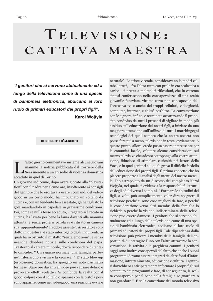 Pag. 16 TELEVISIONE: febbraio 2010 La Voce, anno III, n. 23 C A T T I VA M A E S T R A “I genitori che si servono abitualmente ed a lungo della televisione come di una specie di bambinaia elettronica, abdicano al loro ruolo di primari educatori dei propri figli”. Karol Wojtyla L DI ROBERTO D’ALBERTO ’altro giorno commentavo insieme alcune giovani mamme la notizia pubblicata dal Corriere della Sera inerente a un episodio di violenza domestica accaduto in quel di Torino. Un giovane sedicenne, dopo avere giocato alla “playstation” con il padre per alcune ore, insofferente ai consigli del genitore che lo esortava a usare i comandi del videogioco in un certo modo, ha impugnato un coltello da cucina e, con un fendente ben assestato, gli ha tagliato la gola mandandolo in ospedale in gravissime condizioni. Poi, come se nulla fosse accaduto, il ragazzo si è recato in cucina, ha lavato per bene la lama davanti alla mamma attonita, e senza proferir parola si è ritirato in camera sua, apparentemente“ freddo e assente”. Arrestato e condotto in questura, è stato interrogato dagli inquirenti, ai quali ha ricostruito il misfatto “senza emozioni”, e senza neanche chiedere notizie sulle condizioni del papà. Trasferito al carcere minorile, dovrà rispondere di tentato omicidio. “ Un ragazzo normale, una famiglia perbene”, riferiscono i vicini e la cronaca. “ E’ stato blow-up (esplosione) domestica, ha spiegato un noto psichiatra torinese. Stare ore davanti al video può causare delirio e provocare effetti epilettici. Si confonde la realtà con il gioco; colpire con il coltello o sparare con la pistola possono apparire, come nel videogioco, una reazione ovvia e naturale”. La triste vicenda, consideravano le madri caltabellottesi, - fra l’altro tutte con prole in età scolastica a carico-, si presta a molteplici riflessioni, che in estrema sintesi conferiscono nella consapevolezza di una realtà giovanile fuorviata, vittima certo non consapevole dell’eccessiva tv, e anche dei troppi cellulari, videogiochi, computer, internet, e chissà cos’altro. La conversazione con le signore, infine, è terminata accarezzando il proposito condiviso da tutti i presenti di vigilare in modo più assiduo sull’educazione dei nostri figli, a iniziare da una maggiore attenzione sull’utilizzo di tutti i marchingegni tecnologici dei quali sembra che la nostra società non possa fare più a meno, televisione in testa, ovviamente. A questo punto, allora, credo possa essere interessante per la comunità locale, valutare alcune considerazioni sul mezzo televisivo che adesso sottopongo alla vostra attenzione, fiducioso di stimolare curiosità nei lettori della Voce, e in quei genitori sui quali grava il difficile fardello dell’educazione dei propri figli. Il primo concetto che ho piacere proporre all’analisi degli utenti del nostro mensile, l’ho estrapolato da un discorso del compianto Karol Wojtyla, nel quale si evidenzia la responsabilità istruttiva degli adulti verso i bambini. “ Formare le abitudini dei figli, a volte può semplicemente voler dire spegnere il televisore perché ci sono cose migliori da fare, o perché la considerazione verso altri membri della famiglia lo richiede o perché la visione indiscriminata della televisione può essere dannosa. I genitori che si servono abitualmente ed a lungo della televisione come di una specie di bambinaia elettronica, abdicano al loro ruolo di primari educatori dei propri figli. Tale dipendenza dalla televisione può privare i membri della famiglia dell’opportunità di interagire l’uno con l’altro attraverso la conversazione, le attività e la preghiera comuni. I genitori saggi sono inoltre consapevoli del fatto che anche i buoni programmi devono essere integrati da altre fonti d’informazione, intrattenimento, educazione e cultura. I genitori dovrebbero anticipatamente informare i propri figli sul contenuto dei programmi e fare, di conseguenza, la scelta consapevole per il bene della famiglia se guardare o non guardare “. E se la concezione del mondo televisivo La Voce, anno III, n. 23 febbraio 2010 da parte di Wojtyla non poteva prescindere da una visione etica e cristiana, non deve stupire che anche le idee dei maggiori studiosi del settore, a dichiarata formazione laica, collimano con quelle esposte dal pontefice polacco. Molti sociologi hanno rilevato che i bambini si accostano alla televisione con motivazioni diverse da quelle prevalenti tra gli adulti. La maggior parte dei grandi, osserva secondo statistiche ufficiali, la tv per divertimento, i bambini invece, anche se la trovano divertente, guardano la televisione perché cercano di capire il mondo. I piccoli, pur apprezzando gli aspetti d’intrattenimento della tv, hanno certamente più difficoltà- a causa della loro limitata comprensione del mondo- a discendere i fatti dalla finzione. Sono più vulnerabili degli adulti. Secondo lo scrittore-filosofo americano John Condry, “ gli influssi primari che i bambini subiscono- la famiglia, i coetanei, la scuola, e la televisione- operano tutti insieme . I bambini non sono capaci di separare ciò che imparano in questi diversi contesti. Anzi, l’utilità dell’informazione ottenuta in uno di essi dipende in parte da ciò che s’impara dagli altri. Senza il sostegno della famiglia, gran parte di quello che succede a scuola perderebbe d’importanza. Se la scuola fosse più efficace, la televisione non sarebbe tanto potente. I coetanei esercitano il loro influsso e il loro potere nella misura in cui la famiglia e la scuola non esercitano il proprio…… La televisione è una ladra di tempo. Quando i bambini la guardano ininterrottamente per ore, non fanno molte cose che sul lungo periodo possono essere più importanti dal punto di vista del loro sviluppo. Ma non c’è solo questo; il contenuto di programmi e di pubblicità della televisione influenza profondamente atteggiamenti, credenze e azioni dei bambini. La tv 