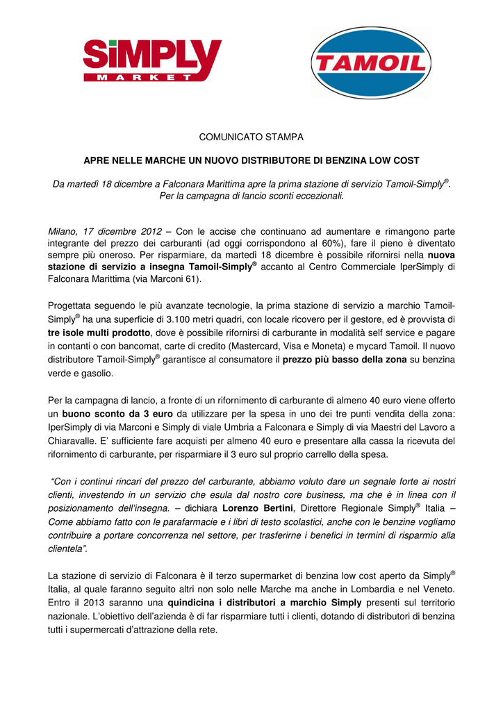COMUNICATO STAMPA APRE NELLE MARCHE UN NUOVO DISTRIBUTORE DI BENZINA LOW COST Da martedì 18 dicembre a Falconara Marittima apre la prima stazione di servizio Tamoil-Simply®. Per la campagna di lancio sconti eccezionali. Milano, 17 dicembre 2012 – Con le accise che continuano ad aumentare e rimangono parte integrante del prezzo dei carburanti (ad oggi corrispondono al 60%), fare il pieno è diventato sempre più oneroso. Per risparmiare, da martedì 18 dicembre è possibile rifornirsi nella nuova stazione di servizio a insegna Tamoil-Simply® accanto al Centro Commerciale IperSimply di Falconara Marittima (via Marconi 61). Progettata seguendo le più avanzate tecnologie, la prima stazione di servizio a marchio TamoilSimply® ha una superficie di 3.100 metri quadri, con locale ricovero per il gestore, ed è provvista di tre isole multi prodotto, dove è possibile rifornirsi di carburante in modalità self service e pagare in contanti o con bancomat, carte di credito (Mastercard, Visa e Moneta) e mycard Tamoil. Il nuovo distributore Tamoil-Simply® garantisce al consumatore il prezzo più basso della zona su benzina verde e gasolio. Per la campagna di lancio, a fronte di un rifornimento di carburante di almeno 40 euro viene offerto un buono sconto da 3 euro da utilizzare per la spesa in uno dei tre punti vendita della zona: IperSimply di via Marconi e Simply di viale Umbria a Falconara e Simply di via Maestri del Lavoro a Chiaravalle. E’ sufficiente fare acquisti per almeno 40 euro e presentare alla cassa la ricevuta del rifornimento di carburante, per risparmiare il 3 euro sul proprio carrello della spesa. “Con i continui rincari del prezzo del carburante, abbiamo voluto dare un segnale forte ai nostri clienti, investendo in un servizio che esula dal nostro core business, ma che è in linea con il posizionamento dell’insegna. – dichiara Lorenzo Bertini, Direttore Regionale Simply® Italia – Come abbiamo fatto con le parafarmacie e i libri di testo scolastici, anche con le benzine vogliamo contribuire a portare concorrenza nel settore, per trasferirne i benefici in termini di risparmio alla clientela”. La stazione di servizio di Falconara è il terzo supermarket di benzina low cost aperto da Simply® Italia, al quale faranno seguito altri non solo nelle Marche ma anche in Lombardia e nel Veneto. Entro il 2013 saranno una quindicina i distributori a marchio Simply presenti sul territorio nazionale. L’obiettivo dell’azienda è di far risparmiare tutti i clienti, dotando di distributori di benzina tutti i supermercati d’attrazione della rete.