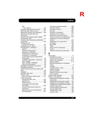 R Indice pesi pesi massimi........................................90 Rimozione della batteria del veicolo...........251 Rimozione della ruota di scorta..................277 Riparazione dei danni alla verniciatura.......240 Riparazione di piccoli danni alla verniciatura................................................240 Ripristino della velocità e della modalità accodamento (ACC)...................................127 Ripristino delle impostazioni predefinite di navigazione................................................190 Riproduzione CD riproduzione file MP3.............................212 Riscaldamento del volante...........................27 Riscaldamento e ventilazione.......................80 anteriori....................................................80 batterie del telecomando..........................85 bocchette di ventilazione..........................81 climatizzazione temporizzata....................83 comandi per il conducente........................... comandi telecomando climatizzazione temporizzata.............................................85 riscaldatore alimentato a carburante........83 sedili riscaldati.........................................82 sedili riscaldati e raffreddati.....................82 utilizzo del telecomando...........................84 Riscaldatore alimentato a carburante...........83 Riscaldatore ausiliario..................................83 Risintonizzazione automatica sistema dati radio...........................................................149 Rodaggio...................................................224 Rotazione delle ruote.................................104 Ruota di scorta...........................................277 utilizzo dei cunei di arresto ruote............277 Ruote e pneumatici allineamento delle ruote.........................291 appiattimenti..........................................266 catene da neve.......................................268 contrassegni sulle pareti degli pneumatici.............................................262 controllo delle pressioni dopo una riparazione.............................................274 degrado dovuto all'invecchiamento........267 kit di riparazione.....................................271 manutenzione degli pneumatici..............263 normative indiane...................................268 pneumatici invernali...............................267 pressioni................................................264 procedura di riparazione.........................272 riparazione di una foratura.....................271 riparazione sicura delle forature.............271 ruotino di scorta per uso temporaneo.....270 sostituzione con ruote di dimensioni normali...................................................270 sostituzione di uno pneumatico..............270 sostituzioni.............................................265 spia TPMS................................................52 TPMS.....................................................269 utilizzo del kit di riparazione...................272 valvole....................................................265 velocità nominali per gli pneumatici.......263 S Sbloccaggio.................................................17 accesso da più punti..............................5, 8 accesso da un solo punto.......................5, 8 apertura del portellone.........................9–10 apertura globale.....................................5, 8 effetti del trasmettitore sui dispositivi medici........................................................9 modalità.....................................................5 modalità entrata e uscita..........................22 piantone di sterzo.....................................27 portiera guidatore.......................................5 sistema di accesso senza chiave................8 tutte le portiere...........................................5 Scatola fusibili abitacolo............................257 Schermo a sfioramento..............................240 abbinamento dei dispositivi portatili.......158 azionamento.............................................77 collegamenti dei dispositivi portatili.......155 collegamento dei dispositivi portatili......156 collegamento di più dispositivi portatili...157 comandi audio/video..............................142 comandi doppia visualizzazione.............164 comandi lettore DVD..............................162 comandi lettore video.............................162 comandi radio........................................148 325 L Indice comandi radio DAB................................150 comandi TV............................................160 comando di climatizzazione anteriore.......80 cura dello schermo a sfioramento............77 dispositivi portatili comandi.............................................153 doppia visualizzazione............................165 eco-data.................................................100 feedback dei tasti.....................................77 funzioni extra............................................79 impostazione............................................77 impostazioni di sistema............................77 impostazioni schermo..............................77 informazioni sul consumo di carburante..............................................100 menu info 4x4........................................137 menu principale........................................76 modalità Valet..........................................78 orologio....................................................77 preselezioni volume..................................77 riproduzione dei dispositivi portatili.......157 riscaldatore alimentato a carburante........83 scelte rapide.............................................77 sedili riscaldati.........................................82 sedili riscaldati e raffreddati.....................82 selezione lingua........................................77 sostituzione del dispositivo portatile......159 telecamere surround.............