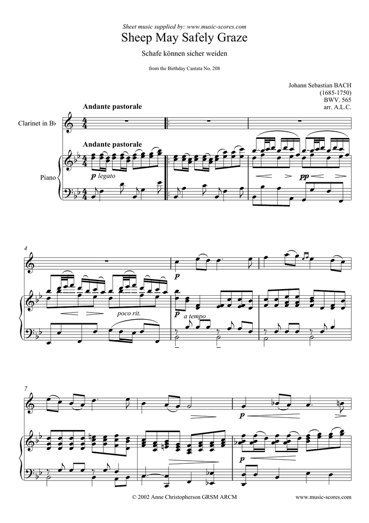 Sheet music supplied by: www.music-scores.com Sheep May Safely Graze Schafe können sicher weiden from the Birthday Cantata No. 208 Andante pastorale Clarinet in Bb Johann Sebastian BACH (1685-1750) BWV. 565 arr. A.L.C. Andante pastorale Piano p legato 4 pp p p p poco rit. a tempo 7 © 2002 Anne Christopherson GRSM ARCM p www.music-scores.com 2 10 mp p 13 poco rit. p legato pp p poco rit. 19 espr. p 16 p mp www.music-scores.com poco rit.