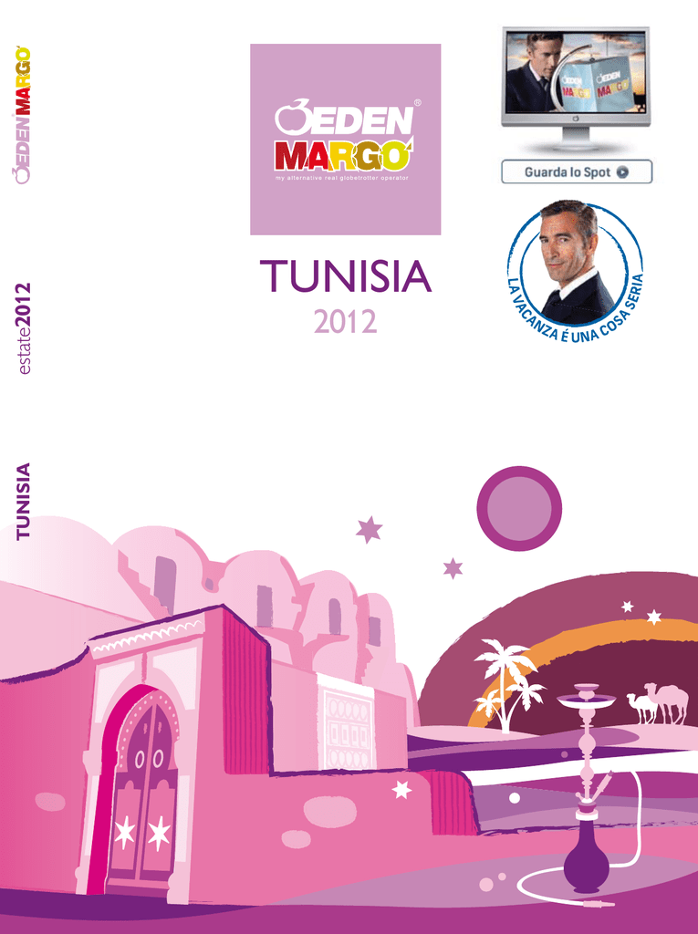 TUNISIA estate2012 TUNISIA 2012 “Dobbiamo andare e non fermarci finché non siamo arrivati” “Dove andiamo?” “Non lo so, ma dobbiamo andare”. Jack Kerouac – On the road – 1957 Con Margò continua un cammino iniziato tanto tempo fa. In 40 anni di esperienza abbiamo diretto hotel e alberghi; abbiamo fondato un tour operator pensando ai viaggi per studenti; abbiamo organizzato vacanze balneari in tutto il mondo per migliaia di persone; oggi i nostri villaggi portano l’ospitalità italiana nelle più prestigiose destinazioni internazionali. Con Margò ricominciamo a creare viaggi aperti, a misura di giramondo. Viaggi per chi sente il bisogno di muoversi libero. Abbiamo da sempre l’obiettivo preciso di dare risposta ad ogni esigenza di viaggio. Con Margò continuiamo sulla nostra strada. Ogni viaggio è un’emozione; noi siamo gli esperti in emozioni. Nardo Filippetti deserto del sahara sousse sommario La filosofia di Margò 12 DJERBA E ZARZIS 40 Margò e i suoi vantaggi 13 Zarzis 42 Piano voli 15 Djerba 46 TABARKA 16 Prenota Sicuro 56 Tabarka 18 Prenota Sicuro Plus 58 Informazioni utili 60 HAMMAMET, SOUSSE E MAHDIA 22 Notizie utili 61 Hammamet 24 Condizioni generali 62 Nabeul 30 Sousse 32 Skanes 34 Mahdia 38 chi siamo In quasi trent’anni di evoluzione, Eden Viaggi è diventato uno dei principali tour operator italiani. Oggi, all’interno del gruppo, convivono più filosofie di ospitalità che condividono la stessa missione di offrire sicurezza e assistenza ad ogni esperienza di viaggio. Eden Viaggi propone più di 40 cataloghi di soluzioni per viaggi individuali, di gruppo e incentive su più di 3.000 strutture ricettive. Le persone che dal 1983 ci hanno scelto sono più di 7.000.000, di cui 500.000 nell’ultimo anno. “La nostra passione cresce, giorno dopo giorno, e con il supporto degli agenti di viaggio, io e i miei collaboratori ci impegniamo in prima persona per garantire la vostra serenità, prima, durante e dopo la vostra vacanza”. Nardo Filippetti Presidente e Fondatore Eden Viaggi i nostri marchi Eden Viaggi propone linee di prodotto adatte a rispondere alle esigenze di tutti: le famiglie che amano le vacanze all’italiana, gli amanti della libertà totale che ricercano soluzioni convenienti, i grandi viaggiatori, desiderosi di mete lontane e servizi esclusivi. EDEN VILLAGE Gli Eden Village sono villaggi club situati nelle mete più attraenti del mondo. A garantire la totale serenità delle vostre vacanze, l’eccellente qualità dei servizi Eden Viaggi: ambienti accoglienti, trattamento all inclusive, attività di animazione, attrezzature sportive o per il benessere, cucina italiana, mini e junior club per bambini e ragazzi con personale italiano serio e affidabile. Scegliere un Eden Village per la propria vacanza significa scegliere di vivere un’esperienza Eden Viaggi a 360°. GOLD international club SPECIAL EDEN GOLD INTERNATIONAL CLUB Gli Eden Gold International Club sono club presenti nelle destinazioni di vacanza più ambite, in esclusiva Eden per il mercato Italiano. Eden Viaggi li sceglie per la posizione e per la qualità dei loro servizi: sono i villaggi più amati dalla clientela internazionale. In ogni Eden Gold sono presenti cucina e animazione internazionale e i nostri assistenti italiani residenti sempre a vostra disposizione. In tutti i villaggi dove è segnalata la FORMULA VILLAGE sono presenti anche animatori Eden FORMULA VILLAGE Viaggi e uno chef italiano che collaborano con gli staff internazionali. EDEN SPECIAL Gli Eden Special possono essere hotel, resort, appartamenti, tour, safari, navi da crociera o villaggi club: la tipologia di prodotto è sempre indicata nel logo. Selezioniamo ognuno di questi prodotti e ve li proponiamo, prestando sempre particolare attenzione al rapporto qualità-prezzo, alla location e all’affidabilità dei servizi. WHITE SELECTION White Selection è sinonimo di atmosfera unica. Un marchio riservato ai resort Eden Viaggi che offrono una miscela sorprendente di bellezza delle location e raffinatezza degli ambienti. In tutti i club e hotel White Selection, ogni elemento della vacanza esprime fascino e armonia: l’equilibrio degli spazi, il comfort dei servizi, la discrezione dello staff. White Selection non è un marchio legato al tipo di ospitalità, né al trattamento offerto. maya bay, thailandia la vacanza che conviene il viaggio su misura la catena alberghiera MARGÒ Margò è la linea di prodotto dedicata ai globetrotter che vogliono viaggiare senza fronzoli e sentirsi sempre liberi. I cataloghi Margò sono il giusto mix tra una guida turistica e una riserva inesauribile di nuove idee per scoprire in modo alternativo le mete turistiche più affascinanti del mondo: dagli eco-resort africani alle posadas caraibiche; dai camping village in Italia fino ai bed&breakfast più “cool” del Mediterraneo; senza dimenticare bike tour, island hopping e pacchetti per i surfer... Gli innamorati di Margò sono cittadini del mondo sempre in cerca di un’esperienza di viaggio mai provata ad un prezzo intelligente. EDEN MADE Eden Made è la linea di prodotto dedicata ai viaggiatori che ricercano esperienze di viaggio costruite su misura e servizi di alta qualità. Gli esperti Eden Made sono un gruppo di grandi artigiani che disegnano esperienze di viaggio speciali: un artigiano sceglie i materiali e gli strumenti migliori per realizzare ogni volta un piccolo capolavoro, così come gli esperti Eden Made trovano sempre gli ingredienti giusti per garantire la soddisfazione dei grandi viaggiatori. Le destinazioni Eden Made sono l’Oriente, le Americhe, gli Emirati, l’Africa profonda: la linea Eden Made non conosce confini, orizzonti nè limiti. Chi sceglie Eden Made è un viaggiatore cosmopolita alla ricerca di nuove mete e servizi esclusivi. EDEN HOTELS & RESORTS Eden Hotels & Resorts è la catena alberghiera che racchiude tutti gli hotel e i villaggi gestiti direttamente da Eden Viaggi. Include strutture appart