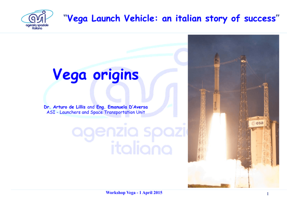 “Vega Launch Vehicle: an italian story of success” Vega origins Dr. Arturo de Lillis and Eng. Emanuela D’Aversa ASI - Launchers and Space Transportation Unit Workshop Vega - 1 April 2015 1 Vega origins 1964: San Marco I the first Italian satellite 1964 Wallops Island USA 1967 S. Marco sea-platform - Kenya Workshop Vega - 1 April 2015 2 Vega origins the Scout LV has been the first multi-stage rocket equipped with all stages with SRM’s. 4 stages LV (Algol, Castor, Antares and Altair), 25,00 mt and 1 mt diameter, capable to launch in LEO P/L from 80 to 210 kg the ASI study contract for the Scout LV « italianization » Workshop Vega - 1 April 2015 3 Vega origins 1992 - SXB3 1998 – Zefiro-16 Workshop Vega - 1 April 2015 4 Vega origins from the classic booster to a new product: Zefiro-16 SRM Technological innovations STRUCTURES from Metallic to Carbon Fiber composite CASTING from single body to demontable mandrel NOZZLE from fix canted to movable flexible joint Workshop Vega - 1 April 2015 5 Vega origins Zefiro-16 Development & Qualification DM1 – June 1998 DM2 – June 1999 QM1 – December 2000 Workshop Vega - 1 April 2015 Pagina 6 Vega origins towards a new LV concept: Vega K0 Starting in 1997, ASI promoted the study of a new vehicle configuration, VEGA K. 450 kg @PEO 1200km 1500 kg @PEO 700km 700 kg @ SSO 1200km Kzero-L Step 1 Step 2 4° stage LPM AVUM Avum 3° stage L6 (RD861) P7 Zefiro 7 2° stage Zefiro 16 Zefiro 16 Zefiro 23 1° stage Zefiro 16 P85 (MPS-A5) P80 FW 1998: start of the ESA programme Vega Small Launcher Step 1 A Joint Venture Company (Vegaspazio) has been constituted between FiatAvio and Aerospatiale to be the Prime Contractor of the ESA step 1 development contract. 2000: Step 2 approval Workshop Vega - 1 April 2015 Pagina 7 Vega origins Workshop Vega - 1 April 2015 8