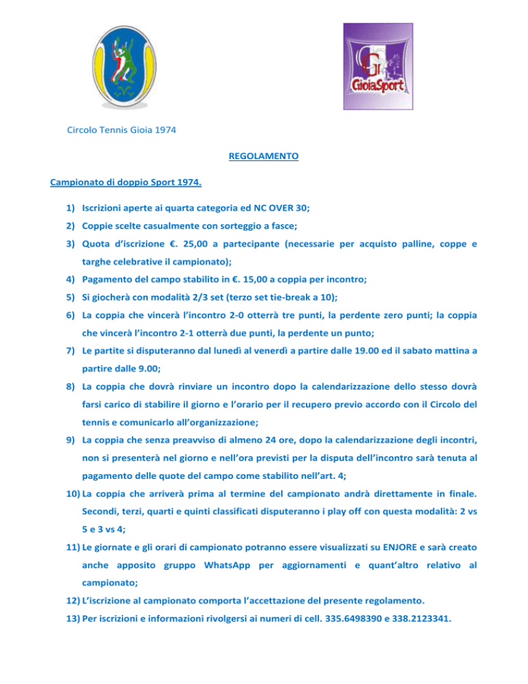 Circolo Tennis Gioia 1974 REGOLAMENTO Campionato di doppio Sport 1974. 1) Iscrizioni aperte ai quarta categoria ed NC OVER 30; 2) Coppie scelte casualmente con sorteggio a fasce; 3) Quota d’iscrizione €. 25,00 a partecipante (necessarie per acquisto palline, coppe e targhe celebrative il campionato); 4) Pagamento del campo stabilito in €. 15,00 a coppia per incontro; 5) Si giocherà con modalità 2/3 set (terzo set tie-break a 10); 6) La coppia che vincerà l’incontro 2-0 otterrà tre punti, la perdente zero punti; la coppia che vincerà l’incontro 2-1 otterrà due punti, la perdente un punto; 7) Le partite si disputeranno dal lunedì al venerdì a partire dalle 19.00 ed il sabato mattina a partire dalle 9.00; 8) La coppia che dovrà rinviare un incontro dopo la calendarizzazione dello stesso dovrà farsi carico di stabilire il giorno e l’orario per il recupero previo accordo con il Circolo del tennis e comunicarlo all’organizzazione; 9) La coppia che senza preavviso di almeno 24 ore, dopo la calendarizzazione degli incontri, non si presenterà nel giorno e nell’ora previsti per la disputa dell’incontro sarà tenuta al pagamento delle quote del campo come stabilito nell’art. 4; 10) La coppia che arriverà prima al termine del campionato andrà direttamente in finale. Secondi, terzi, quarti e quinti classificati disputeranno i play off con questa modalità: 2 vs 5 e 3 vs 4; 11) Le giornate e gli orari di campionato potranno essere visualizzati su ENJORE e sarà creato anche apposito gruppo WhatsApp per aggiornamenti e quant’altro relativo al campionato; 12) L’iscrizione al campionato comporta l’accettazione del presente regolamento. 13) Per iscrizioni e informazioni rivolgersi ai numeri di cell. 335.6498390 e 338.2123341.