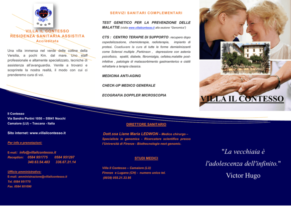 S ER V IZ I S AN IT AR I C O M PLEM ENT AR I TEST GENETICO PER LA PREVENZIONE DELLE MALATTIE (visita www.villailcontesso.it alla sezione “Genomica”) VILL A IL CONTESSO RESI DENZ A S ANI TARI A ASSISTI TA Ac c r e dit at a CTS : CENTRO TERAPIE DI SUPPORTO : recupero dopo ospedalizzazione, chemioterapie, radioterapia, impianto di protesi. Coadiuvare la cura di tutte le forme demielinizzanti Una villa immersa nel verde delle colline della Versilia, a pochi Km. dal mare. Uno staff professionale e altamente specializzato, tecniche di assistenza all’avanguardia. Venite a trovarci e scoprirete la nostra realtà, il modo con cui ci prenderemo cura di voi. come Sclerosi multiple ,Parkinson , depressione con astenia psicofisico, epatiti, diabete, fibromialgia, cefalea,malattie postinfettive , patologie di malassorbimento gastroenterico e cistiti refrattarie a terapia classica. MEDICINA ANTI-AGING Contatti: CHECK-UP MEDICO GENERALE Villa i ECOGRAFIA DOPPLER MICROSCOPIA VILLA IL CONTESSO Il Contesso Via Sandro Pertini 1050 – 55041 Nocchi Camaiore (LU) – Toscana - Italia Sito internet: www.villailcontesso.it DIRETTORE SANITARIO Dott.ssa Liane Maria LEDWON – Medico chirurgo – Specialista in genomica - Ricercatore scientifico presso Per info e prenotazioni: l’Università di Firenze - Biothecnologie next genomic. "La vecchiaia è E-mail: [email protected] Reception: 0584 951775 340.63.54.483 0584 951297 336.67.21.14 STUDI MEDICI Villa Il Contesso – Camaiore (LU) Ufficio amministrativo: Firenze e Lugano (CH) - numero unico tel. E-mail: [email protected] (0039) 055.21.33.95 l'adolescenza dell'infinito." Victor Hugo Tel. 0584 951775 Fax. 0584 951090 www.villailcontesso.it Quando una casa di cura offre molto più della semplice assistenza Il segreto della cura del paziente è averne cura… I N O ST RI S E R VIZ I ASSISTENZA SANITARIA Offriamo ai nostri ospiti il presidio infermieristico e socio-sanitario 24 RS A - R es id enz a S a nit ar ia A s si st ita VILLA IL CONTESSO Tre piani, serviti da ascensore, dedicati alla cura dei nostri ospiti. Piano terra dotato di infermeria, sala riunioni, sala ludica, sala da pranzo per “ M IS SIO N AZ I E ND AL E ” persone non autosufficienti e ampio spazio dedicato alle visite dei T R AS F O R M AR E L A F R AG I L I T A’ I N R I S O R S A familiari. Nel accoglienza nuovo edificio sono situati l’elegante reception che dà ai visitatori e i familiari, l’ampio salone dedicato Villa il Contesso pone al centro della sua attività all’intrattenimento, la palestra attrezzata per la riabilitazione, due l’anziano ed il suo benessere. ambulatori e numerosi servizi igienici. Il piano superiore accoglie le “Invecchiare è oggi un privilegio e una meta della camere, una seconda infermeria, uno spazio dedicato alla sanificazione società, ma è anche una sfida”. Ad affermarlo è l’Organizzazione Mondiale della Sanità e a confermarlo sono gli anni di esperienza e di lavoro sul campo con gli ospiti della nostra struttura. Proprio da questo presupposto prende vita la “mission” di Villa il Contesso: sostenere colui che diviene “soggetto fragile” ed una sala relax. Ogni piano ospita camere climatizzate e dotate di bagni ad uso personale, arredate secondo i parametri sanitari, ma con ogni comfort e seguendo uno stile casalingo che faccia sentire i pazienti a casa propria. Una zona relax accoglie gli ospiti di ciascun piano stimolandoli alla lettura e alla conversazione. La struttura è provvista di una vasca disabili e di un bagno assistito per la cura dell’igiene. accompagnandolo in questa importante fase della vita. “ L A C AST AG N I N A” Un sostegno che deve essere, prima che sanitario, Realizzata nel 2007, è un complesso immobiliare annesso alla Villa, psicologico e affettivo. costituito da Un progetto in cui crediamo e ospitare coppie di anziani in cui credono le centinaia di soggiornare nella RSA, in mini appartamenti autonomi e indipendenti, pur famiglie che negli anni hanno usufruendo di tutti i servizi della RSA. scelto la nostra struttura e ci IL P AR CO D EL L E C AM ELIE nostra attività, sono destinati alla ricerca scientifica sul genoma, per prevenire le malattie ed invecchiare sereni. autosufficienti o coloro che non intendono Un ettaro di verde, di piante secolari e percorsi dedicati alle passeggiate, hanno affidato i loro cari. Per questo, i proventi della appartamenti nuovi, arredati e funzionali, consente di uno spazio per pranzare e trascorrere le giornate con numerose fontane che rendono il parco di Villa il Contesso un vero e proprio fiore all’occhiello. ore su 24 e la disponibilità di un medico. Allo scopo di fornire risposte diversificate rispetto ai bisogni dei singoli utenti e dei loro familiari, abbiamo previsto la possibiltà di elaborare piani terapeutici personalizzati, interventi psicologici di supporto e attività fisioterapica e massofisioterapica di gruppo e individuale. LA CUCINA Villa il Contesso è dotata di un cucina professionale al cui interno opera personale altamente specializzato. Lo staff medico elabora per gli ospiti diete ad hoc, personalizzate e pensate per accrescere il benessere dei pazienti. Due ampi ed eleganti sale da pranzo per la colazione, il pranzo, la merenda e la cena. ATTIVITA’ LUDICHE Animazione, Sala TV e Musica , palestra. sala relax e tisaneria, telefono, Internet, Wi-Fi . Un animatore professionista si occupa dell’intrattenimento. Niente è lasciato al caso: ai momenti di svago si alternano attività pratiche. Attraverso la relizzazione di piccoli progetti, l’anziano ha l’opportunità di mettersi continuamente in gioco, riscoprendo il fascino dell’impegno e della forza di volontà. Lavanderia, sanificazione ed igiene completano la gamma dei servizi. LE NO ST R E T AR IF F E * Villa il Contesso applica tariffe diversificate a seconda del bisogno di assistenza dell’ospite: Soggetti autosufficienti: quota giornaliera pari a € 80. Soggetti semi autosufficien