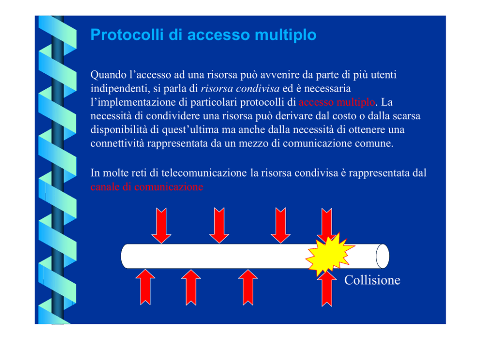 Protocolli di accesso multiplo Quando l’accesso ad una risorsa può avvenire da parte di più utenti indipendenti, si parla di risorsa condivisa ed è necessaria l’implementazione di particolari protocolli di accesso multiplo. La necessità di condividere una risorsa può derivare dal costo o dalla scarsa disponibilità di quest’ultima ma anche dalla necessità di ottenere una connettività rappresentata da un mezzo di comunicazione comune. In molte reti di telecomunicazione la risorsa condivisa è rappresentata dal canale di comunicazione Collisione Esempi Interferenza B0 Ballablal ?????? Bla bla B0 Bla bla Bla bla B1 Bla bla Bla bla B2 Bla bla Esempi Collisione ?????? ?????? Metodi di accesso multiplo senza contesa Accesso multiplo a divisione di tempo (TDMA: Time Division Multiple Access) Nel protocollo TDMA, l’asse temporale è suddiviso in frames di durata fissata e a loro volta suddivisi in un numero fisso di intervalli più piccoli denominati slots. Ogni slot in una particolare posizione all’interno del frame è assegnato ad un utente. Ciascun utente, può quindi trasmettere per un periodo di tempo pari ad uno slot ad intervalli pari alla durata di un frame, in questo tempo, esso ha a disposizione tutta la banda del sistema. TDMA Le varie stazioni che La trama può essere suddivisa in due parti che accedono al servono per la trasmissione nei due sensi (TDD: Time Division Multiplex) oppure si possono canale devono utilizzare due bande diverse per i due sensi della essere trasmissione (FDD: Frequency Division Multiplex) sincronizzate slot Trama (frame) TEMPO Utente 1 Utente 1 Utente 2 Utente 2 Utente 3 Utente 3 Esempio: GSM durata frame: 4.62 ms durata slot: 0.577 ms n° slot/frame = 8 Accesso multiplo a divisione di frequenza (FDMA: Frequency Division Multiple Access) La tecnica FDMA prevede la suddivisione della banda disponibile in un certo numero di sottobande uguali ognuna centrata intorno ad una frequenza che identifica il canale. Ciascuna sottobanda è concessa ad un solo utente che ne detiene il controllo per tutta la durata della connessione. Si utilizzano bande diverse per i due sensi della comunicazione. Non è richiesta la sincronizzazione fra le varie stazioni. FDMA Banda del sistema FREQUENZA f1 f2 f2 f3 f4 f5 f6 Banda per utente Utente 1 Utente 4 Utente 2 Utente 5 Utente 3 Utente 6 Per i due sensi della comunicazione vengono solitamente utilizzate bande diverse (FDD) Polling 2 1 Tocca a te, puoi trasmettere (pacchetto di poll) 3 4 Controllore centrale che abilita ciclicamente gli utenti alla trasmissione Trasmissione da 1 a 5 quando 1 è abilitato alla trasmissione 5 6 La tecnica di polling è di tipo centralizzato, essa prevede infatti una stazione primaria che gestisce l’accesso al canale comune da parte delle altre stazioni (secondarie). La stazione primaria effettua l’interrogazione di ogni stazione secondaria (SS) secondo una sequenza predefinita di polling, indipendentemente dal fatto che le SS abbiano o meno qualcosa da trasmettere Tecniche di passaggio del testimone (Token passing) Come abbiamo visto, gli algoritmi di polling necessitano di una stazione primaria che gestisce il protocollo. L’idea base dell’algoritmo di polling può essere estesa anche al caso in cui vi siano N stazioni di pari importanza, senza la necessaria presenza di una stazione primaria. Nel protocollo Token Passing, le N stazioni sono disposte secondo un ordine logico ad anello (ring), non necessariamente coincidente con quello fisico, ed ognuna ha un preciso indirizzo. Ogni stazione conosce l’indirizzo della successiva e della precedente, secondo l’ordine logico. Una stazione può accedere al canale solo quando riceve un particolare pacchetto detto token dalla stazione che la precede; se ha un pacchetto da trasmettere, vi appenderà l’indirizzo della stazione destinataria e lo immetterà sul canale comune. La stazione che riconosce il proprio indirizzo catturerà il pacchetto. Quando una stazione termina i dati da trasmettere o dopo un certo tempo massimo, invia il token alla stazione successiva e così via. Tecniche di passaggio del testimone A è abilitato a trasmettere (ha il (Token passing) token), trasmette a B ed aspetta che il pacchetto percorra tutto l’anello poi cede il testimone A token A B C D G F E B Metodi di accesso multiplo con contesa Le tecniche di accesso multiplo a contesa, non prevedono nessuna gestione, centralizzata o distribuita, dell’accesso al canale da parte delle stazioni ad esso connesse. Nel caso più generale, quando una stazione ha dei dati da trasmettere accede immediatamente al canale senza preoccuparsi se questo è già occupato, rendendo così molto alta la probabilità di una collisione. In altri casi, la stazione “ascolta il canale” prima di trasmettere e se lo rivela occupato, ritarda la trasmissione. Aloha Ogni stazione inizia la trasmissione non appena ha dei pacchetti da trasmettere, senza considerare in nessun modo le condizioni di occupato/libero del canale. satellite Collisione Aloha Dal momento che ogni stazione ignora completamente tutte le altre, un pacchetto subirà una collisione se la sua trasmissione si sovrapporrà tutta o in parte a quella di un altro pacchetto. T Intervallo di tempo in cui si può avere una collisione=2T t0 T0+2T Se avviene una collisione il ricevitore non invierà nessun riscontro positivo (ACK) al trasmettitore Aloha collisione Nessun ACK Attesa ACK per un tempo di andata e ritorno ??????? La stazione riprogramma una nuova trasmissione del pacchetto dopo un tempo casuale fra 0 e un valore massimo Tmax (tempo di back off) in modo da evitare ridurre la probabilità che due stazioni che hanno colliso collidano di nuovo Aloha slotted Per migliorare le caratteristiche dell’ Aloha si può pensare di dividere il tempo in time-slot di lunghezza pari al tempo che occorre per trasmettere un pacchetto. Una stazione che ha un pacchetto da trasmettere dovrà attendere l’inizio dello slot succ