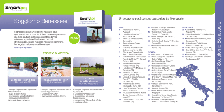 N°1 nei cofanetti regalo Sognate di passare un soggiorno rilassante dove qualcuno si prenda cura di voi? Dopo una notte passata in una delle strutture selezionate, potrete godervi la colazione, la piscina ed i trattamenti proposti: idromassaggio, sauna, massaggi rilassanti e rigeneranti. Immergetevi nell'universo del benessere! 189,90€ Valido per 2 persone ESEMPIO DI ATTIVITÀ La Melosa Resort & Spa (Roccastrada GR) L'Assegno Regalo da diritto a: pacchetto “Relax Profumato” - bagno di vapore (15min) - idromassaggio aromatizzato (20min) - massaggio orientale (30min) Valido per le donne e gli uomini. Villa La Borghetta Resort (Figline Valdarno, FI) L'Assegno Regalo da diritto a:una notte in camera doppia “Charme” > una colazione “Buffet” > due massaggi antistress (30min). Le Théâtre de la Renaissance (10e arrondissement) L'Assegno Regalo da diritto a:una notte in “Junior Suite” > una colazione “Tradizionale” > libero accesso alla piscina talassoterapica > un massaggio “Fitness Spa” (40min) > una tisana offerta. NORD 1 • Residence Lo Peyo***, Ayas (AO) 2 • Hotel Roma Imperiale****, Acqui Terme (AL) 3 • Relais Cà San Sebastiano, Camino (AL) 4 • Cascina Langa, Trezzo Tinella (CN) 5 • Hotel Villa delle Ortensie****, S. Omobomo Terme (BG) 6 • Rizzi Acqua Charme Hotel & Spa****, Boario Terme (BS) 7 • Hotel Parco San Marco Beach Resort Golf & Spa****, Cima di Porlezza (CO) 8 • Hotel Relais Orsingher****, Fiera di Primiero (TN) 9 • Hotel Spinale****, Madonna di Campiglio (TN) 10 • Hotel Villa di Campo****, Campo Lomaso (TN) 11 • Locanda al Castello Wellness Resort**** , Cividale del Friuli (UD) 12 • Hotel Bellavista Terme, Montegrotto Terme (PD) 13 • Hotel Terme Mioni Pezzato****, Abano Terme (PD) 14 • Ai Cadelach Ristorante Hotel & Centro Benessere, Revine Lago (TV) 15 • CastelBrando****, Cison di Valmarino (TV) 16 • Vergilius Hotel Spa & Business Resort****, Creazzo (VI) 17 • Grand Hotel Pigna Antiche Terme****S, Pigna (IM) 18 • Hotel Shelley e delle Palme***, Lerici (SP) 19 • Helvetia Spa & Beauty****, Porretta Terme (BO) 20 • Relais Villa Fontanorio & Spa Julia, Parma (PR) CENTRO 21 • Villa Aurea****, Cortona (AR) 22 • Villa La Borghetta Resort****S, Figline Valdarno (FI) 23 • La Melosa Resort & Spa****, Roccastrada (GR) 24 • Relais delle Picchiaie****, Porto Ferraio Isola d’Elba (LI) 25 • Antico Albergo Terme***, Bagni di Lucca (LU) 26 • Grand Hotel Michelacci Maison D’O Spa**** , Gabicce Mare (PU) 27 • Colleverde Country House, Urbino (PU) 28 • Abbazia San Pietro in Valle, Ferentillo (TR) 29 • Inncasa, Orvieto (TR) 30 • Hotel Ambasciatori Spa & Golf****, Fiuggi (FR) 31 • Grand Hotel Terme Salus Pianeta Benessere****, Viterbo (VT) 32 • Romantik Hotel Sporting Villa Maria****, Francavilla al Mare (CH) SUD E ISOLE 33 • Grand Hotel Parker’s*****L, Napoli (NA) 34 • Hotel Scapolatiello****, Badia di Cava de’Tirreni (SA) 35 • Hotel Residence Tramonto, Rodi Garganico (FG) 36 • Il Giardino dei Pini Wellness Resort****, Felline (LE) 37 • Hotel Tritone Lipari*****, Lipari (ME) 38 • Grand Hotel delle Terme****, Termini Imerese (PA) 39 • TarthesHotel****, Guspini (VS) 40 • Sardegna Grand Hotel Terme****, Fordongianus (OR) 7 9 8 10 6 21 5 1 ® Soggiorno Benessere 11 15 14 16 2 3 13 12 20 4 7 19 18 17 26 25 22 24 21 Smartbox Soggiorno Benessere Un soggiorno per 2 persone da scegliere tra 40 proposte 27 23 28 29 32 31 35 30 33 34 36 40 39 84 37 38