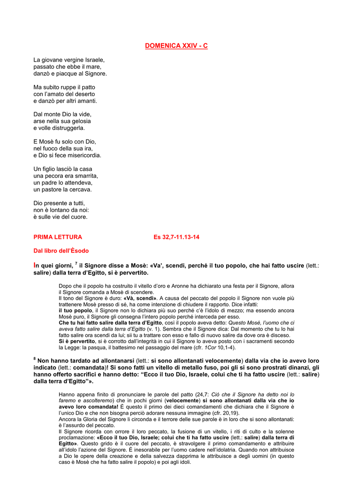 DOMENICA XXIV - C La giovane vergine Israele, passato che ebbe il mare, danzò e piacque al Signore. Ma subito ruppe il patto con l’amato del deserto e danzò per altri amanti. Dal monte Dio la vide, arse nella sua gelosia e volle distruggerla. E Mosè fu solo con Dio, nel fuoco della sua ira, e Dio si fece misericordia. Un figlio lasciò la casa una pecora era smarrita, un padre lo attendeva, un pastore la cercava. Dio presente a tutti, non è lontano da noi: è sulle vie del cuore. PRIMA LETTURA Es 32,7-11.13-14 Dal libro dell’Èsodo In quei giorni, 7 il Signore disse a Mosè: «Va’, scendi, perché il tuo popolo, che hai fatto uscire (lett.: salire) dalla terra d’Egitto, si è pervertito. Dopo che il popolo ha costruito il vitello d’oro e Aronne ha dichiarato una festa per il Signore, allora il Signore comanda a Mosè di scendere. Il tono del Signore è duro: «Và, scendi». A causa del peccato del popolo il Signore non vuole più trattenere Mosè presso di sé, ha come intenzione di chiudere il rapporto. Dice infatti: il tuo popolo, il Signore non lo dichiara più suo perché c’è l’idolo di mezzo; ma essendo ancora Mosè puro, il Signore gli consegna l’intero popolo perché interceda per esso. Che tu hai fatto salire dalla terra d’Egitto, così il popolo aveva detto: Questo Mosè, l’uomo che ci aveva fatto salire dalla terra d’Egitto (v. 1). Sembra che il Signore dica: Dal momento che tu lo hai fatto salire ora scendi da lui; sii tu a trattare con esso e fallo di nuovo salire da dove ora è disceso. Si è pervertito, si è corrotto dall’integrità in cui il Signore lo aveva posto con i sacramenti secondo la Legge: la pasqua, il battesimo nel passaggio del mare (cfr. 1Cor 10,1-4). 8 Non hanno tardato ad allontanarsi (lett.: si sono allontanati velocemente) dalla via che io avevo loro indicato (lett.: comandata)! Si sono fatti un vitello di metallo fuso, poi gli si sono prostrati dinanzi, gli hanno offerto sacrifici e hanno detto: “Ecco il tuo Dio, Israele, colui che ti ha fatto uscire (lett.: salire) dalla terra d’Egitto”». Hanno appena finito di pronunciare le parole del patto (24,7: Ciò che il Signore ha detto noi lo faremo e ascolteremo) che in pochi giorni (velocemente) si sono allontanati dalla via che io avevo loro comandata! È questo il primo dei dieci comandamenti che dichiara che il Signore è l’unico Dio e che non bisogna perciò adorare nessuna immagine (cfr. 20,19). Ancora la Gloria del Signore li circonda e il terrore delle sue parole è in loro che si sono allontanati: è l’assurdo del peccato. Il Signore ricorda con orrore il loro peccato, la fusione di un vitello, i riti di culto e la solenne proclamazione: «Ecco il tuo Dio, Israele; colui che ti ha fatto uscire (lett.: salire) dalla terra di Egitto». Questo grido è il cuore del peccato, è stravolgere il primo comandamento e attribuire all’idolo l’azione del Signore. È inesorabile per l’uomo cadere nell’idolatria. Quando non attribuisce a Dio le opere della creazione e della salvezza dapprima le attribuisce a degli uomini (in questo caso è Mosè che ha fatto salire il popolo) e poi agli idoli. 9 Il Signore disse inoltre a Mosè: «Ho osservato questo popolo: ecco, è un popolo dalla dura cervìce. Dopo la dura rivelazione del peccato del popolo, Mosè tacque, non aveva parole. Per questo il Signore riprese a parlare a Mosè. Egli comunica a Mosè quanto ha osservato di questo popolo, che ormai non gli appartiene più e quindi usa un tono distaccato con un accento di disprezzo. Infatti il Signore lo definisce: un popolo dalla dura cervice. È di dura cervice, come un animale da soma che rifiuta il basto, cioè egli rifiuta di prendere su di sé la legge del Signore; il popolo dice sì con le labbra ma non ne vuol sapere di sottomettersi a quanto il Signore comanda (cfr. Mt 15,7-9). 10 Ora lascia che la mia ira si accenda contro di loro e li divori. Di te invece farò una grande nazione». Ora lascia, che cosa significa lasciami se non offrire la possibilità della supplica? (s. Gregorio M.). È come se il Signore dicesse: Impediscimi (Teodoreto). Allo stesso modo Egli aveva cercato in Abramo uno che intercedesse per Sodoma. La sentenza di Dio è spezzata dalla preghiera dei santi (s. Girolamo). Per mettere alla prova Mosè, Il Signore gli promette di fare di lui una grande nazione, che, anziché prendere il nome dai patriarchi, prenderà da lui il suo nome. 11 Mosè allora supplicò il Signore, suo Dio, e disse: «Perché, Signore, si accenderà la tua ira contro il tuo popolo, che hai fatto uscire dalla terra d’Egitto con grande forza e con mano potente? Mosè non accetta la proposta del Signore e gli ricorda: a) che questo popolo, dal Signore disprezzato, è suo e non è di Mosè. Quindi il Signore non se ne può disfare; bisogna che se lo tenga, anche se esso è di dura cervice. b) che è Lui, non Mosè, ad averlo fatto uscire dall’Egitto con grande forza e con mano potente. Il Signore non può dimenticare quello che ha fatto e cancellarlo come se non lo avesse compiuto. Se grande fu la sua forza nel liberare il suo popolo dalla schiavitù egiziana, più grande sarà la sua forza e più potente la sua mano nello strapparlo dall’idolatria. Mosè invita il Signore a compiere ancora una nuova e più profonda liberazione, quella dalla schiavitù del peccato, che si esprime nell’idolatria. Mosè lo sa bene che il popolo è di dura cervice e perciò vuole trattenere l’ira divina e volgerla in misericordia in virtù di Colui che ora sta condannando Israele ma che presto scenderà Lui stesso per liberare il suo popolo. Se il popolo è sterminato manca la continuità; si spezza il rapporto tra i segni operati in Egitto e il loro compimento. 12 Perché dovranno dire gli Egiziani: “Con malizia li ha fatti uscire, per farli perire tra le montagne e farli sparire dalla terra”? Desisti dall’ardore della tua ira e abbandona il proposito di fare del male al tuo pop