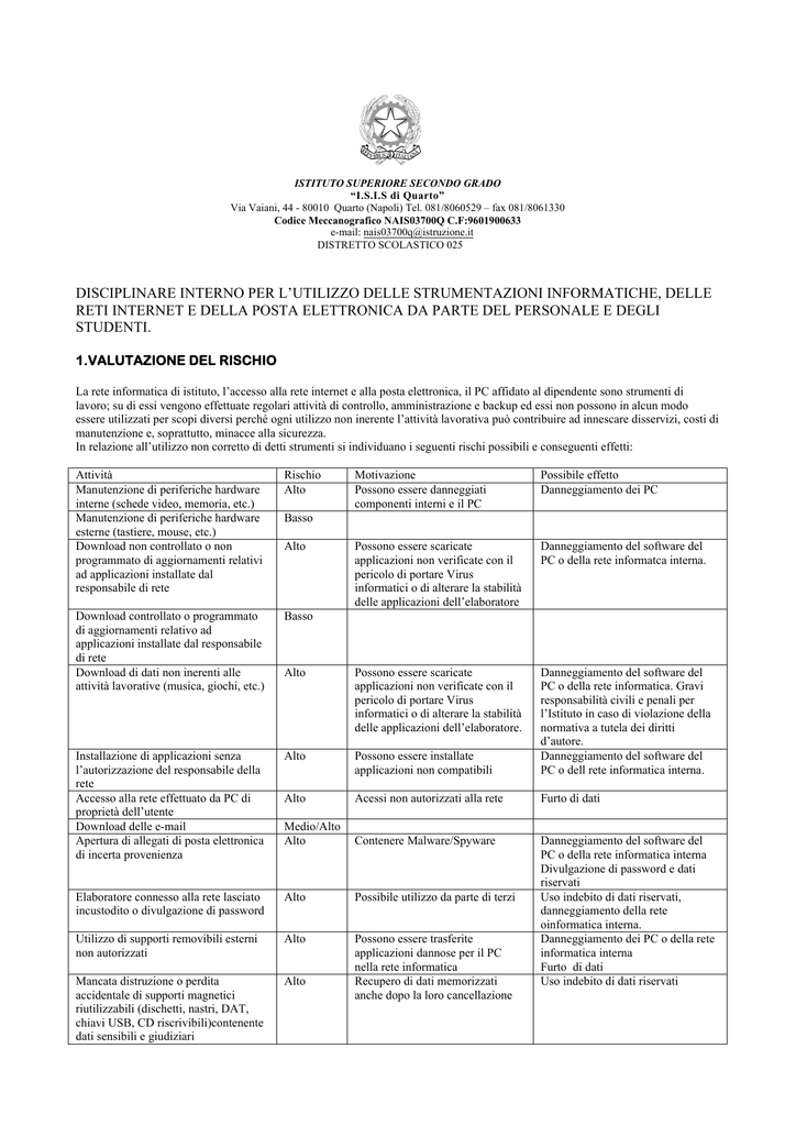 ISTITUTO SUPERIORE SECONDO GRADO “I.S.I.S di Quarto” Via Vaiani, 44 - 80010 Quarto (Napoli) Tel. 081/8060529 – fax 081/8061330 Codice Meccanografico NAIS03700Q C.F:9601900633 e-mail: [email protected] DISTRETTO SCOLASTICO 025 DISCIPLINARE INTERNO PER L’UTILIZZO DELLE STRUMENTAZIONI INFORMATICHE, DELLE RETI INTERNET E DELLA POSTA ELETTRONICA DA PARTE DEL PERSONALE E DEGLI STUDENTI. 1.VALUTAZIONE DEL RISCHIO La rete informatica di istituto, l’accesso alla rete internet e alla posta elettronica, il PC affidato al dipendente sono strumenti di lavoro; su di essi vengono effettuate regolari attività di controllo, amministrazione e backup ed essi non possono in alcun modo essere utilizzati per scopi diversi perché ogni utilizzo non inerente l’attività lavorativa può contribuire ad innescare disservizi, costi di manutenzione e, soprattutto, minacce alla sicurezza. In relazione all’utilizzo non corretto di detti strumenti si individuano i seguenti rischi possibili e conseguenti effetti: Attività Manutenzione di periferiche hardware interne (schede video, memoria, etc.) Manutenzione di periferiche hardware esterne (tastiere, mouse, etc.) Download non controllato o non programmato di aggiornamenti relativi ad applicazioni installate dal responsabile di rete Rischio Alto Motivazione Possono essere danneggiati componenti interni e il PC Possibile effetto Danneggiamento dei PC Possono essere scaricate applicazioni non verificate con il pericolo di portare Virus informatici o di alterare la stabilità delle applicazioni dell’elaboratore Danneggiamento del software del PC o della rete informatca interna. Download controllato o programmato di aggiornamenti relativo ad applicazioni installate dal responsabile di rete Download di dati non inerenti alle attività lavorative (musica, giochi, etc.) Basso Alto Possono essere scaricate applicazioni non verificate con il pericolo di portare Virus informatici o di alterare la stabilità delle applicazioni dell’elaboratore. Installazione di applicazioni senza l’autorizzazione del responsabile della rete Accesso alla rete effettuato da PC di proprietà dell’utente Download delle e-mail Apertura di allegati di posta elettronica di incerta provenienza Alto Possono essere installate applicazioni non compatibili Danneggiamento del software del PC o della rete informatica. Gravi responsabilità civili e penali per l’Istituto in caso di violazione della normativa a tutela dei diritti d’autore. Danneggiamento del software del PC o dell rete informatica interna. Alto Acessi non autorizzati alla rete Furto di dati Medio/Alto Alto Contenere Malware/Spyware Elaboratore connesso alla rete lasciato incustodito o divulgazione di password Alto Possibile utilizzo da parte di terzi Utilizzo di supporti removibili esterni non autorizzati Alto Mancata distruzione o perdita accidentale di supporti magnetici riutilizzabili (dischetti, nastri, DAT, chiavi USB, CD riscrivibili)contenente dati sensibili e giudiziari Alto Possono essere trasferite applicazioni dannose per il PC nella rete informatica Recupero di dati memorizzati anche dopo la loro cancellazione Danneggiamento del software del PC o della rete informatica interna Divulgazione di password e dati riservati Uso indebito di dati riservati, danneggiamento della rete oinformatica interna. Danneggiamento dei PC o della rete informatica interna Furto di dati Uso indebito di dati riservati Basso Alto 33 2. MISURE DI TIPO ORGANIZZATIVO Assegnazione delle postazioni di Lavoro Per ridurre il rischio di impieghi abusivi o dannosi, il datore di lavoro provvede a: Individuare preventivamente le postazioni di lavoro e assegnarle direttamente a ciascun dipendente; Individuare preventivamente gli utenti a cui è accordato l’utilizzo della posta elettronica e l’accesso a Internet. La strumentazione dell’Istituto non è di esclusivo dominio del dipendente, ma rientra tra i beni a cui determinati soggetti possono comunque sempre accedere. L’eventuale accesso del datore di lavoro, qualora necessiti di informazioni contenute nei documenti residenti sul PC assegnato al dipendente, è legittimo. Nomina dell’ Amministratore di sistema Il datore di lavoro conferisce all’amministratore di sistema il compito di sovrintendere alle risorse informatiche dell’Istituto assegnandogli in maniera esclusiva le seguenti attività: Avrà il compito di generare, sostituire ed invalidare, in relazione agli strumenti ed alle applicazioni informatiche utilizzate, le parole chiave ed i codici di accesso personali da assegnare agli incaricati del trattamento dati, nel rispetto delle massime misure di sicurezza. Dovrà, inoltre, adottare adeguati programmi antivirus, firewall ed altri strumenti software o hardware atti a garantire la massima misura di sicurezza nel rispetto di quanto dettato dal Dlgs 196/2003 ed utilizzando le conoscenze acquisite in base al progresso tecnico software e hardware. L’incaricato ha il compito di controllare periodicamente l’efficienza dei sistemi tecnici adottati e di redigere un apposito verbale, da consegnare al titolare o al responsabile, riportante i nominativi dei partecipanti al controllo, i riscontri e le verifiche effettuate, i parametri adottati e gli accorgimenti proposti per migliorare la sicurezza. L’incaricato prenderà tutti i provvedimenti necessari ad evitare la perdita o la distruzione dei dati e provvedere al ricovero periodico degli stessi con copie di back-up. Dovrà assicurarsi della qualità delle copie di back-up dei dati e della loro conservazione in luogo adatto e sicuro. Fare in modo che sia prevista la disattivazione dei codici identificativi personali, in caso di perdita della qualità che consentiva all’utente o incaricato l’accesso all’elaboratore, oppure nel caso di mancato utilizzo dei codici identificativi personali per oltre 6 mesi. E’ compito dell’amministratore di sistema indicare al personale competente o provvedere direttamente alla distruzion