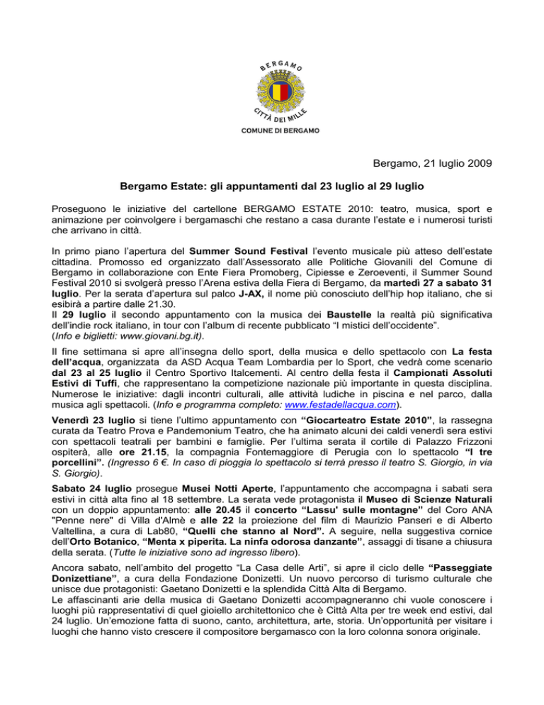 Bergamo, 21 luglio 2009 Bergamo Estate: gli appuntamenti dal 23 luglio al 29 luglio Proseguono le iniziative del cartellone BERGAMO ESTATE 2010: teatro, musica, sport e animazione per coinvolgere i bergamaschi che restano a casa durante l’estate e i numerosi turisti che arrivano in città. In primo piano l’apertura del Summer Sound Festival l’evento musicale più atteso dell’estate cittadina. Promosso ed organizzato dall’Assessorato alle Politiche Giovanili del Comune di Bergamo in collaborazione con Ente Fiera Promoberg, Cipiesse e Zeroeventi, il Summer Sound Festival 2010 si svolgerà presso l’Arena estiva della Fiera di Bergamo, da martedì 27 a sabato 31 luglio. Per la serata d’apertura sul palco J-AX, il nome più conosciuto dell’hip hop italiano, che si esibirà a partire dalle 21.30. Il 29 luglio il secondo appuntamento con la musica dei Baustelle la realtà più significativa dell’indie rock italiano, in tour con l’album di recente pubblicato “I mistici dell’occidente”. (Info e biglietti: www.giovani.bg.it). Il fine settimana si apre all’insegna dello sport, della musica e dello spettacolo con La festa dell’acqua, organizzata da ASD Acqua Team Lombardia per lo Sport, che vedrà come scenario dal 23 al 25 luglio il Centro Sportivo Italcementi. Al centro della festa il Campionati Assoluti Estivi di Tuffi, che rappresentano la competizione nazionale più importante in questa disciplina. Numerose le iniziative: dagli incontri culturali, alle attività ludiche in piscina e nel parco, dalla musica agli spettacoli. (Info e programma completo: www.festadellacqua.com). Venerdì 23 luglio si tiene l’ultimo appuntamento con “Giocarteatro Estate 2010”, la rassegna curata da Teatro Prova e Pandemonium Teatro, che ha animato alcuni dei caldi venerdì sera estivi con spettacoli teatrali per bambini e famiglie. Per l’ultima serata il cortile di Palazzo Frizzoni ospiterà, alle ore 21.15, la compagnia Fontemaggiore di Perugia con lo spettacolo “I tre porcellini”. (Ingresso 6 €. In caso di pioggia lo spettacolo si terrà presso il teatro S. Giorgio, in via S. Giorgio). Sabato 24 luglio prosegue Musei Notti Aperte, l’appuntamento che accompagna i sabati sera estivi in città alta fino al 18 settembre. La serata vede protagonista il Museo di Scienze Naturali con un doppio appuntamento: alle 20.45 il concerto “Lassu' sulle montagne” del Coro ANA "Penne nere" di Villa d'Almè e alle 22 la proiezione del film di Maurizio Panseri e di Alberto Valtellina, a cura di Lab80, “Quelli che stanno al Nord”. A seguire, nella suggestiva cornice dell’Orto Botanico, “Menta x piperita. La ninfa odorosa danzante”, assaggi di tisane a chiusura della serata. (Tutte le iniziative sono ad ingresso libero). Ancora sabato, nell’ambito del progetto “La Casa delle Arti”, si apre il ciclo delle “Passeggiate Donizettiane”, a cura della Fondazione Donizetti. Un nuovo percorso di turismo culturale che unisce due protagonisti: Gaetano Donizetti e la splendida Città Alta di Bergamo. Le affascinanti arie della musica di Gaetano Donizetti accompagneranno chi vuole conoscere i luoghi più rappresentativi di quel gioiello architettonico che è Città Alta per tre week end estivi, dal 24 luglio. Un’emozione fatta di suono, canto, architettura, arte, storia. Un’opportunità per visitare i luoghi che hanno visto crescere il compositore bergamasco con la loro colonna sonora originale. Il ciclo si apre il 24 luglio dalla Casa Natale del musicista con Apres midi musicali (ore 15, 16 e 17), per replicare domenica 25 luglio alle ore 16 e alle ore 17, mentre lo splendido Teatro Sociale, ospita sabato 24 luglio alle ore 21 un recital di arie celebri realizzato da Bergamo Musica Festival Opera Ensemble (formazione strumentale e vocale). Un’opportunità dedicata a tutti: turisti, cittadini, amanti della musica e della cultura. (Ingresso 10 € per il Teatro Sociale, ingresso libero per gli altri appuntamenti). Da non perdere un appuntamento di “Anni di frontiera. L’estate dei giovani”, il cartellone estivo di iniziative di spettacolo, musica, promozione culturale e artistica e di aggregazione curate e gestite direttamente da associazioni giovanili, in collaborazione con l’Assessorato alle Politiche Giovanili. Dal 22 al 25 luglio nello splendido spazio verde della Trucca si tiene BergamoReggae Sunfest, curata dall’omonima associazione: musica, danza, sport e tanto divertimento! (Programma completo: www.giovani.bg.it) Ancora nel weekend da ricordare un appuntamento all’insegna dello spettacolo con “Teatro cocomero”, iniziativa dell’Associazione Retroscena pensata per rinfrescare le calde domeniche di luglio con una fetta d’anguria, mentre si assiste ad uno spettacolo nella chiesetta del Monastero di Valmarina (sede parco dei Colli). Per l’ultimo appuntamento, domenica 25 luglio in scena Luna e Gnac Teatro in "Scarpette strette", uno spettacolo comico-musicale ispirato alla celebre fiaba di Prokofiev. Con i ruoli rovesciati, e dove la clownerie si mischia alla poesia. (Ingresso 5 €). Ancora un appuntamento teatrale, con il teatro di figura, domenica 25 luglio in piazza Vecchia. Al via la tradizionale rassegna “La piazza dei burattini”, a cura della Fondazione Ravasio, che anche quest’anno ospiterà numerose compagnie del panorama nazionale e internazionale. Domenica in scena, alle ore 17, Antamapantahou (Grecia) con "The string of Music". (Spettacolo gratuito). A seguire, sempre domenica in Piazza Vecchia il terzo appuntamento con “Not(t)e d’estate”, che nell’ambito di "Sulle corde dell'Arpa", vedrà sul palco l’Ensamble Arpe Diem, un quartetto formato da quattro arpiste. (Posti a sedere 5 €). Da non dimenticare martedì 27 luglio il terzo appuntamento con “Eccentrici”, la fortunata rassegna di arti comiche che, dopo il successo dei primi due spettacoli, torna a Palazzo Frizzoni con Paul Morocco e Olè in “FlamenComedy”, un 