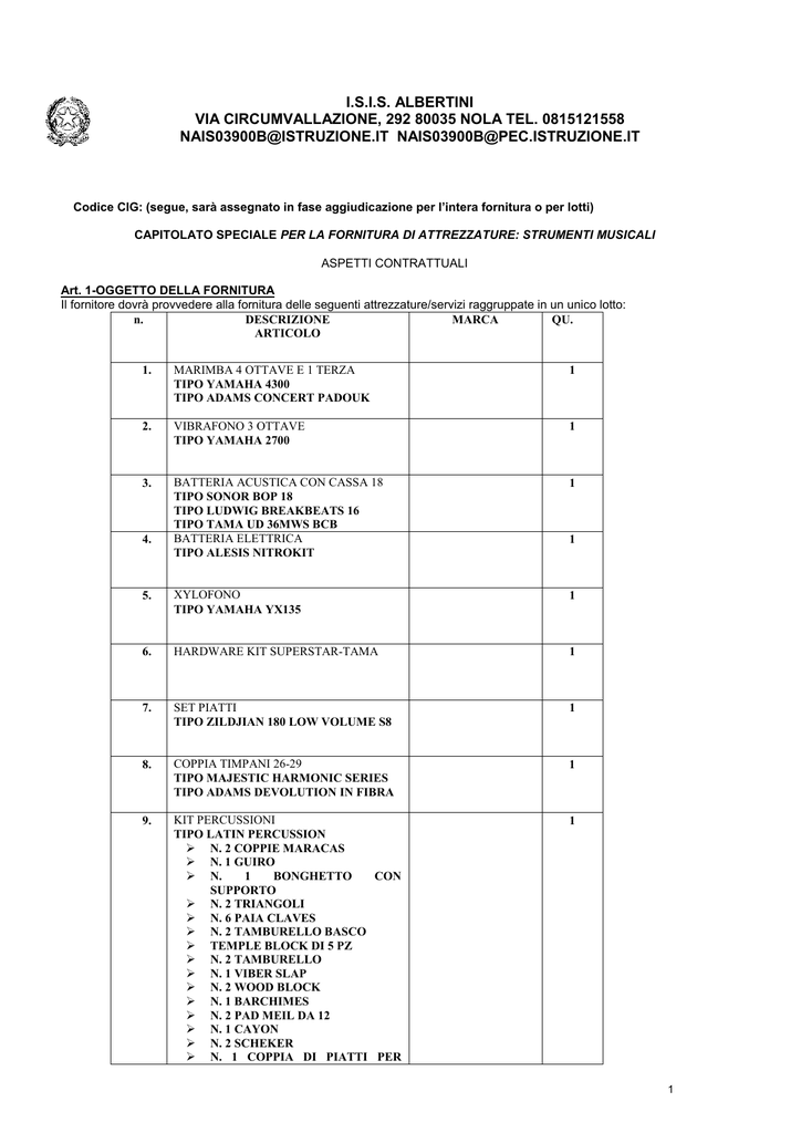 I.S.I.S. ALBERTINI VIA CIRCUMVALLAZIONE, 292 80035 NOLA TEL. 0815121558 [email protected] [email protected] Codice CIG: (segue, sarà assegnato in fase aggiudicazione per l’intera fornitura o per lotti) CAPITOLATO SPECIALE PER LA FORNITURA DI ATTREZZATURE: STRUMENTI MUSICALI ASPETTI CONTRATTUALI Art. 1-OGGETTO DELLA FORNITURA Il fornitore dovrà provvedere alla fornitura delle seguenti attrezzature/servizi raggruppate in un unico lotto: n. DESCRIZIONE MARCA QU. ARTICOLO 1. MARIMBA 4 OTTAVE E 1 TERZA TIPO YAMAHA 4300 TIPO ADAMS CONCERT PADOUK 1 2. VIBRAFONO 3 OTTAVE TIPO YAMAHA 2700 1 3. BATTERIA ACUSTICA CON CASSA 18 TIPO SONOR BOP 18 TIPO LUDWIG BREAKBEATS 16 TIPO TAMA UD 36MWS BCB BATTERIA ELETTRICA TIPO ALESIS NITROKIT 1 5. XYLOFONO TIPO YAMAHA YX135 1 6. HARDWARE KIT SUPERSTAR-TAMA 1 7. SET PIATTI TIPO ZILDJIAN 180 LOW VOLUME S8 1 8. COPPIA TIMPANI 26-29 TIPO MAJESTIC HARMONIC SERIES TIPO ADAMS DEVOLUTION IN FIBRA 1 9. KIT PERCUSSIONI TIPO LATIN PERCUSSION N. 2 COPPIE MARACAS N. 1 GUIRO N. 1 BONGHETTO CON SUPPORTO N. 2 TRIANGOLI N. 6 PAIA CLAVES N. 2 TAMBURELLO BASCO TEMPLE BLOCK DI 5 PZ N. 2 TAMBURELLO N. 1 VIBER SLAP N. 2 WOOD BLOCK N. 1 BARCHIMES N. 2 PAD MEIL DA 12 N. 1 CAYON N. 2 SCHEKER N. 1 COPPIA DI PIATTI PER 1 4. 1 1 10. BANDA TIPO UFIP HEAVY BAND 138 CASSA DA PARATA CON SUPPORTO TIPO PEACE MD 2210A SET CUSTODIE BATTERIA BORSA CUSTODIA PIATTI VIOLINO STENTOR STUDIEN 2 TIPO MODELLO YAMAHA STUDENT 1 11. VIOLINO STENTOR ARCADIA TIPO MODELLO YAMAHA STUDENT 1 12. VIOLA STENTOR CONSERVATOIRE 2 13. VIOLA STENTOR 2 2 14. VIOLONCELLO STENTOR 1 2 15. VIOLONCELLO ARCADIA 2 16. CONTRABASSO 2 17. PIANOFORTE A CODA DA CONCERTO CINTURA COMPOSTA DA 20 STRATI DI ACERO E MOGANO PRESSATI ED INCOLLATI IN UN UN UNICO CICLO DI LAVORO PIASTRA DI GHISA GRIGIA E PROCESSO DI COLATA IN SABBIA CASSA ARMONICA IN LEGNI DI ABETE SITKA CON ANDAMENTO REGOLARE DELLE FIBRE RASTREMATURA DELLA CASSA AROMONICA ALLE ESTREMITA’ IN MODO DA OSCILLARE PIU’ LIBERAMENTE GENERANDO UN SUONO PIENO LUNGHEZZA 227CM LARGHEZZA 155 CM PESO 400 KG COLORE NERO PIANOFORTE VERTICALE DA STUDIO CINTURA COMPOSTA DA 20 STRATI DI ACERO E MOGANO PRESSATI ED INCOLLATI IN UN UN UNICO CICLO DI LAVORO PIASTRA DI GHISA GRIGIA E PROCESSO DI COLATA IN SABBIA CASSA ARMONICA IN LEGNI DI ABETE SITKA CON ANDAMENTO REGOLARE DELLE FIBRE RASTREMATURA DELLA CASSA AROMONICA ALLE 1 18. 2 2 19. 20. 21. 22. 23. 24. 25. ESTREMITA’ IN MODO DA OSCILLARE PIU’ LIBERAMENTE GENERANDO UN SUONO PIENO ALTEZZA 132 CM LARGHEZZA 152,50 CM PROFONDITA’ 68 CM PESO 305 KG COLORE NERO LEGGIO COMPATTO, ROBUSTO, PIEGHEVOLE, SMONTABILE, IN ALLUMINIO O ALTRI METALLI E LEGHE METALLICHE, TRAFORATO REGOLABILE SIA IN ALTEZZA CHE PER INCLINAZIONE E BORSA PER CUSTODIA LEGGIO MORBIDA PODIO DIRETTORIALE LEGGERO E PIEGHEVOLE CON SISTEMA DI MONTAGGIO STABILE E SICURO RIVESTIMENTO ANTISDRUCCIOLO, POSSIBILMENTE MOQUETTE DIMENSIONI: H 15-30 CM X LUG.75-100 CM X LARG. 75-100 CM LEGGIO DIRETTORIALE PIEGHEVOLE REGOLABILE IN ALTEZZA BASCULANTE DIMENSIONI: LUNG CM 60/80 CA. X LARGH.CM 40/60 CA. SGABELLO DIRETTORIALE CON BASE A 5-6 RAGGI DI SOSTEGNO APPOGGIO PER I PIEDI STRUTTURA LEGGERA MA SOLIDA E REGOLABILE IN TUTTE LE SUE PARTI CLARINETTO BASSO PROFESSIONALE SERIE TOP DELLA CON SISTEMA BOEHM 662II, DISCENDENTE AL DO. CARATTERISTICHE: • CORPO IN GRENADILLA • 24 CHIAVI • 7 ANELLI • CHIAVI E CAMPANA ARGENTATE ACCESSORI INCLUSI: • BOCCHINO • ASTUCCIO •LEGATURA E COPRIBOCCHINO ARGENTATO SAX BARITONO PROFESSIONALE SAX BARITONO FINITURA 301GL LACCATO GOLD CARATTERISTICHE: • COLLO STANDARD • REGISTRO BASSO LA • REGISTRO ALTO FA# PIANOFORTE DIGITALE TASTIERA GRADED HAMMER STANDARD (GHS) CON 88 TASTI E FINITURA OPACA SUI TASTI NERI PURE CF SOUND ENGINE 60 1 1 1 1 1 3 554 VOCI 192-NOTE DI POLIFONIA 3 FUNZIONE PIANO ROOM 205 STILI DI ACCOMPAGNAMENTO E STYLE RECOMMENDER DAMPER RESONANCE EFFETTI DSP; REVERB, CHORUS E HARMONY MODO DUAL E SPLIT 6 TRACCE DI REGISTRAZIONE USB-AUDIO RECORDER 26. DISPLAY GRAFICO SPAZIOSO (PER LA VISUALIZZAZIONE DEL RIGO MUSICALE E SONG LYRICS) INTELLIGENT ACOUSTIC CONTROL (IAC) INGRESSO MICROFONO CON EFFETTI PORTE USB TO HOST E USB TO DEVICE OPZIONALE: UNITÀ PEDALI CON 3 PEDALI NERA PIANOFORTE DIGITALE PORTATILE TASTIERA GRADED HAMMER (GH) CON 88 TASTI E COPRITASTI IN AVORIO SINTETICO PURE CF SOUND ENGINE 3 24 VOCI 256-NOTE DI POLIFONIA 10 RITMI RISONANZA SMORZATORE RISONANZA CORDE 4 TIPI DI RIVERBERO EQUALIZZATORE A 3 BANDE 2 TRACCE IN REGISTRAZIONE (10 BRANOS) SOUND BOOST FUNZIONI DUAL E SPLIT CONNESSIONE USB TO HOST CONNESSIONE USB TO DEVICE 27. MIDI IN / OUT OPZIONALE: SUPPORTO IN NERO CON PEDALIERA TASTIERA PORTATILE TASTIERA SENSIBILE AL TOCCO CON 76 TASTI 758 VOCI 2 LIVE! GRAND PIANO 220 STYLES ARPEGGIO (150 TIPI) MUSIC DATABASE E ONE TOUCH SETTING 4 INGRESSO AUX AUDIO MELODY SUPPRESSOR FUNZIONE PATTERN 28. CON AMPLIFICAZIONE E SISTEMA DI DIFFUSORI 12W + 12W CONTROLLER IN REAL-TIME E PITCH BEND WHEEL CONNETTIVITÀ USB-TO-HOST E USB-TO-DEVICE PEDANA CORO PEDANA MULTIPIANO DI 4 LIVELLI PER CORO FINO A 50 ELEMENTI CARATTERISTICHE: N. 2 BLOCHI DI 4 PEDANE CIASCUNO DI DIMENSIONI DIVERSE. LA PIU’ GRANDE AVRA’ LUNGHEZZA 4-5 MT PER 1 MT DI LARGHEZZA PER ALTEZZA 40-50 CML ALTRE PROPORZIONALMENTE PIU’ PICCOLE PER UNA LUNGJEZZA COMPLESSIVA DI 8-10 MT L’ elenco e le quantità indicate nella colonna 2 non costituiscono alcun vincolo per cui possono variare, Qualora l’importo di spesa risulti insufficiente per l’acquisto di tutti i beni elencati, l’istituzione scolastica si riserva di ridurre le quantità e/o i beni secondo le esigenze dell’istituzione stessa. Art. 2-DURATA DEL CONTRATTO Il contratto avrà la durata dalla data di stipula o dell’ordine della fornitura alla data del collaudo positivo. Art. 3- LISTINO PREZZI Il fornitore dovrà praticare, per tutta la durata contrattuale, i prezzi con cui si è aggiudicato la fornitura. Art. 4 – LUOGHI DI CONSEGNA a) sede centrale: 1) VIA CIRCUMVALLAZIONE, 292 80035 NOLA TEL. 08151215