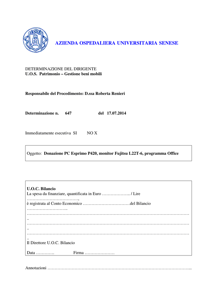 AZIENDA OSPEDALIERA UNIVERSITARIA SENESE DETERMINAZIONE DEL DIRIGENTE U.O.S. Patrimonio – Gestione beni mobili Responsabile del Procedimento: D.ssa Roberta Renieri Determinazione n. 647 del 17.07.2014 Immediatamente esecutiva SI NO X Oggetto: Donazione PC Esprimo P420, monitor Fujitsu L22T-6, programma Office U.O.C. Bilancio La spesa da finanziare, quantificata in Euro ……………….. / Lire ………………………………, è registrata al Conto Economico ……………………………del Bilancio ……………………….. …………………………………………………………………………………………………… .. …………………………………………………………………………………………………… .. …………………………………………………………………………………………………… .. Il Direttore U.O.C. Bilancio Data …………. Firma ………………… Annotazioni ………………………………………………………………………………………... IL DIRIGENTE U.O.S. PATRIMONIO – GESTIONE BENI MOBILI PREMESSO che la presente deliberazione è adottata in virtù della delega conferita dal Direttore Generale con Delibera n. 101 del 13/03/2013 poiché trattasi di attività oggetto di delega di cui all’allegato “1” di tale provvedimento; VISTA la deliberazione della G.R.T. n. 617 del 11.06.2001 recante indirizzi applicativi in merito all' accettazione delle donazioni; VISTA altresì la Legge Regionale 24 febbraio 2005 n° 40 “Disciplina del servizio Sanitario Regionale” che all' art.114, comma, detta la disciplina per l' accettazione da parte delle Aziende Sanitarie di attrezzature ovvero some di denaro; TENUTO CONTO della Procedura Aziendale 1.2 Gestione Libro Cespiti (fase 7.5 Donazioni) Ciclo Patrimonio con la quale è stata disciplinata la gestione delle donazioni dei beni mobili per l' Azienda Ospedaliera Senese; PRESO ATTO dell' offerta da parte di Sienail, la sezione di Siena dell' Associazione Italiana contro Leucemie, Linfomi e Mieloma, di donazione di n. 1 PC Espirmo 420 compreso di monitor Fujitsu L22T-6 e di programma Office installato all' Azienda Ospedaliera Senese, ed in particolare alla U.O.S.A. Trapianti e Terapia Cellulare trasmessa con lettera indirizzata al Dirigente U.O.S. Patrimonio: gestione beni mobili in data 10 giugno 2014 ; CONSIDERATO che il Direttore della U.O.S.A. Trapianti e Terapia Cellulare ha espresso volontà di acquisire il bene trasmettendo il Modulo “Richiesta di Accettazione Donazione”, compilato in ogni sua parte, al Dirigente U.O.S. Patrimonio – Gestione beni mobili così come da procedura aziendale di cui sopra; VISTO che l' accettazione della donazione non comporta nessun vincolo per l' azienda di acquisto di materiali di consumo o comunque esiste un mercato concorrenziale degli stessi così come stabilito dalla Legge Regionale n° 40 di cui sopra; PRESO ATTO che il valore dell’oggetto della donazione è di 736,00 iva inclusa; TENUTO CONTO del parere favorevole espresso dal Direttore Estav – ICT AOUS in merito alle caratteristiche tecniche del bene; CONSIDERATO il parere favorevole, acquisito agli atti della U.O.S. Patrimonio: Gestione beni mobili, del Direttore Amministrativo; DATO atto che la relativa documentazione del bene donato verrà trasmessa all' U.O.S. Patrimonio: Gestione beni mobili per l' acquisizione della suddetta apparecchiatura nel patrimonio dell' Azienda Ospedaliera Universitaria Senese, come da Procedura Aziendale 1.2 Gestione Libro Cespiti (fase 7.5.7 Donazioni) Ciclo Patrimonio; DISPONE 1) Per le motivazioni esposte in premessa, di accettare la donazione da parte di Sienail, la sezione di Siena dell' Associazione Italiana contro Leucemie, Linfomi e Mieloma, di n. 1 PC Espirmo 420 compreso di monitor Fujitsu L22T-6 e di programma Office installato all' Azienda Ospedaliera Senese, ed in particolare alla U.O.S.A. Trapianti e Terapia Cellulare; 2) Dare atto che il valore degli oggetti della donazione è di 736,00 iva inclusa; 3) Trasmettere copia del presente atto al Collegio Sindacale ai sensi della L.R.T. n. 40/2005, art. 42 c. 2. Fatto e sottoscritto IL DIRIGENTE U.O.S. PATRIMONIO: Gestione Bene mobili Dott.ssa Roberta Renieri Per copia conforme all’originale, per uso amministrativo Il Dirigente U.O.C. Programmazione e Patrimonio Dott.ssa Roberta Renieri ………………………………………………………………………………………………… Siena, ………………………………………………………………… CERTIFICATO DI PUBBLICAZIONE Copia della presente determinazione è stata pubblicata all’Albo il …………………….. …e vi rimarrà per 15 giorni consecutivi. Nella stessa data è stata inoltre trasmessa al Collegio Sindacale e al Direttore Amministrativo. IL DIRETTORE U.O. C. AFFARI GENERALI (o suo delegato) ………………………….. CERTIFICATO DI ESECUTIVITA’ La presente determinazione, dichiarata immediatamente esecutiva, è stata pubblicata all’Albo dal …………………………. al …………………………. La presente determinazione, pubblicata all’Albo il ……………….…………., è divenuta esecutiva in data ………………………………. IL DIRETTORE U.O.C. AFFARI GENERALI (o suo delegato) ……..………………….. Trasmessa per l’esecuzione e/o successivi adempimenti alle seguenti strutture organizzative: UOC Formazione Dipartimento Professioni Sanitarie UOC Prevenzione e Protezione Rischi UOP Diagnostica per Immagini UOC Promozione della Salute UOP Diagnostica di Laboratorio UOC Affari Legali UOP delle Professioni della Riabilitazione UOS Data Management UOC Controllo di Gestione Direzione Sanitaria UOC Sistema di Riscossione e Gestione Ticket Direzione Medica di Presidio X UOC Bilancio UOSA Clinical Risk Management X UOS Patrimonio: Gestione beni mobili UOC Soddisf