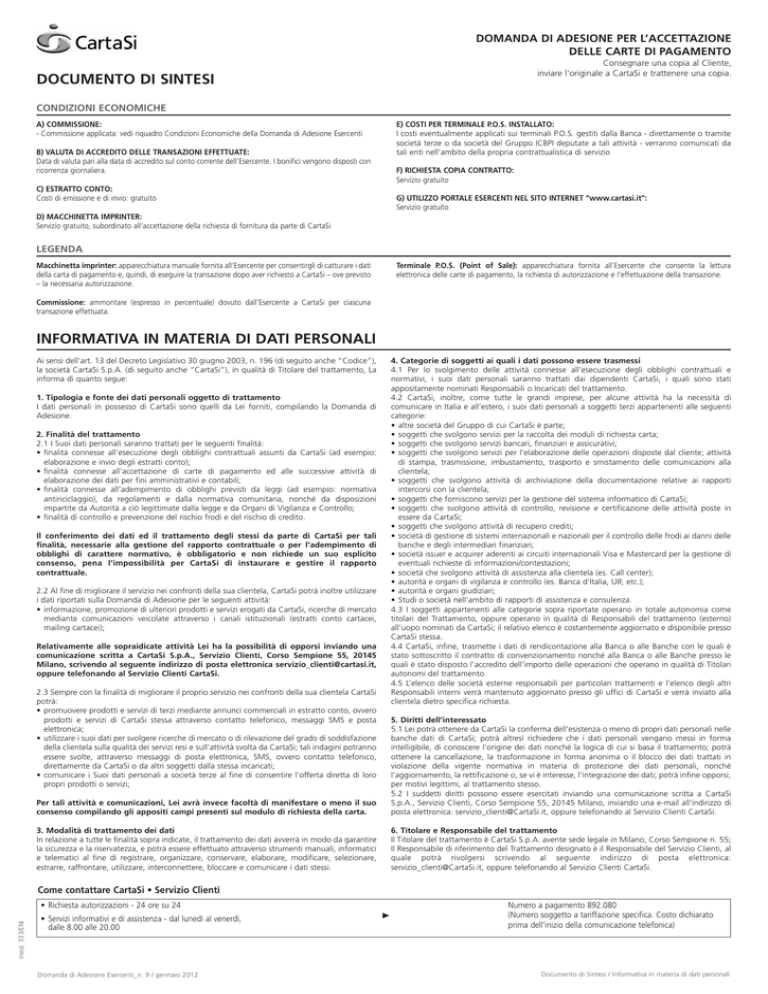 DOMANDA DI ADESIONE PER L’ACCETTAZIONE DELLE CARTE DI PAGAMENTO Consegnare una copia al Cliente, inviare l'originale a CartaSi e trattenere una copia. DOCUMENTO DI SINTESI CONDIZIONI ECONOMICHE E) COSTI PER TERMINALE P.O.S. INSTALLATO: I costi eventualmente applicati sui terminali P.O.S. gestiti dalla Banca - direttamente o tramite società terze o da società del Gruppo ICBPI deputate a tali attività - verranno comunicati da tali enti nell’ambito della propria contrattualistica di servizio A) COMMISSIONE: - Commissione applicata: vedi riquadro Condizioni Economiche della Domanda di Adesione Esercenti B) VALUTA DI ACCREDITO DELLE TRANSAZIONI EFFETTUATE: Data di valuta pari alla data di accredito sul conto corrente dell’Esercente. I bonifici vengono disposti con ricorrenza giornaliera. F) RICHIESTA COPIA CONTRATTO: Servizio gratuito C) ESTRATTO CONTO: Costi di emissione e di invio: gratuito G) UTILIZZO PORTALE ESERCENTI NEL SITO INTERNET “www.cartasi.it”: Servizio gratuito D) MACCHINETTA IMPRINTER: Servizio gratuito, subordinato all’accettazione della richiesta di fornitura da parte di CartaSi LEGENDA Terminale P.O.S. (Point of Sale): apparecchiatura fornita all’Esercente che consente la lettura elettronica delle carte di pagamento, la richiesta di autorizzazione e l’effettuazione della transazione. Macchinetta imprinter: apparecchiatura manuale fornita all’Esercente per consentirgli di catturare i dati della carta di pagamento e, quindi, di eseguire la transazione dopo aver richiesto a CartaSi – ove previsto – la necessaria autorizzazione. Commissione: ammontare (espresso in percentuale) dovuto dall’Esercente a CartaSi per ciascuna transazione effettuata. INFORMATIVA IN MATERIA DI DATI PERSONALI 4. Categorie di soggetti ai quali i dati possono essere trasmessi 4.1 Per lo svolgimento delle attività connesse all’esecuzione degli obblighi contrattuali e normativi, i suoi dati personali saranno trattati dai dipendenti CartaSi, i quali sono stati appositamente nominati Responsabili o Incaricati del trattamento. 4.2 CartaSi, inoltre, come tutte le grandi imprese, per alcune attività ha la necessità di comunicare in Italia e all’estero, i suoi dati personali a soggetti terzi appartenenti alle seguenti categorie: • altre società del Gruppo di cui CartaSi è parte; • soggetti che svolgono servizi per la raccolta dei moduli di richiesta carta; • soggetti che svolgono servizi bancari, finanziari e assicurativi; • soggetti che svolgono servizi per l’elaborazione delle operazioni disposte dal cliente; attività di stampa, trasmissione, imbustamento, trasporto e smistamento delle comunicazioni alla clientela; • soggetti che svolgono attività di archiviazione della documentazione relative ai rapporti intercorsi con la clientela; • soggetti che forniscono servizi per la gestione del sistema informatico di CartaSi; • soggetti che svolgono attività di controllo, revisione e certificazione delle attività poste in essere da CartaSi; • soggetti che svolgono attività di recupero crediti; • società di gestione di sistemi internazionali e nazionali per il controllo delle frodi ai danni delle banche e degli intermediari finanziari; • società issuer e acquirer aderenti ai circuiti internazionali Visa e Mastercard per la gestione di eventuali richieste di informazioni/contestazioni; • società che svolgono attività di assistenza alla clientela (es. Call center); • autorità e organi di vigilanza e controllo (es. Banca d’Italia, UIF, etc.); • autorità e organi giudiziari; • Studi o società nell’ambito di rapporti di assistenza e consulenza. 4.3 I soggetti appartenenti alle categorie sopra riportate operano in totale autonomia come titolari del Trattamento, oppure operano in qualità di Responsabili del trattamento (esterno) all’uopo nominati da CartaSi; il relativo elenco è costantemente aggiornato e disponibile presso CartaSi stessa. 4.4 CartaSi, infine, trasmette i dati di rendicontazione alla Banca o alle Banche con le quali è stato sottoscritto il contratto di convenzionamento nonché alla Banca o alle Banche presso le quali è stato disposto l’accredito dell’importo delle operazioni che operano in qualità di Titolari autonomi del trattamento. 4.5 L’elenco delle società esterne responsabili per particolari trattamenti e l’elenco degli altri Responsabili interni verrà mantenuto aggiornato presso gli uffici di CartaSi e verrà inviato alla clientela dietro specifica richiesta. Ai sensi dell’art. 13 del Decreto Legislativo 30 giugno 2003, n. 196 (di seguito anche “Codice”), la società CartaSi S.p.A. (di seguito anche “CartaSi”), in qualità di Titolare del trattamento, La informa di quanto segue: 1. Tipologia e fonte dei dati personali oggetto di trattamento I dati personali in possesso di CartaSi sono quelli da Lei forniti, compilando la Domanda di Adesione. 2. Finalità del trattamento 2.1 I Suoi dati personali saranno trattati per le seguenti finalità: • finalità connesse all’esecuzione degli obblighi contrattuali assunti da CartaSi (ad esempio: elaborazione e invio degli estratti conto); • finalità connesse all’accettazione di carte di pagamento ed alle successive attività di elaborazione dei dati per fini amministrativi e contabili; • finalità connesse all’adempimento di obblighi previsti da leggi (ad esempio: normativa antiriciclaggio), da regolamenti e dalla normativa comunitaria, nonché da disposizioni impartite da Autorità a ciò legittimate dalla legge e da Organi di Vigilanza e Controllo; • finalità di controllo e prevenzione del rischio frodi e del rischio di credito. Il conferimento dei dati ed il trattamento degli stessi da parte di CartaSi per tali finalità, necessarie alla gestione del rapporto contrattuale o per l’adempimento di obblighi di carattere normativo, è obbligatorio e non richiede un suo esplicito consenso, pena l’impossibilità per CartaSi di instaurare e ges