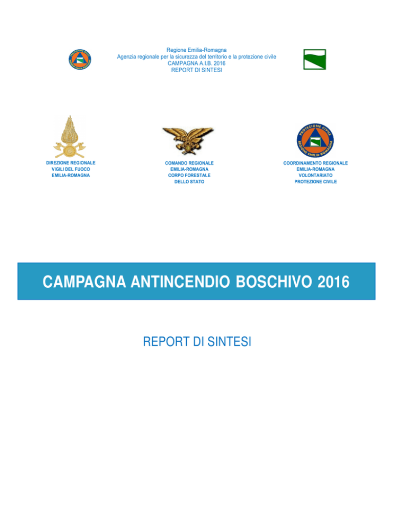 Regione Emilia-Romagna Agenzia regionale per la sicurezza del territorio e la protezione civile CAMPAGNA A.I.B. 2016 REPORT DI SINTESI DIREZIONE REGIONALE VIGILI DEL FUOCO EMILIA-ROMAGNA COMANDO REGIONALE EMILIA-ROMAGNA CORPO FORESTALE DELLO STATO COORDINAMENTO REGIONALE EMILIA-ROMAGNA VOLONTARIATO PROTEZIONE CIVILE CAMPAGNA ANTINCENDIO BOSCHIVO 2016 REPORT DI SINTESI Regione Emilia-Romagna Agenzia regionale per la sicurezza del territorio e la protezione civile CAMPAGNA A.I.B. 2016 REPORT DI SINTESI INDICE INDICE ............................................................................................................................... 2 1. ATTIVITA’ S.O.U.P. ...................................................................................................... 3 2. RISORSE UMANE E STRUMENTALI ........................................................................ 4 2.1 Risorse messe a disposizione dai Vigili del Fuoco .................................................. 4 2.2 Risorse messe a disposizione dal Corpo Forestale dello Stato .............................. 5 2.3 Volontariato di protezione civile ................................................................................. 6 2.3.1 Attività ....................................................................................................................... 6 2.3.2 Mezzi ......................................................................................................................... 8 2.4 ARPAE – Servizio Idro-Meteo-Clima......................................................................... 8 3. RISULTATI DELLE ATTIVITA’................................................................................... 11 3.1 Numero di incendi boschivi ed ettari di superficie interessata dal fuoco nella fase di attenzione (ultimi 5 anni) .................................................................................... 11 3.2 Numero di incendi boschivi ed ettari di superficie interessata dal fuoco nel periodo di grave pericolosità (ultimi 5 anni)................................................................... 12 3.3 Ettari di superfice boscata interessati dal fuoco durante la fase di attenzione Confronto ultime 5 annualità........................................................................................... 13 4. CONSUNTIVO FINANZIARIO ................................................................................... 14 Pagina 2 di 14 Regione Emilia-Romagna Agenzia regionale per la sicurezza del territorio e la protezione civile CAMPAGNA A.I.B. 2016 REPORT DI SINTESI 1. ATTIVITA’ S.O.U.P. Dal 1 luglio 2016 al 4 settembre 2016, il Direttore dell’Agenzia regionale di Protezione Civile ha attivato la Sala Operativa Unificata Permanente – S.O.U.P. – presso il Centro Operativo Regionale di Protezione Civile. Durante il periodo di apertura della S.O.U.P. (compresi sabati, domeniche e festivi) operano, per ogni turno giornaliero (dalle 8 alle 20) funzionari ed operatori dell’Agenzia, del Corpo Forestale dello Stato, dei Vigili del fuoco, del volontariato di Protezione Civile. Tale attività è integrata, per le 12 ore notturne, dalla operatività della Centrale Operativa Regionale del Corpo Forestale dello Stato e dalla reperibilità di funzionari dell’Agenzia di Protezione Civile. Periodi di intervento estate 2016 Fase di ATTENZIONE Fase di PRE ALLARME (periodo di grave pericolosità) Attivazione SOUP Dal 1 luglio 2016 al 30 settembre 2016 Dal 23 luglio 2016 al 28 agosto 2016 Dal 1 luglio 2016 al 4 settembre 2016 Le principali funzioni svolte dalla S.O.U.P. sono: • • • • presa in carico delle segnalazioni di incendio per tutto il territorio regionale effettuate da cittadini, volontari di Protezione Civile e da altri enti o strutture operative, attraverso il numero verde regionale 800-333-911 ed i numeri di emergenza (1515, 115 o numeri diretti delle sale operative); raccordo delle attività giornaliere mediante briefing quotidiano svolto congiuntamente dai soggetti presenti in S.O.U.P. e servizio Idro Meteo Clima di ARPA finalizzato alla stima della potenzialità degli incendi, sia come suscettività del territorio che come valori di indici di incendi boschivi, elaborata con l’ausilio di modellistica e software specialistici; attivazione delle squadre operative del Corpo Forestale dello Stato o dei Vigili del Fuoco più prossime alla località segnalata; attivazione, qualora necessario, delle squadre del volontariato di Protezione Civile; Pagina 3 di 14 Regione Emilia-Romagna Agenzia regionale per la sicurezza del territorio e la protezione civile CAMPAGNA A.I.B. 2016 REPORT DI SINTESI • attivazione, qualora le dimensioni dell’incendio lo richiedano, dei mezzi aerei del Nucleo Volo dei Vigili del Fuoco di Bologna e di quelli messi a disposizione dal Corpo Forestale dello Stato (vedi tabella di seguito); Disponibilità elicotteri VVF - CFS Modello elicottero Struttura operativa Base logistica AB412 VVF Bologna AB206 VVF Bologna AB412 CFS Rimini 2. RISORSE UMANE E STRUMENTALI 2.1 Risorse messe a disposizione dai Vigili del Fuoco La Regione Emilia-Romagna e il Dipartimento dei Vigili del Fuoco, del Soccorso Pubblico e della Difesa Civile – Direzione regionale Emilia-Romagna hanno stipulato, il 24 settembre 2013, una convenzione - quadro quinquennale per la reciproca collaborazione nelle attività di protezione civile. Nell’ambito delle finalità della convenzione – quadro è previsto la partecipazione della Direzione e dei Comandi VVF con le proprie risorse (uomini, mezzi, attrezzature) alle attività di spegnimento degli incendi boschivi da definirsi con cadenza annuale in relazione alle esigenze contingenti connesse con il rischio incendi boschivi e nell'ambito degli indirizzi programmatici previsti nel piano regionale di previsione, prevenzione e lotta attiva agli incendi boschivi di cui all'art. 3, comma 1, della legge n. 353/2000 sia prevedendo attività svolte dalle squadre nell