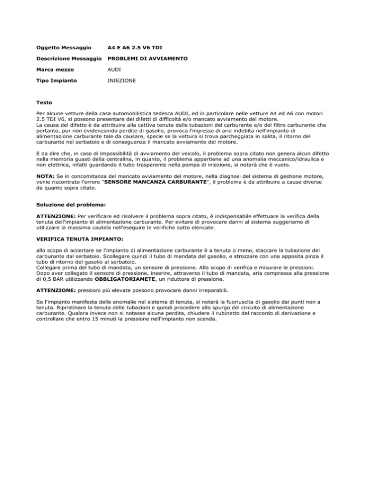 Oggetto Messaggio A4 E A6 2.5 V6 TDI Descrizione Messaggio PROBLEMI DI AVVIAMENTO Marca mezzo AUDI Tipo Impianto INIEZIONE Testo Per alcune vetture della casa automobilistica tedesca AUDI, ed in particolare nelle vetture A4 ed A6 con motori 2.5 TDI V6, si possono presentare dei difetti di difficoltà e/o mancato avviamento del motore. La causa del difetto è da attribuire alla cattiva tenuta delle tubazioni del carburante e/o del filtro carburante che pertanto, pur non evidenziando perdite di gasolio, provoca l'ingresso di aria indebita nell'impianto di alimentazione carburante tale da causare, specie se la vettura si trova parcheggiata in salita, il ritorno del carburante nel serbatoio e di conseguenza il mancato avviamento del motore. E da dire che, in caso di impossibilità di avviamento del veicolo, il problema sopra citato non genera alcun difetto nella memoria guasti della centralina, in quanto, il problema appartiene ad una anomalia meccanico/idraulica e non elettrica, infatti guardando il tubo trasparente nella pompa di iniezione, si noterà che è vuoto. NOTA: Se in concomitanza del mancato avviamento del motore, nella diagnosi del sistema di gestione motore, venie riscontrato l'errore "SENSORE MANCANZA CARBURANTE", il problema è da attribuire a cause diverse da quanto sopra citato. Soluzione del problema: ATTENZIONE: Per verificare ed risolvere il problema sopra citato, è indispensabile effettuare la verifica della tenuta dell'impianto di alimentazione carburante. Per evitare di provocare danni al sistema suggeriamo di utilizzare la massima cautela nell'eseguire le verifiche sotto elencate. VERIFICA TENUTA IMPIANTO: allo scopo di accertare se l'impianto di alimentazione carburante è a tenuta o meno, staccare la tubazione del carburante dal serbatoio. Scollegare quindi il tubo di mandata del gasolio, e strozzare con una apposita pinza il tubo di ritorno del gasolio al serbatoio. Collegare prima del tubo di mandata, un sensore di pressione. Allo scopo di verifica e misurare le pressioni. Dopo aver collegato il sensore di pressione, inserire, attraverso il tubo di mandata, aria compressa alla pressione di 0,5 BAR utilizzando OBBLIGATORIAMETE, un riduttore di pressione. ATTENZIONE: pressioni più elevate possono provocare danni irreparabili. Se l'impianto manifesta delle anomalie nel sistema di tenuta, si noterà la fuoriuscita di gasolio dai punti non a tenuta. Ripristinare la tenuta delle tubazioni e quindi procedere allo spurgo del circuito di alimentazione carburante. Qualora invece non si notasse alcuna perdita, chiudere il rubinetto del raccordo di derivazione e controllare che entro 15 minuti la pressione nell'impianto non scenda.