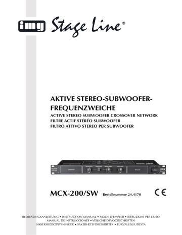 AKTIVE STEREO-SUBWOOFERFREQUENZWEICHE ACTIVE STEREO SUBWOOFER CROSSOVER NETWORK FILTRE ACTIF STÉRÉO SUBWOOFER FILTRO ATTIVO STEREO PER SUBWOOFER MCX-200/SW Bestellnummer 24.4170 BEDIENUNGSANLEITUNG • INSTRUCTION MANUAL • MODE D’EMPLOI • ISTRUZIONI PER L’USO MANUAL DE INSTRUCCIONES • VEILIGHEIDSVOORSCHRIFTEN SIKKERHEDSOPLYSNINGER • SÄKERHETSFÖRESKRIFTER • TURVALLISUUDESTA D Bevor Sie einschalten … A Wir wünschen Ihnen viel Spaß mit Ihrem neuen Gerät von „img Stage Line“. Bitte lesen Sie diese Bedienungsanleitung vor dem Betrieb gründlich durch. Nur so lernen Sie alle Funktionsmöglichkeiten kennen, vermeiden Fehlbedienungen und schützen sich und Ihr Gerät vor eventuellen Schäden durch unsachgemäßen Gebrauch. Heben Sie die Anleitung für ein späteres Nachlesen auf. Der deutsche Text beginnt auf der Seite 4. CH F Avant toute installation … B Nous vous souhaitons beaucoup de plaisir à utiliser cet appareil “img Stage Line”. Lisez ce mode dʼemploi entièrement avant toute utilisation. Uniquement ainsi, vous pourrez apprendre lʼensemble des possibilités de fonctionnement de lʼappareil, éviter toute manipulation erronée et vous protéger, ainsi que lʼappareil, de dommages éventuels engendrés par une utilisation inadaptée. Conservez la notice pour pouvoir vous y reporter ultérieurement. La version française se trouve page 6. CH E DK Antes de la utilización … Before switching on … We wish you much pleasure with your new “img Stage Line” unit. Please read these operating instructions carefully prior to operating the unit. Thus, you will get to know all functions of the unit, operating errors will be prevented, and yourself and the unit will be protected against any damage caused by improper use. Please keep the operating instructions for later use. The English text starts on page 4. I Prima di accendere … Vi auguriamo buon divertimento con il vostro nuovo apparecchio di “img Stage Line”. Leggete attentamente le istruzioni prima di mettere in funzione lʼapparecchio. Solo così potete conoscere tutte le funzionalità, evitare comandi sbagliati e proteggere voi stessi e lʼapparecchio da eventuali danni in seguito ad un uso improprio. Conservate le istruzioni per poterle consultare anche in futuro. Il testo italiano inizia a pagina 6. NL Voor u inschakelt … Le deseamos una buena utilización para su nuevo aparato “img Stage Line”. Por favor, lea estas instrucciones de uso atentamente antes de hacer funcionar el aparato. De esta manera conocerá todas las funciones de la unidad, se prevendrán errores de operación, usted y el aparato estarán protegidos en contra de todo daño causado por un uso inadecuado. Por favor, guarde las instrucciones para una futura utilización. La versión española comienza en la página 8. B Wij wensen u veel plezier met uw nieuwe apparaat van “img Stage Line”. Lees de veiligheidsvoorschriften grondig door, alvorens het apparaat in gebruik te nemen. Zo behoedt u zichzelf en het apparaat voor eventuele schade door ondeskundig gebruik. Bewaar de handleiding voor latere raadpleging. De veiligheidsvoorschriften vindt u op pagina 9. Før du tænder … S Innan du slår på enheten … Tillykke med dit nye “img Stage Line” produkt. Læs sikkerhedsanvisningerne nøje før ibrugtagning, for at beskytte Dem og enheden mod skader, der skyldes forkert brug. Gem venligst denne betjeningsvejledning til senere brug. Sikkerhedsanvisningerne findes på side 9. FIN GB Vi önskar dig mycket glädje med din nya “img Stage Line” produkt. Läs igenom säkerhetsföreskrifterna innan enheten tas i bruk för att undvika skador till följd av felaktig hantering. Behåll instruktionerna för framtida bruk. Säkerhetsföreskrifterna återfinns på sidan 9. Ennen kytkemistä … Toivomme Sinulle paljon miellyttäviä hetkiä uuden “img Stage Line” laitteen kanssa. Ennen laitteen käyttöä pyydämme Sinua huolellisesti tutustumaan turvallisuusohjeisiin. Näin vältyt vahingoilta, joita virheellinen laitteen käyttö saattaa aiheuttaa. Ole hyvä ja säilytä käyttöohjeet myöhempää tarvetta varten. Turvallisuusohjeet löytyvät sivulta 9. w w w.imgstageline.com 2 SUBWOOFER OUTPUT SUBWOOFER PHASE CROSSOVER FREQUENCY SATELLITE OUTPUT 220 NORMAL REVERSE MCX-200/SW 100 350 PRO STEREO SUB / SAT CROSSOVER NETWORK –10 dB 60 +10 LEVEL Hz 500 –10 dB +10 LEVEL POWER 1 2 3 4 MAINS 5 MONO OUTPUT OUTPUT RIGHT OUTPUT LEFT 6 INPUT GND LIFT GND 230V~/50Hz 7 8 9 SUBWOOFER SATELLITE 10 11 SUBWOOFER SATELLITE SUBWOOFER 12 RIGHT LEFT 13 HP-FILTER SATELLITE OUTPUT L HP-FILTER INPUT L 15 Hz PHASE REVERSAL LP-FILTER -1 SUBWOOFER OUTPUT L CROSSOVER FREQUENCY 60...500 Hz SUBWOOFER LEVEL SATELLITE LEVEL SUBWOOFER MONO OUTPUT HP-FILTER SATELLITE OUTPUT R HP-FILTER INPUT R 15 Hz LP-FILTER -1 SUBWOOFER OUTPUT R PHASE REVERSAL Blockschaltbild / Block diagram 3 D A Auf der ausklappbaren Seite 3 finden Sie alle beschriebenen Bedienelemente und Anschlüsse. CH 1 Übersicht der Bedienelemente und Anschlüsse 1.1 Frontseite 1 Pegelregler für die Subwoofer-Kanäle 2 Umschalter für die Phasenlage der SubwooferKanäle Taste gedrückt: Phasenlage um 180° gedreht nicht gedrückt: Phasenlage normal 3 Regler für die Trennfrequenz 12 Ausgänge linker und rechter Kanal zum Anschluss eines Verstärkers für zwei Subwoofer (getrennte Basswiedergabe des linken und rechten Kanals) 13 Eingänge linker und rechter Kanal zum Anschluss der Signalquelle (z. B. Vorverstärker, Mischpult) 2 6 Betriebsanzeige 1.2 Rückseite 7 Netzkabel zum Anschluss an eine Steckdose (230 V~/50 Hz) 8 Groundlift-Schalter Position GND: die Signalmasse und das Gerätegehäuse sind elektrisch verbunden Position LIFT: die Signalmasse und das Gehäuse sind getrennt 9 Klemmschraube für einen eventuellen Masseanschluss (bei Brummproblemen) 10 Ausgang zum Anschluss eines Verstärkers für einen einzelnen Mono-Subwoofer (der Bass des linken und rechten Kanals wird über einen 