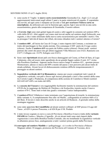 SENTIERI NEWS 15 (n°2 -luglio 2014) 1) sono uscite il 7 luglio le nuove carte escursionistiche Geomedia-Cai , fogli 1,2,3 con gli aggiornamenti intervenuti negli ultimi 2 anni e in parte sintetizzati di seguito. E soprattutto una novità, ad ogni carta è stampato un Q-code o link per scaricare l’intera carta su smartphone, da utilizzare poi con la funzione gps; questa App è una novità su una carta escursionistica, grazie alla competenza di Geomedia, il nostro editore. 2) a Cerreto Alpi sono stati gettati legna di scarto e altri oggetti in cemento sul sentiero 609 a valle della SS 63. Altri oggetti vari erano stati trovati anche sul sentiero degli Schiocchi, non segnato, e che è stato eliminato dalla nuova carta escursionistica per entrambi i motivi. Ora se prosegue l’attività di lancio dei rifiuti, dovremo chiudere tutti i sentieri attorno a Cerreto? 3) il sentiero 605 , all’inizio da Case di Civago, è stato riaperto dal Comune, e recintato un tratto del parcheggio in fine strada sterrata. Ora comunque il 605 parte da Civago centro (chiesa). Anche il sentiero 615 ora parte da Febbio centro (chiesa). Ormai molti sentieri partono dai centri dei paesi (tra gli ultimi raggiunti Villa Minozzo con il 623, Ramiseto con il 677, Collagna con il 679, Sologno con il 621). 4) Sono stati ripristinati alcuni pali con frecce danneggiati sul Cusna, ai Prati di Sara, al Lago Calamone, oltre ad essere stato sgombrato da un grande faggio caduto il sent. 617 vicino alla Peschiera Zamboni. Apposte anche frecce nuove lungo il sentiero 621 , spostato presso Monteorsaro, adesso si stacca dal 609 a monte del paese e non percorre più alcun tratto di strada asfaltata. Alcuni lavori di disboscamento rendono difficile temporaneamente il passaggio su alcuni sentieri. 5) Segnaletica verticale del Cai Bismantova: stanno per essere completati tutti i punti di segnaletica verticale, con pali e frecce agli incroci principali e inizi e fine sentieri della zona tra Cerreto Laghi e Pradarena, di competenza della sezione di Castelnovo Monti (sentieri 643-645-647-649 e un tratto del 609). 6) La cascata del Tassaro è ora raggiungibile facilmente tramite la sistemazione del sentiero 670 B che la raggiunge da Mulino di Chichino o da Scalucchia, tramite anche il nuovo sentiero 670 C. Sono stati evitati due guadi e sistemato l’unico indispensabile. 7) il sentiero 674 di Villaberza è stato terminato con l’asportazione di tronchi, la sistemazione della variante A, il completamento fino alla val Maillo , collegandolo al sentiero 660 a Ca’ del Buio. Il lavoro è stato descritto anche in un articolo di Redacon , il giornale online della montagna reggiana 8) sono state apportate lievi modifiche ad alcuni sentieri collinari: al SSP presso il Lago del Tasso , al 624 A presso Poncema, e al 626 B per il M. Predale 9) è stato invece segnato ex-novo a cura di Provincia e Bonifica il nuovo tratto della variante SM 650 da Casina a Marola e Cigarello , di cui alcuni tratti sono stati riaperti dalla vegetazione a cura della Bonifica Emilia Centrale, che sta installando la segnaletica verticale in alluminio presso fuso, analogamente a tutti i sentieri prima gestiti dalla Provincia 10) convegno sul sentiero Matilde e i pellegrinaggi : si è svolto in Provincia a Palazzo Magnani sabato 10 maggio, promosso da Provincia ed Comune di Vezzano, dove interessanti relatori sono intervenuti su varie sfaccettature sul progetto di allungare il Sentiero Matilde e farne un asse turistico a piedi e in bici tra Mantova e Lucca 11) in questo contesto è stato progettato nuovo accesso al Sentiero Matilde da Reggio a Vezzano lungo il Cròstolo e fino a Canossa per la Pineta, il Monte Grafagnana, Pecorile e Casola: si sta realizzando la segnatura ed è in progetto la segnaletica verticale a cura del Comune di Vezzano 12) In zona Riverzana è stato necessario lo spostamento del sentiero SD (Ducati) tra Grassano e Riverzana, passando ora per il crocicchio in fondo al Rio Vico dove convergono il 640 e il Sent. Matilde. Il vecchio tracciato SM diretto dal Rio Vico a Canossa, pur degradato da frane e tagli del bosco, è stato recuperato e ripassato con il numero 646 C. 13) Il sentiero 640 , variante SD, ora parte da Monticelli e per S. Polo, Vico e Rossena prosegue come prima per Selvapiana e Trinità, mentre i sentieri di Quattro Castella assumono davanti alle lettere da A a N che li contraddistinguono il numero 640, costituendo varianti di quest’ultimo per rientrare nella numerazione regionale. 14) chiusura e deviazione 644: a seguito di ripetute lamentele da parte dei residenti e proprietari, nonché di alberi caduti proprio di recente di traverso, il tratto del 644 tra Costa Magnano e Monte del Gesso verrà chiuso e spostato, d’accordo con il sindaco, sulla stradella d’accesso al Monte del Gesso e allacciato alla ciclopedonale di Vezzano tramite via Ruffilli 15) sentiero 614 in comune di Albinea : il Comune ha allargato a due varianti (A e B) il classico anello di Ca’ del Vento, dopo i lavori di sistemazione del sentiero di accesso alla Tana della Mussina e al Castello di Borzano 16) eliminazione sentieri 604 e 666 : il sentiero 604 in Comune di Scandiano, già promosso dal Comune e fino all’anno scorso gestito dalla Provincia, è stato eliminato dalla carta escursionistica in quanto interrotto in più punti da recinzioni, discariche abusive e solchi di moto, oltre a squallidi tratti cosparsi da rifiuti vari: il sentiero 666 in comune di Canossa non presentava più segnaletica completa e anch’esso è stato eliminato dalla carta escursionistica 17) Sempre in comune di Canossa un proprietario di stradella asfaltata ha proibito il passaggio dei segnavia per terminare la ciclopedonale del canale d’Enza, pertanto il relativo sentiero 662 B è interrotto nei segnavia per 100 m, almeno fin quando Comune e Bonifica non raggiungeranno accordi diversi sui contenziosi aperti. 18) Il CAI di Reggio ha istituito un gruppo di lavoro sulla razional