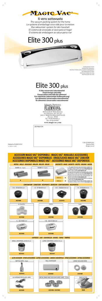 Elite 300 plus ISTRUZIONI D’USO OPERATING MANUAL INSTRUCTIONS SUR LE FONCTIONNEMENT BETRIEBSANLEITUNG INSTRUCCIONES DE USO INSTRUÇOES DE USO Elite 300 plus Il cibo conservato naturalmente! Food storage naturally! Conservation naturelle des aliments! Für natürliche Lebensmittel-Aufbewahrung! Los alimentos conservados naturalmente! Os alimentos conservados naturalmente! Fabbricante / Manufacturer: Elettromedicali / Elettrodomestici Via Colli Storici, 221, 223, 225 25015 S. MARTINO DELLA BATTAGLIA (Brescia) - ITALY Tel. +39 030 9910168 r.a. Fax +39 030 9910287 www.magicvac.com DISTRIBUTOR: © 2011 FLAEM NUOVA® Printed in ITALY All rights reserved Published by FLAEM NUOVA® cod. 14099A0-0 rev. 06/2012 ACCESSORI MAGIC VAC® DISPONIBILI - MAGIC VAC® AVAILABLE ACCESSORIES ACCESSOIRES MAGIC VAC® DISPONIBLES - ERHÄLTLICHES MAGIC VAC® ZUBEHÖR ACCESORIOS DISPONIBLES MAGIC VAC® - ACESSÓRIOS MAGIC VAC® DISPONÍVEIS ROTOLI - ROLLS - ROULEAUX - ROLLEN - ROLLOS - ROLOS 20x600 cm - 2 pcs. SACCHETTI - BAGS - SACHETS - BEUTEL - BOLSAS - SACOS 30x600 cm -2 pcs. 20x30 cm * * 30x40 cm * * * Per maggiori informazioni sugli articoli illustrati rivolgetevi al Vs. Rivenditore di fiducia o visitate il sito internet www.magicvac.com For additional information on these products please contact your Dealer or visit our website www.magicvac.com Pour toute information ultérieure sur ces produits veuillez contacter votre Revendeur ou visiter notre site internet www.magicvac.com Möchten Sie noch mehr Infos über die illustrierten Artikel? Dann wenden Sie sich doch bitte an Ihren Vertrauenshändler oder besuchen Sie die Webseite www.magicvac.com Para más información sobre estos artículos pregunte a su distribuidor o visite el sitio web www.magicvac.com Para mais informações sobre os artigos ilustrados contacte o seu Revendedor de confiança ou visite o site Internet www.magicvac.com CONTENITORI - CANISTERS - RÉCIPIENTS - BEHÄLTER - CONTENEDORES - RECIPIENTES 1.5 L - Ø 22x10 (h) cm 2 L - Ø 18x16 (h) cm 2.5 L - 23x23x12 (h) cm 4 L - Ø 22x20 (h) cm ACO1004 ACO1003 ACO1073 ACO1002 3+1.5+0.75 L 1.5+2 L 2+4 L ACO1082 ACO1006 ACO1005 1L - 23x17x9(h) cm 1.5L - 23x17x12(h) cm ACO1093 ACO1092 COPERCHI - LIDS - COUVERCLES - DECKEL - TAPAS - TAMPAS SMALL UNIVERSAL LID Ø 4-9 cm LARGE UNIVERSAL LID Ø 4-12 cm ACO1012 ACO1011 ALTRI ACCESSORI - OTHER ACCESSORIES - AUTRES ACCESSOIRES - ANDERE ZUBEHÖRTEILE - OTROS ACCESORIOS - OUTRAS ACESSÓRIOS BOTTLE CAPS - 2 pcs ROLL DISPENSER LARGE VACUUM HOOD ACO1013 ACO1027 ACO1007 LID-OPENER FOR GLASS JARS METAL RIMS AND LIDS FOR GLASS JARS - 12 pcs BAG CUTTER ACO1055 ACO1054 / ACO1053 10039 (2) (8) (6) (3) (4) (5) (9) (10) (1) (7) I (1) (2) (3) (4) (5) (6) (7) (8) (9) (10) (11) (12) (13) Taglia sacchetto MAGIC Cutter Spia della saldatura SEAL Pulsante di saldatura MAN SEAL Coperchio Valvola manuale coperchio Presa aria per il tubetto Pulsanti LOCK Barra saldante Guarnizioni di tenuta Guarnizione sigillante Camera del vuoto a vaschetta Parte inferiore Piedini antislittamento (12) (13) GB F (1) (2) (3) (4) (5) (6) (7) (8) (9) (10) (11) (12) (13) (1) (2) (3) (4) (5) (6) (7) (8) (9) (10) (11) (12) (13) MAGIC Cutter SEAL indicator light MAN SEAL button Lid Lid manual valve Hose air inlet LOCK buttons Sealing bar Airtight gaskets Sealing gasket Vacuum chamber Lower part Non-slip feet (11) D MAGIC Cutter Témoin de soudure (SEAL) Bouton de soudure MAN SEAL Couvercle Valve manuelle couvercle Prise d'air pour le tuyau Bouton LOCK Barre de soudure Joints d'étanchéité Joint de compression Chambre du vide à bac Partie inférieure Patins antidérapants (1) (2) (3) (4) (5) (6) (7) (8) (9) (10) (11) (12) (13) E MAGIC Cutter SEAL Schweißanzeige MAN SEAL Schweißtaste Bedienungsklappe Manuelles Ventil der Bedienungsklappe Schlauchanschluss LOCK-Tasten Schweißbalken Dichtungen Schweifldichtung Vakuumkammer Unterteil Rutschfeste Füße P (1) (2) (3) (4) (5) (6) (7) (8) (9) (10) (11) (12) (13) Cortabolsa MAGIC Cutter Indicador de soldadura SEAL. Pulsador de soldadura MAN SEAL Tapa V·lvula manual tapa Toma de aire para el tubo Pulsadores LOCK Barra de soldadura Juntas herméticas Junta de cierre Cámara de vacío Parte inferior Soportes antideslizamiento (1) (2) (3) (4) (5) (6) (7) (8) (9) (10) (11) (12) (13) Cortante para sacos MAGIC Cutter Luz de soldadura SEAL Botão de soldadura MAN SEAL Tampa Válvula manual da tampa Tomada de ar para o tubo Botões LOCK Barra soldadora Juntas de vedação Junta de selagem Câmara de vácuo em bacia Parte inferior Pés anti-deslizamento MAX (1) B A C1 IN C2 D1 D2 (15) E1 (16) F E2 (17) (20) (18) (19) G1 G2 I1 I2 ® H I3 ® ® IL CONFEZIONAMENTO SOTTOVUOTO MAGIC VAC - THE MAGIC VAC VACUUM PACKING - LE CONDITIONNEMENT SOUS VIDE MAGIC VAC DIE MAGIC VAC -VAKUUMIERUNG - EL ENVASADO EN VACÍO MAGIC VAC - A EMBALAGEM EM VÁCUO MAGIC VAC ® ® ® Il seguente lavoro è il risultato della collaborazione tra la Divisione Ricerca e Sviluppo Flaem Nuova ed il Prof. Luciano Piergiovanni - Cattedra di "Tecnologie del Condizionamento e della Distribuzione dei prodotti agroalimentari" all'Università degli Studi di Milano. La qualità originale dell'alimento deve essere la migliore possibile, sia per quanto riguarda la sua freschezza, sia per quanto riguarda l'igiene dell'ambiente nel momento in cui si procede nelle fasi del confezionamento. Non esiste infatti alcuna tecnica di conservazione che possa trasformare un prodotto cattivo in uno buono. This manual is the product of collaboration between the Flaem Nuova Research and Development Division and Prof. Luciano Piergiovanni, Chair of "Agri-food product conditioning and distribution technologies" at Milan University. The original quality of the food must be of the very highest order, in terms of freshness and environmental hygiene, when you decide to vacuum pack it. There are in fact no preservation methods which will transform a poor product into a good one. Le travail suivant est le résultat de la collaborati