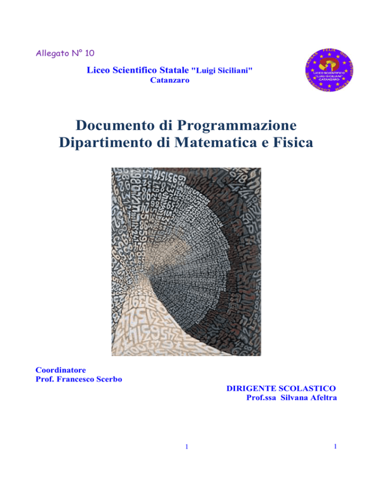 Allegato N° 10 Liceo Scientifico Statale "Luigi Siciliani" Catanzaro Documento di Programmazione Dipartimento di Matematica e Fisica Coordinatore Prof. Francesco Scerbo DIRIGENTE SCOLASTICO Prof.ssa Silvana Afeltra 1 1 Indice Indice Premessa 0. Risultati di apprendimento degli studenti del Liceo Scientifico 1. Progetto didattico 1.1 Finalità formative 2 2. Modalità d'insegnamento: programmazione modulare. 2.1 Principi della p. m. 2.2 Il modulo 10 10 10 3. Struttura modulare dei contenuti di Matematica e Fisica 3.1 Matematica biennio 3.2 Matematica triennio 3.3 Fisica Biennio 3.4 Fisica triennio 11 12 17 27 30 4. Metodologia 4.1 Approcci didattici, tipologia di attività e modalità di lavoro 4.2 Laboratorio di Fisica 36 36 37 5 .Strumenti di lavoro 5.1 Libro di testo, testi di lettura, di consultazione, dispense, fotocopie 5.2 Sussidi, audiovisivi, informatici e/o laboratori 37 37 37 6. Verifica dell'apprendimento 6.1 Modalità di verifica 6.2 Tipologie di prove 6.3 Griglie di valutazione 38 38 38 39 7. Valutazione 7.1 Parametri valutativi POF 40 41 8. Obiettivi Minimi e Valorizzazione delle Eccellenze 42 9. Collegamenti disciplinari 43 4 6 6 Premessa Gli ultimi anni sono stati nella scuola gli anni della "coscienza del cambiamento", gli anni in cui si è ravvisato e percepito il salto quantico della scuola rispetto al contesto sociale in cui essa opera, e di conseguenza il cambiamento che essa ha dovuto affrontare e maturare per continuare ad essere motore nella formazione del cittadino,seppur con difficoltà e con una certa lentezza. La sensibile attenzione mostrata dai docenti , durante i lavori del dipartimento, nasce dalla preoccupazione, di carattere generale, dell’abbassamento dei livelli di apprendimento della matematica e fisica degli studenti, che coinvolgendo tutte le scuole d’Italia, chiaramente tocca anche la nostra scuola. Così il basso livello di prestazione degli studenti italiani, rilevato dalle indagini PISA-OCSE, la disertazione dei corsi di laurea scientifici (matematica, fisica, chimica…) a livello nazionale, l’inadeguatezza della preparazione degli allievi in uscita dai licei rispetto alle competenze richieste dagli studi universitari, l’”allarme matematica “ lanciato dai Ministri della Pubblica Istruzione Fioroni e Gelmini sono fatti chiari che hanno portato i docenti a misurarsi con una riflessione seria ed approfondita sulle metodologie e sui contenuti di insegnamento. Le priorità che sono emerse durante la discussione sono state: 1. la qualità dell’insegnamento nelle classi che ha come conseguenze immediate i successi degli studenti in ambito universitario e la dispersione scolastica durante gli anni di corso del liceo; 2. la riflessione sull’etica e responsabilità professionale, che deve scaturire in un codice di comportamento deontologico. E’ stato quindi discusso l’intero impianto progettuale della programmazione annuale di matematica e fisica per il biennio e il triennio. In particolare per il biennio è stato discusso in modo dettagliato - Documento Tecnico allegato al Decreto Ministeriale del 22 Agosto2007 n° 139 “ Regolamento recante norme in materia di adempimento dell’obbligo di istruzione,ai sensi dell’art.1, comma 622, della legge del 27 dicembre 2006 n°296”; - Regolamento recante “Indicazioni nazionali riguardanti gli obiettivi specifici di apprendimento concernenti le attività e gli insegnamenti compresi nei piani degli studi previsti per i percorsi liceali di cui all’articolo 10, comma 3, del decreto del Presidente della Repubblica 15 marzo 2010, n. 89, in relazione all’articolo 2, commi 1 e 3, del medesimo regolamento.” “I percorsi liceali forniscono allo studente gli strumenti culturali e metodologici per una comprensione approfondita della realtà, affinché egli si ponga, con atteggiamento razionale, creativo, progettuale e critico, di fronte alle situazioni, ai fenomeni e ai problemi, ed acquisisca conoscenze, abilità e competenze sia adeguate al proseguimento degli studi di ordine superiore, all’inserimento nella vita sociale e nel mondo del lavoro, sia coerenti con le capacità e le scelte personali”. (art. 2 comma 2 del regolamento recante “Revisione dell’assetto ordinamentale, organizzativo e didattico dei licei…”). Il Dipartimento di Matematica e fisica del Liceo Scientifico “L. Siciliani” di Catanzaro condivide le indicazioni nazionali sulla formazione degli studenti e gli obiettivi. Per raggiungere questi risultati occorre il concorso e la piena valorizzazione di tutti gli aspetti del lavoro scolastico, declinato nel modo seguente: - lo studio delle discipline in una prospettiva sistematica, storica e critica; - la pratica dei metodi di indagine propri dei diversi ambiti disciplinari; - l’esercizio di lettura, analisi, traduzione di testi letterari, filosofici, storici, scientifici, saggist ici e di interpretazione di opere d’arte; - l’uso costante del laboratorio per l’insegnamento delle discipline scientifiche; - la pratica dell’argomentazione e del confronto; - la cura di una modalità espositiva scritta ed orale corretta, pertinente, efficace e personale; - l‘uso degli strumenti multimediali a supporto dello studio e della ricerca. 0. Risultati apprendimento degli studenti del Liceo Scientifico: A conclusione dei percorsi di ogni liceo gli studenti dovranno: 1. Area metodologica Aver acquisito un metodo di studio autonomo e flessibile, che consenta di condurre ricerche e approfondimenti personali e di continuare in modo efficace i successivi studi superiori, naturale prosecuzione dei percorsi liceali, e di potersi aggiornare lungo l’intero arco della propria vita. Essere consapevoli della diversità dei metodi utilizzati dai vari ambiti disciplinari ed essere in grado valutare i criteri di affidabilità dei risultati in essi raggiunti. Saper compiere le necessarie interconnessioni tra i metodi e i contenuti delle singole discipline. 2. Area logico-argom
