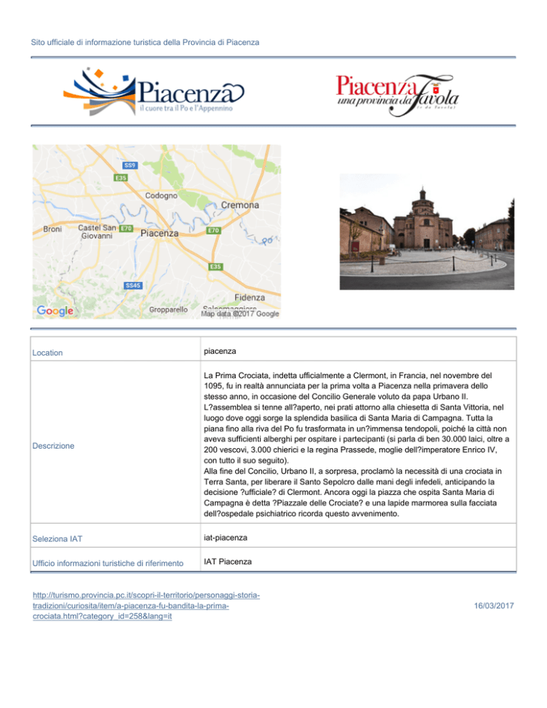 Sito ufficiale di informazione turistica della Provincia di Piacenza Location piacenza Descrizione La Prima Crociata, indetta ufficialmente a Clermont, in Francia, nel novembre del 1095, fu in realtà annunciata per la prima volta a Piacenza nella primavera dello stesso anno, in occasione del Concilio Generale voluto da papa Urbano II. L?assemblea si tenne all?aperto, nei prati attorno alla chiesetta di Santa Vittoria, nel luogo dove oggi sorge la splendida basilica di Santa Maria di Campagna. Tutta la piana fino alla riva del Po fu trasformata in un?immensa tendopoli, poiché la città non aveva sufficienti alberghi per ospitare i partecipanti (si parla di ben 30.000 laici, oltre a 200 vescovi, 3.000 chierici e la regina Prassede, moglie dell?imperatore Enrico IV, con tutto il suo seguito). Alla fine del Concilio, Urbano II, a sorpresa, proclamò la necessità di una crociata in Terra Santa, per liberare il Santo Sepolcro dalle mani degli infedeli, anticipando la decisione ?ufficiale? di Clermont. Ancora oggi la piazza che ospita Santa Maria di Campagna è detta ?Piazzale delle Crociate? e una lapide marmorea sulla facciata dell?ospedale psichiatrico ricorda questo avvenimento. Seleziona IAT iat-piacenza Ufficio informazioni turistiche di riferimento IAT Piacenza http://turismo.provincia.pc.it/scopri-il-territorio/personaggi-storiatradizioni/curiosita/item/a-piacenza-fu-bandita-la-primacrociata.html?category_id=258&lang=it 16/03/2017
