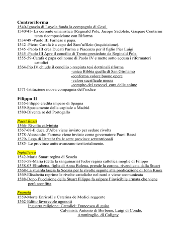 Controriforma 1540-Ignazio di Loyola fonda la compagnia di Gesù 1540/41- La corrente umanistica (Reginald Pole, Jacopo Sadoleto, Gaspare Contarini tenta ricomposizione con Riforma 1534/49 -Paolo III Farnese è papa. 1542 -Pietro Carafa è a capo del Sant’uffizio (inquisizione). 1545 -Paolo III crea Ducati Parma e Piacenza per il figlio Pier Luigi 1545 -Paolo III Apre il concilio di Trento presieduto da Reginald Pole. 1555-59-Carafa è papa col nome di Paolo IV e mette sotto accusa i riformatori cattolici 1564-Pio IV chiude il concilio :-respinta tesi dottrinali riforma -unica Bibbia quella di San Girolamo -conferma volore buone opere -valore sacrificale messa -compito dei vescovi cura delle anime 1571-Istituzione nuova compagnia dell’indice Filippo II 1555-Filippo eredita impero di Spagna 1559-Spostamento della capitale a Madrid 1580-Diventa re del Portogallo Paesi Bassi 1566- Rivolta calvinista 1567-68-Il duca d’Alba viene inviato per sedare rivolta 1578-Alessandro Farnese viene inviato come governatore Paesi Bassi 1579- Lega di Utrecht fra le sette province settentrionali 1585- Le province unite avanzano territorialmente. Inghilterra 1542-Maria Stuart regina di Scozia 1553-58-Maria (detta la sanguinaria)Tudor regina cattolica moglie di Filippo 1558-03 Elisabetta, figlia di Anna Bolena, prende la corona, rivendicata dalla Stuart 1568-La stuarda lascia la Scozia per le rivolte seguite alla predicazione di John Knox 1569-Elisabetta reprime le rivolte cattoliche nel nord e viene scomunicata 1588-Dopo l’uccisione della Stuart Filippo fa salpare l’invicibile armata che viene però sconfitta Francia 1559-Morte EnricoII e Caterina de Medici reggente 1562-Editto favorevole ugonotti Ia guerra religione: Cattolici: Francesco di guisa Calvinisti: Antonio di Borbone, Luigi di Condé, Ammiraglio di Coligny 1567/70-IIa e IIIa guerra di religione 1572-Durante il matrimonio fra il Borbone e la figlia di Caterina vengono sterminati gli ugonotti 1588-Enrico III teme congiura spagnoli e fa uccidere Enrico di Guisa 1589-Un cattolico uccide Enrico III, ed Enrico di Borbone si proclama re 1593-Enrico IV entra a Parigi dopo aver rinunciato al calvinismo 1598-Editto di Nantes con concessioni per città calviniste Conclusione conflitto con Spagna Guerra dei Trent’anni 1590-Rodolfo II pretende il cattolicesimo nei domini assurgici 1608-Rodolfo viene esonerato e ne prende il posto Mattia 1612- Mattia diviene re di Boemia dopo la morte di Rodolfo 1617-Gli stati elettivi di Boemia e Ungheria accettano come re Ferdinando di Stiria 23/05/18-defenestrazione di Praga 28/08/19- Ferdinando imperatore 22/08/19-La corona Boema passa da Ferdinando a Federico del Palatinato Lega cattolica: Sassonia, Impero, Baviera Leva evangelica: Palatinato, Transilvania, principi protestanti 1620- Ferdinando vince alla “montagna bianca” 1623- Ferdinando trasferisce il diritto di voto dal Palatinato alla Baviera 1624- Entra in guerra Cristiano di Danimarca 1629- Vittoria sui danesi ed editto di restituzione dei beni acquisiti dopo 1552 1630- Sbarca il re svedese Gustavo Adolfo in Pomerania 1631- Continue battaglie fra Svezia/Sassonia vs Impero 1632- Battaglia di Lutzen, vince Svezia ma muore re 1634- La guerra volge a favore asburgo 1635- Entra in guerra la Francia 1643- I francesi vincono gli spagnoli a Rocroi 1646- Gli svedesi penetrano in Baviera 24/10/1648- A Munster e Osnabruk si firma la pace di Westfalia -La Boemia rimane agli asburgo -Alla Svezia la Pomerania occ. Con voto in dieta -Partecipazione dieta anche alla Danimarca -Cessione dell’Alsazia alla Francia -Pomerania est al principe di Brandeburgo (Guglielmo Hollenzolner) -Duca di baviera elettore -Sapgna cede province unite 1659-Pace dei pirenei fra Francia e Spagna con piazzeforti per la prima Francia dopo Enrico IV 1610- Maria de Medici reggente 1614/15- Convocazione stati generali con Nobiltà toga 3° Stato 1624-Armand-Jean du Plessis, duca di Richelieu primo ministro 1626- Sollevazioni ugonotte 1627- Distruzione di La Rochelle 1636-37 Jacquerie nel meridione 1640- Lo stato francese ha creato burocrazia regia parallela a quella nobiliare