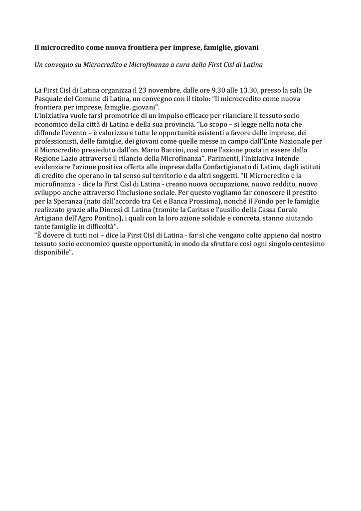 Il microcredito come nuova frontiera per imprese, famiglie, giovani Un convegno su Microcredito e Microfinanza a cura della First Cisl di Latina La First Cisl di Latina organizza il 23 novembre, dalle ore 9.30 alle 13.30, presso la sala De Pasquale del Comune di Latina, un convegno con il titolo: “Il microcredito come nuova frontiera per imprese, famiglie, giovani”. L’iniziativa vuole farsi promotrice di un impulso efficace per rilanciare il tessuto socio economico della città di Latina e della sua provincia. “Lo scopo – si legge nella nota che diffonde l’evento – è valorizzare tutte le opportunità esistenti a favore delle imprese, dei professionisti, delle famiglie, dei giovani come quelle messe in campo dall’Ente Nazionale per il Microcredito presieduto dall’on. Mario Baccini, così come l’azione posta in essere dalla Regione Lazio attraverso il rilancio della Microfinanza”. Parimenti, l’iniziativa intende evidenziare l’azione positiva offerta alle imprese dalla Confartigianato di Latina, dagli istituti di credito che operano in tal senso sul territorio e da altri soggetti. “Il Microcredito e la microfinanza - dice la First Cisl di Latina - creano nuova occupazione, nuovo reddito, nuovo sviluppo anche attraverso l’inclusione sociale. Per questo vogliamo far conoscere il prestito per la Speranza (nato dall’accordo tra Cei e Banca Prossima), nonché il Fondo per le famiglie realizzato grazie alla Diocesi di Latina (tramite la Caritas e l’ausilio della Cassa Curale Artigiana dell’Agro Pontino), i quali con la loro azione solidale e concreta, stanno aiutando tante famiglie in difficoltà”. “È dovere di tutti noi – dice la First Cisl di Latina - far sì che vengano colte appieno dal nostro tessuto socio economico queste opportunità, in modo da sfruttare così ogni singolo centesimo disponibile”.