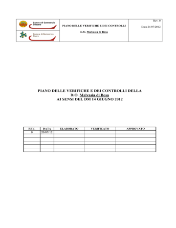 Rev. 0 PIANO DELLE VERIFICHE E DEI CONTROLLI Data 24/07/2012 D.O. Malvasia di Bosa PIANO DELLE VERIFICHE E DEI CONTROLLI DELLA D.O. Malvasia di Bosa AI SENSI DEL DM 14 GIUGNO 2012 REV. DATA 0 20/07/12 ELABORATO VERIFICATO APPROVATO Rev. 0 PIANO DELLE VERIFICHE E DEI CONTROLLI Data 24/07/2012 D.O. Malvasia di Bosa 1 2 3 4 5 6 7 8 9 10 Soggetto Fase di processo Requisiti Acquisizione documentazione (anche per via telematica) Attività di controllo Tipo di controllo Entità del controllo per anno Non conformità NC Gravità della NC Azione Correttiva I 10% Produzione delle uve a D.O. VITICOLTORE Rispetto delle regole del disciplinare di produzione Rispetto dei limiti di resa di uva per ettaro previsti dal disciplinare di produzione e dalla normativa nazionale e comunitaria Acquisizione della documentazione necessaria ai fini della verifica ispettiva Verifica presso le aziende viticole della persistenza delle condizioni per l'iscrizione allo schedario viticolo con la verifica dell’osservanza delle disposizioni di tipo agronomico previste nel disciplinare di produzione Verifica ispettiva annuale ante vendemmia presso le aziende viticole per stimare la resa di uva per ettaro Non rispondenza alle disposizioni di tipo agronomico previste dal disciplinare Lievi ai sensi dell’art. 4 comma 6.. Richiesta di adeguamento della produzione con presentazione della modifica del dato contenuto nello schedario viticolo Perdita dei requisiti tecnico produttivi per l’idoneità alla D.O. Non conformità già considerate lievi, che non sono state risolte con azioni correttive Supero resa massima consentita dalla normativa nazionale e comunitaria Grave Lieve Non conformità già considerate lievi che non sono state risolte con azioni correttive Grave Richiesta di adeguamento della produzione con presentazione di eventuale dichiarazione di rinuncia alla D.O. con riscontro con la dichiarazione vendemmiale e/o di produzione o con nuova visita ispettiva ante vendemmia Rev. 0 PIANO DELLE VERIFICHE E DEI CONTROLLI Data 24/07/2012 D.O. Malvasia di Bosa 1 2 3 4 5 6 Soggetto Fase di processo Requisiti Acquisizione documentazione (anche per via telematica) Attività di controllo Tipo di controllo Entità del controllo per anno D 100% Commercializzazione delle uve a D.O. INTERMEDIARI DELLE UVE DESTINATE ALLA VINIFICAZIONE Iscrizione all’Organismo di controllo Rispetto delle regole del disciplinare di produzione Invio da parte del destinatario della copia documento di trasporto delle uve destinate alla D.O. e delle comunicazioni relative ad altre operazioni che generano modifiche del carico contabile (riclassificazioni, ecc.) Acquisizione della documentazione necessaria ai fini della verifica ispettiva Rispetto della normativa nazionale e comunitaria sui documenti di trasporto e sulla tenuta dei registri di cantina Controllo ai fini della rispondenza quantitativa sulle movimentazione di carico e scarico delle uve destinate alla DO 7 8 9 10 Non conformità NC Gravità della NC Azione Correttiva Carenza documentazione; Errori formali relativi alla documentazione di carico e scarico delle uve destinate a D.O. Non conformità già considerate lievi, che non sono state risolte con azioni correttive Verifica ispettiva annuale presso le aziende intermediatrici, per accertare: - la corrispondenza quantitativa del prodotto detenuto con riscontro ai relativi documenti e registri di cantina - la rispondenza con i requisiti previsti dal disciplinare Lieve I 10% Errori formali relativi alla documentazione di carico e scarico delle uve destinate a DO o alla omessa o irregolare tenuta della contabilità obbligatoria Non rispondenza dei quantitativi detenuti con la documentazione e i registri di carico e scarico Grave Lieve Grave Non conformità già considerate lievi, che non sono state risolte con azioni correttive Non rispondenza dei requisiti previsti dal disciplinare di produzione Richiesta di adeguamento con presentazione e/o integrazione della documentazione relativa al carico di uva o errori formali, o quant’altro necessario alla risoluzione della N.C. rilevata con verifica di riscontro documentale Grave Richiesta di adeguamento con presentazione e/o integrazione della documentazione relativa al carico di vino o errori formali, o quant’altro necessario alla risoluzione della N.C. rilevata con nuova visita ispettiva Rev. 0 PIANO DELLE VERIFICHE E DEI CONTROLLI Data 24/07/2012 D.O. Malvasia di Bosa 1 2 3 4 5 6 Soggetto Fase di processo Requisiti Acquisizione documentazione (anche per via telematica) Attività di controllo Tipo di controllo Entità del controllo per anno D 100% Iscrizione all’Organismo di controllo Rispetto delle regole del disciplinare di produzione Invio da parte del destinatario della copia documento di trasporto dei vini a DO e atti alla DO commercializzati sfusi e delle comunicazioni delle movimentazioni e pratiche enologiche sul vino a DO e atto alla DO in grado di modificarne i carichi (tagli, assemblaggi, riclassificazioni, declassamenti, ecc.) Controllo ai fini della rispondenza quantitativa sui carichi e sulle movimentazioni dei vini a DO e atti alla DO 7 Verifica della coerenza dei carichi di vino a DO e atto alla DO con la dichiarazione vendemmiale e/o della dichiarazione di produzione Acquisizione della documentazione necessaria ai fini della verifica ispettiva Produzione Vino D.O. VINIFICATORE 10 Non conformità NC Gravità della NC Azione Correttiva Carenza documentazione Supero della resa di uva in vino in base a quanto stabilito dal disciplinare Lieve Richiesta di adeguamento con presentazione e/o integrazione della documentazione relativa al carico di vino o errori formali, o quant’altro necessario alla risoluzione della N.C. rilevata con verifica di riscontro documentale Grave Non conformità già considerate lievi, che non sono state risolte con azioni correttive Controllo ai fini della rispondenza quantitativa dei prodotti oggetto di prelevamento; IA 100% Effettuazione del prelevam