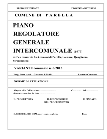REGIONE PIEMONTE PROVINCIA DI TORINO COMUNE DI P A R E L L A PIANO REGOLATORE GENERALE INTERCOMUNALE (1979) dell’ex consorzio fra i comuni di Parella, Loranzè, Quagliuzzo, Strambinello VARIANTE comunale n. 6/2013 Prog. Dott. Arch. Giovanni RESSIA Romano Canavese NORME DI ATTUAZIONE Allegato alla Deliberazione ............................ divenuta esecutiva in data ............................ IL PROGETTISTA IL RESPONSABILE DEL PROCEDIMENTO IL SEGRETARIO COM. : per copia conforme n° .............. del ...................... IL SINDACO Data: 0 NOTE: per la lettura, adozione ed esame del presente testo coordinato delle N.d.A. della Variante comunale n. 6/2013 al P.R.G.I. vigente del Comune di PARELLA. ****************************************************************************************** Nel presente testo: a) le norme immutate del P.R.G.I. vigente (nella forma della variante strutturale n. 4/2006) sono riportate con carattere normale; tali norme non sono oggetto di adozione in sede della presente Variante n. 6/2013; b) le integrazioni e modificazioni introdotte “ex officio” con l’approvazione della variante strutturale n. 4/2006 sono riportate in carattere grassetto corsivo; b) le norme vigenti e stralciate con la presente Variante n. 6/2013 sono riportate con carattere barrato (barrato); c) le nuove norme inserite con la presente Variante n. 6/2013 sono riportate con carattere grassetto; *************************** Con l'approvazione definitiva della Variante n. 6/2013 sia le presenti note così come l'evidenziazione formale delle aggiunte e detrazioni (caratteri barrati ed in grassetto) potranno essere eliminate dal testo senza ulteriori formalità salva l'integrità sostanziale dello stesso. 1 Titolo I - DISPOSIZIONI GENERALI Capo 1.1 - DISPOSIZIONI GENERALI Art. 1 (1) Le presenti norme dettano le prescrizioni per l'attuazione delle indicazioni del P.R.G.I. nel rispetto della normativa legislativa nazionale e regionale vigente. Art. 2 (1) (2) (3) (4) (5) (6) Oggetto delle norme Finalità, contenuti, arco temporale di previsione ed efficacia del P.R.G.I. Il P.R.G.I. redatto in conformità agli articoli 1 e 12 della L.R. 56/77, tende alla realizzazione delle finalità espresse nell'art. 11 suddetto per mezzo dei contenuti normativi e prescrittivi degli elaborati, interpretanti a livello locale quanto richiesto dall'art. 12 della L.R. 56/77. Le previsioni insediative del P.R.G.I. sono riferite ad un arco temporale quinquennale definite a decorrere dalla data della deliberazione programmatica. A norma dell'ultimo comma dell'art. 82 della L.R. 56/77, ad approvazione avvenuta del Piano Territoriale (P.T.), il P.R.G.I. dovrà essere adeguato alle previsioni dimensionali e strutturali indicate dal P.T. stesso. Ai sensi delle leggi nazionali e regionali vigenti in materia, la disciplina urbanistica ed edilizia dell'intero territorio dei Comuni consorziati: Parella, Loranzé, Quagliuzzo, Strambinello, è regolata dalle norme e prescrizioni contenute negli elaborati costituenti il Piano Regolatore Generale Intercomunale (P.R.G.I.); pertanto ogni attività comportante modificazione dell’uso del suolo, sia urbanistica che edilizia, del territorio dei Comuni oggetto del P.R.G.I., o comunque subordinata al conseguimento di titoli abilitativi all’attività edilizia deve essere compatibile con le norme e prescrizioni del P.R.G.I. stesso. Norme e prescrizioni hanno efficacia nei confronti di chiunque, soggetto pubblico o privato, proprietario o utente di immobili. Dalla data di adozione del progetto preliminare e definitivo del P.R.G.I., così come degli strumenti urbanistici ed amministrativi di attuazione si applicano le relative misure di salvaguardia di cui all'art. 58 della L.R. 56/77. 2 Art. 3 - Elaborati costituenti il P.R.G.I. (1) Il P.R.G.I. dei Comuni di Parella, Loranzé, Quagliuzzo e Strambinello è costituito dai seguenti elaborati: I - Relazione tecnica: tav. A Uso del suolo scala 1:5000 tav. B Uso del suolo urbanizzato Stato di conservazione scala 1:1000 B.1 Loranzé Piano B.4 Quagliuzzo B.2 Loranzé Alto. B.5 Strambinello B.3 Parella tav. C Uso del suolo urbanizzato. Destinazioni d'uso scala 1:1000 C.1 Loranzé Piano C.4 Quagliuzzo C.2 Loranzé Alto C.5 Strambinello C.3 Parella II tav. 1 - Inquadramento territoriale scala 1:25.000 tav. 2 - Vincoli scala 1:5.000 tav. 3 - Assetto generale - progetto scala 1:5.000 tav. 4 - Aree urbanizzate - progetto scala 1:1.000 4.d Quagliuzzo 4.a Loranzé Piano 4.b Loranzé Alto 4.e Strambinello 4.c1 Parella 4.f Strambinello-Ponte Preti 4.c2 Parella - aree produttive tav. 5/var4 - Aree Rr- Nr- Tipi di intervento III - Norme di Attuazione IV - Relazione geologica e suoi allegati V - Scheda quantitativa dei dati urbani (2) Gli elaborati elencati nella parte I hanno contenuto illustrativo, salvo i riferimenti prescrittivi contenuti nelle presenti norme. In caso di controversa interpretazione fra tavole in scala diversa, prevalgono le tavole in scala 1:1000; se fra le tavole o tabelle e le presenti norme prevalgono queste ultime. (3) Nella elencazione contenuta nel precedente 1° comma gli atti di Piano dell’originario P.R.G.I., riportati in carattere corsivo barrato, non interessano il territorio di Parella. 3 Capo I.2 - NATURA DELLE NORME E DEFINIZIONI Art. 4 - Natura delle norme (1) (2) (3) (4) (5) Nel complesso le norme del P.R.G.I. si possono distinguere secondo il loro carattere in: a) norme previsionali o di programma: quelle tese ad orientare programmaticamente l’attività del Comune; esse contengono in genere previsioni di strumenti esecutivi. b) norme prescrittive: quelle riferentesi alle modalità tipologie e vincoli d'intervento; esse possono riguardare sia le prescrizioni di titoli abilitativi diretti all’attività edilizia sia prescrizioni per la formazione di strumenti esecutivi, sia la localizzazione delle aree per infrastrutture, ecc. c) norme di gestione: quelle relative agli strumenti amministrativi di attuazione del 
