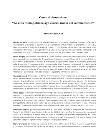 Corso di formazione “Le città metropolitane agli esordi: indizi del cambiamento” ELENCO DEI DOCENTI Alessandro Balducci è Prorettore Vicario del Politecnico di Milano e Professore Ordinario di Tecnica e Pianificazione Urbanistica al Dipartimento di Architettura e Studi Urbani. E’ presidente di Urban@it, Centro nazionale di studi per le politiche urbane. E’ coordinatore del progetto nazionale PRIN Postmetropolitan territories as emergent forms of urban space: coping with sustainability, habitability, and governance. Ha curato, con Raine Mäntysalo, Urban planning as a trading zone (Springer, 2013). Chiara Bologna è Ricercatore confermato di Diritto Pubblico Comparato presso l’Università di Bologna, dove insegna Diritto costituzionale. E’ stata Research Assistant presso l’Università di Harvard. E’ autrice di numerose pubblicazioni in materia di federalismo e regionalismo, libertà di espressione, protezione della democrazia. E’ componente della redazione della rivista Quaderni costituzionali (Il Mulino), per la quale cura le cronache costituzionali dagli Stati Uniti d’America. E’ stata parte di numerosi progetti di rilevante interesse nazionale. E’ attualmente parte del progetto Farb (Università di Bologna), dal titolo “Tecnocrazia e democrazia nella determinazione e gestione dell'indirizzo politico”. Tommaso Bonetti è Ricercatore di Diritto Amministrativo nell’Università IUAV di Venezia, dove insegna diritto amministrativo, urbanistico e del governo del territorio. È autore di numerose pubblicazioni in materia di procedimento amministrativo, motivazione del provvedimento, governo del territorio, urbanistica, infrastrutture, semplificazione amministrativa, servizi pubblici locali, società pubbliche, organizzazione sanitaria e contratti pubblici. È autore di una monografia dal titolo “Il diritto del «governo del territorio» in trasformazione. Assetti territoriali e sviluppo economico” (Editoriale scientifica, 2011). Vando Borghi è Professore Associato di Sociologia dei Processi Economici e del Lavoro all’Università di Bologna. E' responsabile scientifico aggiunto del Centro Internazionale di Studi Sociologici sui Problemi del Lavoro (C.I.Do.S.Pe.L.), vice-direttore della rivista “Sociologia del lavoro” e membro del comitato scientifico di “Partecipazione e conflitto” (Franco Angeli). Partecipa a Urban@it, Centro nazionale di studi per le politiche urbane. E' collaboratore del centro “Sui Generis - Laboratorio di ricerca sociale sull'azione pubblica”, Università Milano-Bicocca e membro dell'Active Social Policy European Network (A.S.P.E.N). Valentino Castellani, già Professore Ordinario di Costruzioni Elettriche e Prorettore del Politecnico di Torino (1981-1984), è stato Sindaco di Torino dal 1993 al 2001. Alla fine del suo secondo mandato di Sindaco si è impegnato a tempo pieno nel ruolo di Presidente del Comitato organizzatore dei Giochi olimpici invernali del 2006. E’ attualmente vice Presidente dell’Associazione Torino Internazionale, il cui compito è elaborare e promuovere il terzo piano strategico di Torino. Marco Cremaschi, già Professore Associato di Urbanistica all’Università di Roma Tre, dove ha coordinato il Dottorato “Progetto locale e politiche territoriali”, è stato recentemente nominato Professore presso l’Università Sciences Po di Parigi, dove dirigerà il Cycle d’Urbanisme. Partecipa al Dottorato in Studi Urbani del GSSI. E’ Presidente del Comitato Scientifico di Urban@it, Centro nazionale di studi per le politiche urbane. Ernesto d’Albergo è Professore Associato di Sociologia dei Fenomeni Politici all’Università Sapienza di Roma, partecipa al dottorato in Scienze Sociali Applicate. E’ componente della redazione della rivista online “Métropoles”, del comitato di coordinamento della collana “Sociologia politica” (Franco Angeli) e del comitato scientifico della “Rivista Italiana di Politiche Pubbliche” (Il Mulino). Partecipa a Urban@it, Centro nazionale di studi per le politiche urbane. Ha recentemente pubblicato Le città nell'agenda politica nazionale. Una comparazione nell'Europa occidentale (Franco Angeli, 2011), Il regime dell’Urbe. Politica, economia e potere a Roma (con G. Moini, Carocci, 2015) e Idee e interessi in una politica orientata al mercato: l’Agenda urbana e il paradigma Smart City in Italia, in G. Moini (a cura di), Neoliberismi e azione pubblica: il caso italiano (Ediesse, in stampa). Bruno Dente è Professore ordinario di analisi delle politiche pubbliche al Politecnico di Milano, consulente scientifico dell'Istituto per la ricerca sociale (IRS) e componente la Direzione scientifica della Fondazione universitaria per la formazione delle amministrazioni pubbliche (FUAP). Ha fatto parte del Comitato scientifico della Rete delle città strategiche (Recs) oggi confluita in ANCI. Ha recentemente pubblicato Le decisioni di policy (Il Mulino, 2011)". Daniele Donati è ricercatore confermato di Diritto Amministrativo presso l’Università di Bologna. Si è occupato dei diritti degli cittadini nei confronti del sistema sanitario, del principio di trasparenza e dei profili istituzionali connessi alla comunicazione e alle ICT. Inoltre ha studiato i processi di democrazia partecipativa e il principio di sussidiarietà orizzontale: su questo tema, ha pubblicato ilo volume “Il paradigma sussidiario - Interpretazioni, estensione e garanzie” (Il Mulino, 2013). Attualmente si occupa della riforma degli enti di area vasta e di pianificazione strategica nella sua declinazione giuridica. Dal 2011 è presidente del Comitato Scientifico per il Piano Strategico Metropolitano di Bologna. Marco Dugato è Professore ordinario di Diritto Amministrativo presso l’Università degli studi di Bologna e docente della Scuola di Specializzazione in studi sull’amministrazione pubblica (SPISA). E’ componente del board scientifico di Invitalia (Agenzia nazionale per l'attr