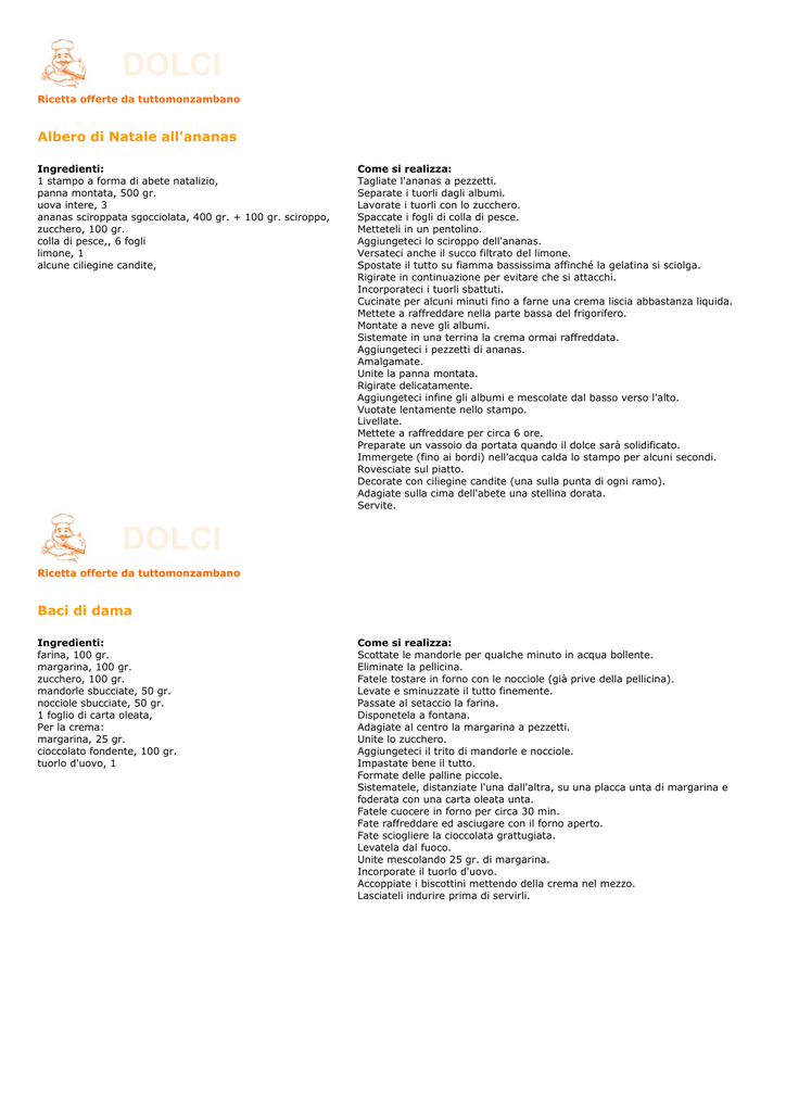 DOLCI Ricetta offerte da tuttomonzambano Albero di Natale all'ananas Ingredienti: 1 stampo a forma di abete natalizio, panna montata, 500 gr. uova intere, 3 ananas sciroppata sgocciolata, 400 gr. + 100 gr. sciroppo, zucchero, 100 gr. colla di pesce,, 6 fogli limone, 1 alcune ciliegine candite, Come si realizza: Tagliate l'ananas a pezzetti. Separate i tuorli dagli albumi. Lavorate i tuorli con lo zucchero. Spaccate i fogli di colla di pesce. Metteteli in un pentolino. Aggiungeteci lo sciroppo dell'ananas. Versateci anche il succo filtrato del limone. Spostate il tutto su fiamma bassissima affinché la gelatina si sciolga. Rigirate in continuazione per evitare che si attacchi. Incorporateci i tuorli sbattuti. Cucinate per alcuni minuti fino a farne una crema liscia abbastanza liquida. Mettete a raffreddare nella parte bassa del frigorifero. Montate a neve gli albumi. Sistemate in una terrina la crema ormai raffreddata. Aggiungeteci i pezzetti di ananas. Amalgamate. Unite la panna montata. Rigirate delicatamente. Aggiungeteci infine gli albumi e mescolate dal basso verso l'alto. Vuotate lentamente nello stampo. Livellate. Mettete a raffreddare per circa 6 ore. Preparate un vassoio da portata quando il dolce sarà solidificato. Immergete (fino ai bordi) nell'acqua calda lo stampo per alcuni secondi. Rovesciate sul piatto. Decorate con ciliegine candite (una sulla punta di ogni ramo). Adagiate sulla cima dell'abete una stellina dorata. Servite. DOLCI Ricetta offerte da tuttomonzambano Baci di dama Ingredienti: farina, 100 gr. margarina, 100 gr. zucchero, 100 gr. mandorle sbucciate, 50 gr. nocciole sbucciate, 50 gr. 1 foglio di carta oleata, Per la crema: margarina, 25 gr. cioccolato fondente, 100 gr. tuorlo d'uovo, 1 Come si realizza: Scottate le mandorle per qualche minuto in acqua bollente. Eliminate la pellicina. Fatele tostare in forno con le nocciole (già prive della pellicina). Levate e sminuzzate il tutto finemente. Passate al setaccio la farina. Disponetela a fontana. Adagiate al centro la margarina a pezzetti. Unite lo zucchero. Aggiungeteci il trito di mandorle e nocciole. Impastate bene il tutto. Formate delle palline piccole. Sistematele, distanziate l'una dall'altra, su una placca unta di margarina e foderata con una carta oleata unta. Fatele cuocere in forno per circa 30 min. Fate raffreddare ed asciugare con il forno aperto. Fate sciogliere la cioccolata grattugiata. Levatela dal fuoco. Unite mescolando 25 gr. di margarina. Incorporate il tuorlo d'uovo. Accoppiate i biscottini mettendo della crema nel mezzo. Lasciateli indurire prima di servirli. DOLCI Ricetta offerte da tuttomonzambano Befanini Ingredienti: farina, 250 gr. zucchero, 150 gr. burro, 75 gr. uova, 2 latte, 1/2 bicchiere circa lievito, 1/2 bustina rhum, 1/2 bicchierino scorza d'arancia, anacini (confettini colorati), sale, q.b. Come si realizza: Sistemate a fontana la farina. Lavoratela con il burro morbido. Unite lo zucchero e 2 uova. Aggiungeteci un cucchiaino di scorza d'arancia grattata e il lievito. Versateci il liquore e un pizzico di sale. Allungate con un po' di latte in modo da ottenere un composto omogeneo. Rimestate velocemente. Ricavatene una palla. Fate riposare per circa 30 min. in frigo. Spianate l'impasto con il matterello dandogli uno spessore di circa 4 millimetri. Tagliatelo con vari stampi. Imburrate una placca. Adagiateci i befanini. Pennellateli con un uovo sbattuto. Velateli con i confettini colorati. Cuocete in forno caldo, per circa 20 min. Levate una volta cotti. DOLCI Ricetta offerte da tuttomonzambano Biscotti alla canella Ingredienti: farina bianca, 100 gr. burro ammorbidito, 80 gr. zucchero a velo, 40 gr. + q.b. per guarnire 2 tuorli d'uovo sodo, la buccia grattugiata di 1/2 limone cannella in polvere, 1 cucchiaino Come si realizza: Passate al setaccio i tuorli d'uovo. Passate anche la farina al setaccio. Sistematela a fontana su una base di lavoro. Adagiate il burro a pezzetti al centro della fontana. Unite lo zucchero a velo. Aggiungeteci la cannella e i tuorli d'uovo passati. Lavorate l'impasto velocemente. Ricoprite il tutto con della pellicola trasparente. Sistemate l'impasto nella parte meno fredda del frigorifero. Lasciate riposare per 3 ore circa. Riprendete l'impasto trascorso il tempo. Spianatelo con il matterello dandogli un'altezza di 3 mm. Usate un tagliapasta o uno stampo e date forma ai biscotti. Sistemateli in una placca precedentemente imburrata e infarinata. Spostateli in forno già caldo a 180°C. per 15 min. circa. Verificate la cottura. Levate e fate freddare. Velate con zucchero a velo. Servite. DOLCI Ricetta offerte da tuttomonzambano Biscotti Cantucci Ingredienti: farina, 1 kg. uova intere, 10 zucchero semolato, 600 gr. mandorle grezze, 800 gr. lievito chimico, 40 gr. miele o malto, 15 gr. vanillina, Come si realizza: Montare le uova con lo zucchero e il miele. Unire il resto degli ingredienti. Mescolare con le mani. Fare delle strisce su una teglia rivestita con un foglio di carta da forno. Spennellare con dell'uovo sbattuto. Infornare a 220°C per 10 minuti. Abbassare il forno a 205° fino a cottura completa. Appena tolti dal forno tagliare le strisce a forma obliqua, quasi rettangolare. DOLCI Ricetta offerte da tuttomonzambano Buccellato di Lucca Ingredienti: farina, 250 gr. zucchero, 75 gr. burro, 25 gr. lievito di birra, 10 gr. uova, 1 + tuorlo per spennellare latte, 1/2 bicchiere uvetta, 25 gr. semi di anice, 1 cucchiaino sale, q.b. Come si realizza: Lavorate la farina con lo zucchero. Incorporateci l'uovo, il burro ammorbidito. Versate il latte, un pizzico di sale e il lievito sciolto in poca acqua tiepida. Impastate bene ottenendo una specie di pasta da pane. Aggiungeteci l'uvetta e i semi d'anice pestati. Formate una palla. Sistematela a lievitare, in luogo tiepido. Coprite con un panno. Ricavate dalla pasta dei filoncini e con un coltello fate un taglio per il lungo in superficie. Fate riposare ancora per circa 60 min. in un luogo tiepido. Pennellate