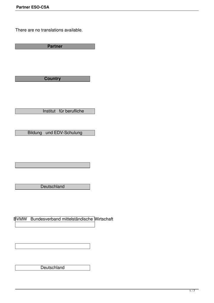 Partner ESO-CSA There are no translations available. Partner Country Institut für berufliche Bildung und EDV-Schulung Deutschland BVMW Bundesverband mittelständische Wirtschaft Deutschland 1/7 Partner ESO-CSA DIHK Gesellschaft für berufliche Bildung Deutschland IHK Bildungszentrum Cottbus GmbH Deutschland Sanierungsgesellschaft Lauchhammer mbH Deutschland Wirtschaftsförderungsinstitut Wirtschaftskammer WIFI Österreich Netzwerk UTC Unternehmensberatung Training, Coaching, Mediation Österreich 2/7 Partner ESO-CSA EUROCHAMBRES Association of European Chambers Of Commerce and Industry Belgique/België UEAPME Akademie Avignon of Craft and SMEs for Europe France z & z Alliance Management Consultants Ltd. 3/7 Partner ESO-CSA Kypros ATHENA Association for Education and Development of Women Česká republika Hospodářská komora Moravskoslezského kraje Česká republika Visiolink Oy Suomi/Finland 4/7 Partner ESO-CSA Chambre de Commerce Et d’Industrie de Perpignan France EPICENTRE Training Organisation Ελλάδα AGFOL sc agenzia formazione lavoro Italia 5/7 Partner ESO-CSA Unione Regional e delle Camere Industria, Artigianato Agricoltura del Veneto Parco Scientifico e Tecnologico Vega – edificio Lybra Italia CEDOZ – Centrum Doskonalenia Zarzadzania Polska Nervir Associacao Empresarial 6/7 Partner ESO-CSA Portugal SPI Inovação Portugal Canterbury United Christ Chu KIngdom 7/7