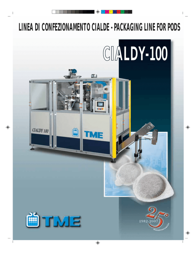 C M Y CM MY CY CMY K LINEA DI CONFEZIONAMENTO CIALDE - PACKAGING LINE FOR PODS CIALDY-100 CIALDY -100 C M Y CM MY CY CMY K LINEA DI CONFEZIONAMENTO CIALDE - PACKAGING LINE FOR PODS CIALDY-100 CIALDY -100 CIALDY 100 è una macchina per confezionamento in cialde monodose di caffè e assimilabili di buona velocità e allo stesso tempo semplice e affidabile, nata dall'esperienza di produzione di centinaia di macchine similari. CIALDY 100 is a packaging machine for single-dose coffee pods and similar products, conceived on the experience of hundreds of similar machines. Its main advantages are good speed, ease of use and reliability. CIALDY 100 prepara le cialde e poi le confeziona singolarmente in un incarto ad atmosfera controllata. CIALDY 100, disponibile anche in versione con incarto multiplo, trova la sua applicazione ideale nel confezionamento di cialde monodose di caffè, orzo, tè, tisane, nei formati più diffusi, nella versione a cialda rigida e a cialda morbida. CIALDY 100 prepares pods and then wraps them singularly inside a pack under a controlled atmosphere. CIALDY 100 is available also with multiple wrapping version and it is suitable to pack single-dose pods of coffee, barley, tea, infusions, with different sizes, both with hard pod and soft pod. Il cuore della macchina è costituito da una movimentazione meccanica di alta qualità accompagnata alla versatilità e all'affidabilità delle motorizzazioni brushless, il pannello di comando è dotato di Touch-Screen che ne permette un controllo semplice e intuitivo. The heart of the machine is composed by a high quality mechanical movement together with versatility and reliability of brushless motorisations; command panel is equipped with Touch Screen that allows an easy and intuitive control. The dose of product, duly pressed according demands, is deposited on to the filter paper and after an accurate cleaning of possible residuals, it is covered by the second sheet of filter paper and then sealed. Thanks to these operations pods are always perfect, with no powder in the sealing. La dose di prodotto, opportunamente compattata secondo le esigenze, viene depositata su una sede già preformata di carta filtro e, dopo un'accurata pulizia dai possibili residui, si procede alla copertura col secondo foglio di carta filtro e alla successiva saldatura. Tali operazioni fanno sì che le cialde risultino sempre perfette, senza alcuna presenza di polveri nella saldatura. This integrated system packs immediately under controlled atmosphere one or more pods inside each pack and then the counter-piece makes the count for eventual final cartooning precise. The machine can be equipped with a modem connection for on-line assistance. 545 100 1767 2422,5 2350 3975 2745 La macchina può essere dotata di un collegamento modem per la teleassistenza. 4900 Questa sistema integrato confeziona immediatamente in atmosfera controllata una o più cialde in ciascun incarto e il successivo contapezzi ne facilita l'eventuale incartonamento finale. 3557 07/07 244 3065 CARATTERISTICHE TECNICHE: • Produzione max: 100 cialde al minuto • Tolleranza peso: +/- 0,2 g • Peso dose caffè: 6-15 g • Tensione di alimentazione: 400V 50Hz Trifase • Potenza assorbita: 10 kW • Alimentazione pneumatica: 6 Bar. 1678 400 1678 4600 TECHNICAL FEATURES: • Output: Max 100 pods/min • Accuracy : ±0,2 g • Coffee dose weight: 6-15 g • Power supply: 400V 50Hz Three-phase • Power Absorption: 10 kW • Pneumatic supply: 6 Bar. S.r.l. Via S. Pertini, 1/5 - 43036 FIDENZA - Parma - ITALY - Tel. +39 0524 517711 - Fax + 39 0524 527771 http://www.tmeitaly.com - Email: [email protected]