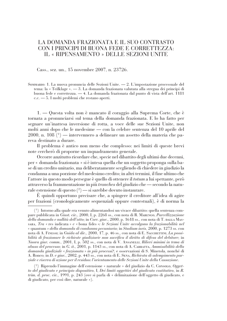 LA DOMANDA FRAZIONATA E IL SUO CONTRASTO CON I PRINCIPI DI BUONA FEDE E CORRETTEZZA: IL « RIPENSAMENTO » DELLE SEZIONI UNITE Cass., sez. un., 15 novembre 2007, n. 23726. Sommario: 1. La nuova pronuncia delle Sezioni Unite. — 2. L’impostazione processuale del tema: la « Teilklage ». — 3. La domanda frazionata valutata alla stregua dei principi di buona fede e correttezza. — 4. La domanda frazionata dal punto di vista dell’art. 1181 c.c. — 5. I molti problemi che restano aperti. 1. — Questa volta non è mancato il coraggio alla Suprema Corte, che è tornata a pronunciarsi sul tema della domanda frazionata. E lo ha fatto per segnare un’inattesa inversione di rotta, a voce delle sue Sezioni Unite, non molti anni dopo che le medesime — con la celebre sentenza del 10 aprile del 2000, n. 108 (1) — intervennero a delineare un assetto della materia che pareva destinato a durare. Il problema è antico non meno che complesso: nei limiti di queste brevi note cercherò di proporne un inquadramento generale. Occorre anzitutto ricordare che, specie nel dibattito degli ultimi due decenni, per « domanda frazionata » si è intesa quella che un soggetto proponga sulla base di un credito unitario, ma deliberatamente scegliendo di chiedere in giudizio la condanna a una porzione del medesimo credito; in altri termini, il fine ultimo che l’attore in questo modo persegue è quello di ottenere il totum a lui spettante, però attraverso la frammentazione in più tranches del giudizio che — secondo la naturale estensione di questo (2) — si sarebbe dovuto instaurare. È quindi opportuno precisare che, a spingere il creditore all’idea di agire per frazioni (cronologicamente sequenziali oppure contestuali), è di norma la ( 1 ) Intorno alla quale era venuto alimentandosi un vivace dibattito: quella sentenza compare pubblicata in Giust. civ., 2000, I, p. 2268 ss., con nota di R. Marengo, Parcellizzazione della domanda e nullità dell’atto; in Corr. giur., 2000, p. 1618 ss., con nota di T. dalla Massara, Tra « res iudicata » e « bona fides »: le Sezioni Unite accolgono la frazionabilità nel « quantum » della domanda di condanna pecuniaria; in Studium iuris, 2000, p. 1273 ss. con nota di A. Finessi; in Guida al dir., 2000, 17, p. 46 ss., con nota di E. Sacchettini, La possibilità di frazionare le richieste giudiziarie non sacrifica il diritto di difesa del debitore; in Nuova giur. comm., 2001, I, p. 502 ss., con nota di V. Ansanelli, Rilievi minimi in tema di abuso del processo; in G. it., 2001, p. 1143 ss., con nota di A. Carratta, Ammissibilità della domanda giudiziale « frazionata » in più processi?, e osservazioni di S. Minetola, nonché di A. Ronco; in D. e giur., 2002, p. 443 ss., con nota di E. Sena, Richiesta di adempimento parziale e riserva di azione per il residuo: l’orientamento delle Sezioni Unite della Cassazione. ( 2 ) Riprendo l’immagine dell’estensione « naturale » del giudizio da C. Consolo, Oggetto del giudicato e principio dispositivo, I, Dei limiti oggettivi del giudicato costitutivo, in R. trim. d. proc. civ., 1991, p. 243 (ove si parla di « delimitazione dell’oggetto di giudicato, e di giudicato, per così dire, naturale »). 346 RIVISTA DI DIRITTO CIVILE volontà di adire per ciascun procedimento un organo investito di competenza inferiore per valore: e così, in particolare, la segmentazione della domanda offre all’attore la possibilità di avvantaggiarsi dei tratti di maggiore informalità e speditezza che connotano il giudizio davanti al giudice di pace, a preferenza del tribunale (in effetti, dopo l’obliterazione delle preture, è questo l’unico caso prospettabile di — potremmo dire — forum shopping quanto a competenza per valore). Al di fuori di quest’ipotesi, si può immaginare che l’attore intraveda nel frazionamento della domanda i diversi vantaggi collegabili alla proposizione di una causa « pilota » (3). Ebbene, il nuovo intervento delle Sezioni Unite (4) trae origine da quattro ricorsi diretti per cassazione, promossi da una società (la si chiami qui Alfa) creditrice nei confronti di un’altra società (questa sia detta Beta), aventi per oggetto altrettante sentenze rese dal Giudice di pace di Giulianova, in esito a distinti procedimenti per decreto ingiuntivo (che non furono mai riuniti), ciascuno per porzioni del quantum totale, avviati da Alfa. Vale la pena di aggiungere che, essendo ciascuno dei quattro giudizi sulle singole porzioni del credito di valore inferiore ai 1100 euro, le sentenze furono pronunciate secondo equità proprio per ragioni di valore (dunque ai sensi dell’art. 113, comma 2o, c.p.c.). Il Giudice di pace diede accoglimento alle opposizioni proposte da Beta avverso i decreti ingiuntivi emessi in favore di Alfa: nella specie, quei decreti furono revocati sul presupposto della contrarietà a buona fede e correttezza del comportamento consistente nell’« aver chiesto ed ottenuto un distinto decreto ingiuntivo per ogni fattura (o gruppo di fatture) non pagata, ben potendo essa chiedere un solo decreto ingiuntivo per la totalità del preteso credito ». Peraltro, va subito detto che il medesimo giudice — non in sede monitoria — ritenne poi di accogliere le pretese creditorie, con conseguente condanna del debitore al pagamento dell’intero suo credito, decidendo tuttavia di compensare le spese di lite. Dunque, i quattro ricorsi proposti da Alfa (introduttivi di altrettanti procedimenti per cassazione non ancora rimodellati secondo il d. legisl. 40 del 2006) erano in effetti riferibili soltanto alla decisione in punto di attribuzione delle spese di lite. Tali impugnazioni (che, per la consolidata opinione sui limiti del giudizio per cassazione ex art. 360, n. 3, c.p.c. in ordine a una pronuncia resa secondo equità ai sensi dell’art. 113 c.p.c., avrebbero dovuto basarsi su una « macroscopica » violazione di norme di diritto, da valutarsi alla stregua della Costi( 3 ) Così, si potre
