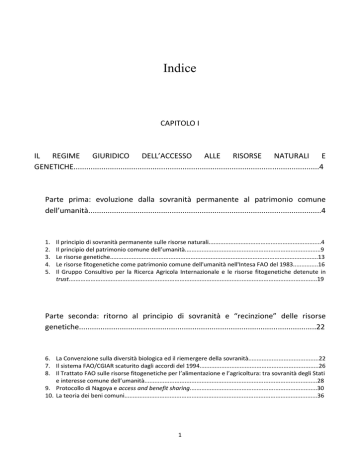 Indice CAPITOLO I IL REGIME GIURIDICO DELL’ACCESSO ALLE RISORSE NATURALI E GENETICHE...................................................................................................................4 Parte prima: evoluzione dalla sovranità permanente al patrimonio comune dell’umanità.............................................................................................................4 1. 2. 3. 4. 5. Il principio di sovranità permanente sulle risorse naturali...................................................................4 Il principio del patrimonio comune dell’umanità.................................................................................9 Le risorse genetiche............................................................................................................................13 Le risorse fitogenetiche come patrimonio comune dell'umanità nell'Intesa FAO del 1983...............16 Il Gruppo Consultivo per la Ricerca Agricola Internazionale e le risorse fitogenetiche detenute in trust....................................................................................................................................................19 Parte seconda: ritorno al principio di sovranità e “recinzione” delle risorse genetiche...............................................................................................................22 6. La Convenzione sulla diversità biologica ed il riemergere della sovranità..........................................22 7. Il sistema FAO/CGIAR scaturito dagli accordi del 1994.......................................................................26 8. Il Trattato FAO sulle risorse fitogenetiche per l’alimentazione e l’agricoltura: tra sovranità degli Stati e interesse comune dell’umanità.......................................................................................................28 9. Protocollo di Nagoya e access and benefit sharing............................................................................30 10. La teoria dei beni comuni...................................................................................................................36 1 CAPITOLO II LA PROTEZIONE DELLA PROPRIETÀ INTELLETTUALE SULLA MATERIA VIVENTE NEL DIRITTO INTERNAZIONALE..........................................................................................40 1. 2. 3. 4. 5. Il brevetto: cenni storici......................................................................................................................40 Considerazioni economiche sui brevetti.............................................................................................44 Dal brevetto alla privativa per ritrovati vegetali.................................................................................47 E` vivente ma è brevettabile...............................................................................................................54 La revisione della Convenzione UPOV................................................................................................58 CAPITOLO III LA TUTELA BREVETTUALE DELLE INVENZIONI BIOTECNOLOGICHE NELL’ACCORDO TRIPS...........................................................................................................................62 1. 2. 3. 4. L’Accordo TRIPs: obiettivi...................................................................................................................62 I requisiti sostanziali per la protezione brevettuale...........................................................................64 Il principio della brevettabilità in ogni settore tecnologico................................................................68 L’articolo 27 paragrafo 3 dell’Accordo TRIPs: le eccezioni alla brevettabilità di biotecnologie animali e vegetali.............................................................................................................................................72 5. La clausola dell’ordine pubblico..........................................................................................................74 6. Gli Accordi TRIPs-plus.........................................................................................................................78 2 CAPITOLI IV IL QUADRO NORMATIVO EUROPEO IN MATERIA DI TUTELA DELLA PROPRIETÀ INTELLETTUALE SULLE BIOTECNOLOGIE.....................................................................82 1. 2. 3. 4. 5. La privativa comunitaria per ritrovati vegetali....................................................................................82 La Direttiva 98/44/CE e la protezione delle invenzioni biotecnologiche............................................89 Le norme della Direttiva sulle varietà vegetali...................................................................................93 L’estensione della tutela brevettuale.................................................................................................99 La brevettabilità delle sequenze genetiche: l’interpretazione della Direttiva 98/44/CE nella sentenza Monsanto Technology......................................................................................................................102 CAPITOLO V APPROPRIAZIONE DI GENI E FURTI DI CONOSCENZA: IL FENOMENO DELLA BIOPIRATERIA...........................................................................................................110 1. 2. 3. 4. 5. Biopirateria e diritto internazionale.................................................................................................110 Il brevetto sul fagiolo giallo...............................................................................................................113 La richiesta di esame del brevetto su “Enola” dell’International Center for Tropical Agricolture....116 La protezione giusta ed adeguata dei ritrovati che utilizzano materiale genetico...........................119 Sovranità permanente e risorse condivi