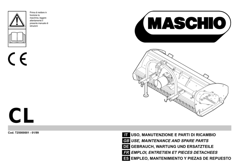 Prima di mettere in funzione la macchina, leggere attentamente il presente manuale di istruzioni CL Cod. T25000001 - 01/99 IT GB DE FR ES USO, MANUTENZIONE E PARTI DI RICAMBIO USE, MAINTENANCE AND SPARE PARTS GEBRAUCH, WARTUNG UND ERSATZTEILE EMPLOI, ENTRETIEN ET PIECES DETACHEES EMPLEO, MANTENIMIENTO Y PIEZAS DE REPUESTO ITALIANO ENGLISH FRANÇAIS DEUTSCH ESPAÑOL INDICE TABLE OF CONTENTS INHALTSVERZEICHNIS INDEX ÍNDICE Caratteristiche tecniche ................. 3 Sezione 1: Descrizione e Caratteristiche principali 1.1 Premessa ............................. 5 1.2 Garanzia ............................... 7 1.2.1 Esclusione della garanzia ..... 7 1.3 Descrizione della macchina e impiego .............................. 8 1.4 Identificazione ...................... 9 1.5 Livello sonoro ....................... 9 Sezione 2: Norme di sicurezza generali 2.1 Sicurezza ............................ 10 2.1.1 Terminologia adottata ......... 12 2.2 Segnali di sicurezza ........... 13 2.2.1 Segnali di avvertenza ......... 15 2.2.2 Segnali di pericolo .............. 15 2.2.3 Segnali di indicazione ......... 16 2.3 Abbigliamento ..................... 16 2.4 Ecologia e inquinamento .... 17 2.5 Uso in sicurezza ................. 17 2.6 Manutenzione in sicurezza . 26 Sezione 3: Movimentazione e trasporto 3.1 Trasporto ............................ 27 Sezione 4: Uso del trinciastocchi 4.1 Prima dell'uso ..................... 30 4.1.1 Albero cardanico ................ 30 4.2 Uso della macchina ............ 32 4.2.1 Posizione di lavoro ............. 33 4.3 Applicazione al trattore ....... 34 4.4 In lavoro .............................. 37 4.4.1 Come si lavora ................... 38 4.4.2 Regolazione dell'altezza di lavoro .................................. 40 4.4.3 Ruote posteriori (opzionali) 40 4.5 Coltelli ................................. 41 4.5.1 Sostituzione coltelli ............. 42 4.6 Trasmissione laterale ......... 44 4.6.1 Sostituzione cinghie ........... 44 4.7 Consigli utili per il trattorista 46 4.8 Parcheggio ......................... 47 Sezione 5: Manutenzione 5.1 Manutenzione ..................... 48 5.2 Ogni 8 ore di lavoro ............ 49 5.3 Ogni 50 ore di lavoro .......... 49 5.4 Ogni 400 ore di lavoro ........ 49 5.5 Lubrificazione ..................... 50 5.6 Messa a riposo ................... 51 5.7 Inconvenienti e cause ......... 52 Sezione 6: Ricambi 6.1 Parti di ricambio .................. 57 2 Technical characteristics ................ 3 Section 1: Description and principal characteristics 1.1 Premise ................................ 5 1.2 Warranty ............................... 7 1.2.1 Exclusions in warranty .......... 7 1.3 Description of the machine and use ................................. 8 1.4 Identification ......................... 9 1.5 Sound level ........................... 9 Section 2: General safety rules 2.1 Safety .................................. 10 2.1.1 Terminology adopted .......... 12 2.2 Safety signals ..................... 13 2.2.1 Warning signals .................. 15 2.2.2 Danger signals ................... 15 2.2.3 Indication signals ................ 16 2.3 Clothing .............................. 16 2.4 Ecology and pollution ......... 17 2.5 Safe use ............................. 17 2.6 Safe maintenance .............. 26 Section 3: Handling and Transport 3.1 Transport ............................ 27 Section 4: Use of shredder 4.1 Prior to usie ........................ 30 4.1.1 Cardan shaft ....................... 30 4.2 Use of the machine ............ 32 4.2.1 Working position ................. 33 4.3 Hooking-up to tractor .......... 34 4.4 At work ............................... 37 4.4.1 How to work ........................ 38 4.4.2 Regulation of working height .. 40 4.4.3 Rear wheels (optional) .......... 40 4.5 Blades ................................ 41 4.5.1 Replacing blades ................ 42 4.6 Side transmission ............... 44 4.6.1 Replacing belts ................... 44 4.7 Useful advice for the tractor driver ....................... 46 4.8 Parking ............................... 47 Section 5: Maintenance 5.1 Maintenance ....................... 48 5.2 Every 8 hours of work ......... 49 5.3 Every 50 hours of work ....... 49 5.4 Every 400 hours of work ..... 49 5.5 Lubrication .......................... 50 5.6 Storing the machine in off-seasons ......................... 51 5.7 Inconveniences and causes 53 Section 6 : Spare parts 6.1 Spare parts ......................... 57 Technische Eigenschaften ............. 3 Kapitel 1: Beschreibung und allgemeine Merkmale 1.1 Vorwort .................................. 5 1.2 Garantie ................................ 7 1.2.1 Verfall des Garantieanspruchs . 7 1.3 Beschreibung der Maschine und deren Anwendung .......... 8 1.4 Kennzeichnung ..................... 9 1.5 Geräuschbelastung ............... 9 Kapitel 2: Allgemeine Sicherheitsvorschriften 2.1 Sicherheit ............................ 10 2.1.1 Angewandte Terminologie .. 12 2.2 Sicherheitssignale ............... 13 2.2.1 Warnsignale ........................ 15 2.2.2 Gefahrensignale .................. 15 2.2.3 Hinweissignale .................... 16 2.3 Bekleidung .......................... 16 2.4 Umweltschutz ...................... 17 2.5 Maschinenbetrieb bei völliger Sicherheit ................ 17 2.6 Wartung bei völliger Sicherheit 26 Kapitel 3: Beförderung und Transport 3.1 Transport ............................. 27 Kapitel 4: Anwendung der Häckselmaschine 4.1 Vor der Inbetriebnahme ...... 30 4.1.1 Kardanwelle ........................ 30 4.2 Anwendung der Maschine .. 32 4.2.1 Betriebsposition .................. 33 4.3 Anschluß an den Traktor ..... 34 4.4 In Betrieb ............................. 37 4.4.1 Wie man mit der Maschine arbeitet ................................ 38 4.4.2 Einstellen der Schnitthöhe .. 40 4.4.3 Hinterränder (optional) ........ 40 4.5 Messer ................................ 41 4.5.1 Auswechseln der Messer .... 42 4.6 Seitliche