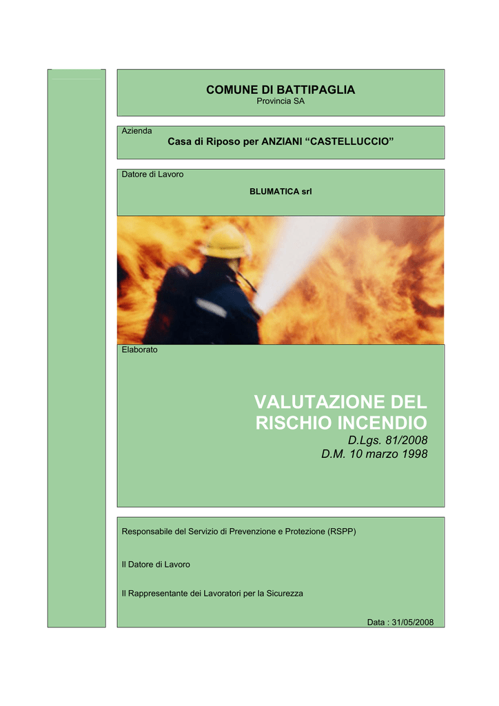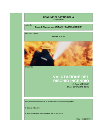 COMUNE DI BATTIPAGLIA Provincia SA Azienda Casa di Riposo per ANZIANI “CASTELLUCCIO” Datore di Lavoro BLUMATICA srl Elaborato VALUTAZIONE DEL RISCHIO INCENDIO D.Lgs. 81/2008 D.M. 10 marzo 1998 Responsabile del Servizio di Prevenzione e Protezione (RSPP) Il Datore di Lavoro Il Rappresentante dei Lavoratori per la Sicurezza Data : 31/05/2008 DOCUMENTO DI VALUTAZIONE DEL RISCHIO Art. 2 D.M. 10 marzo 1998 PREMESSA Il presente documento è stato redatto ai sensi del D.Lgs. 81/08 e dell’articolo 2, comma 1, del Decreto Ministeriale 10 marzo 1998 e sintetizza il complesso delle operazioni svolte ai fini della valutazione del rischio d’incendio.. Il documento si articola nelle seguenti sezioni: relazione; indicazione dei criteri seguiti; individuazione delle misure; programma per il miglioramento nel tempo dei livelli di sicurezza. DATI AZIENDALI Azienda : Casa di Riposo per Anziani CASTELLUCCIO Sede : BATTIPAGLIA (SA) Codice fiscale / partita I.V.A. : Recapito telefonico : Rappresentante legale : Numero dei dipendenti : Num. addetti attività produttiva : Responsabile SPP : Responsabile Antincendio : ASL di appartenenza : Rapp. Lav. Sicurezza : Attività svolta od esercitata : Casa di Riposo per Anziani ATTIVITA’ LAVORATIVA Trattasi di una Casa di Riposo per Anziani ubicata in un edificio con struttura in conglomerato cementizio armato costituita da un piano interrato, dove sono ubicati gli impianti tecnologici, da un piano terra comprendente n° 8 stanze e servizi comuni, da un piano primo comprendente n° 13 stanze, da un piano secondo comprendente n° 8 stanze e da un piano terzo comprendente n° 4 stanze. ORGANICO La gestione della Casa di Riposo risulta affidata ad Azienda esterna che impiega il seguente organico: Qualifica … omissis Numero Orario di lavoro DISTINTA DEGLI AMBIENTI Piano 1 (P.Rialzato) 2 (P. Primo) 3 (P. Secondo) 4 (P. Terzo) Ambiente Assistenti socio-sanitari Corridoio 1 Corridoio 2 Cucina Hall Inservienti Portineria Refettorio Sala comune Spogliatoio Stanza 1-1 Stanza 1-2 Stanza 1-3 Stanza 1-4 Stanza 1-5 Stanza 1-6 Stanza 1-7 Stanza 1-8 Ufficio e Direzione Assistenti socio-sanitari Corridoio 1 Corridoio 2 Corridoio 3 Disimpegno Stanza 2-1 Stanza 2-10 Stanza 2-11 Stanza 2-12 Stanza 2-13 Stanza 2-2 Stanza 2-3 Stanza 2-4 Stanza 2-5 Stanza 2-6 Stanza 2-7 Stanza 2-8 Stanza 2-9 Deposito biancheria Assistenti socio-sanitari Corridoio 1 Corridoio 2 Stanza 3-1 Stanza 3-2 Stanza 3-3 Stanza 3-4 Stanza 3-5 Stanza 3-6 Stanza 3-7 Stanza 3-8 Assistenti socio-sanitari Corridoio 1 Corridoio 2 Stanza 4-1 Stanza 4-2 Stanza 4-3 Stanza 4-4 Superficie (mq) 20 43,6 65,6 31 142 14,1 14,1 37,4 130 9,6 36,2 32,3 30,6 30,3 30,3 31,2 32 37,2 44,4 20,1 42,5 54 55,9 28,2 36,6 30,5 31,2 32,2 36,59 30,5 32 31,9 30,6 30,6 36,3 32,3 27,3 15.0 20,1 55,1 57,2 36,6 30,5 32,1 32,1 31 30,5 36,1 31,6 20 58,4 30 36,6 30,5 31,6 31,8 DISTINTA DELLE SUPERFICI DEI DIVERSI PIANI Nella seguente tabella vengono riassunte le superfici lorde di ogni piano: Piano Piano interrato Piano Rialzato Piano Primo Piano Secondo Piano Terzo sommano Superficie complessiva (mq) 242,00 1066,00 921,00 591,00 366,00 Stanze per Anziani -8 13 8 4 3186,00 33 Planimetrie dei locali: vedi allegati AFFOLLAMENTO MASSIMO DEI DIVERSI PIANI Nella seguente tabella vengono riassunti gli affollamenti previsti per ogni piano, già maggiorati del 10%: Piano Piano interrato Piano Rialzato Piano Primo Piano Secondo Piano Terzo N° max. persone 5 45 18 12 8 DISTINTA DELLE ATTREZZATURE PERICOLOSE Ubicazione Piano Rialzato … omissis Apparecchiatura Lucida Scarpe elettrico Sicur. Elettrica SI Libr. Manut. SI DISTINTA DEI MATERIALI COMBUSTIBILI Materiali Combustibili Abiti Carta in pacchi Legno ordinario Abiti Carta in pacchi Legno ordinario Abiti Carta in pacchi Legno ordinario Abiti Carta in pacchi Legno ordinario Legno ordinario Abiti Legno ordinario Abiti Legno ordinario Carta in pacchi Legno ordinario Legno ordinario Legno ordinario Legno ordinario Abiti Cotone Lana compressa Legno ordinario Abiti Cotone Lana compressa Legno ordinario Abiti Cotone Lana compressa Legno ordinario Abiti Cotone Lana compressa Legno ordinario Abiti Cotone Lana compressa Legno ordinario Abiti Cotone Lana compressa Legno ordinario Abiti Cotone Lana compressa Legno ordinario Abiti Cotone Lana compressa Legno ordinario Abiti Cotone Ambiente Assistenti socio-sanitari Assistenti socio-sanitari Assistenti socio-sanitari Assistenti socio-sanitari Assistenti socio-sanitari Assistenti socio-sanitari Assistenti socio-sanitari Assistenti socio-sanitari Assistenti socio-sanitari Assistenti socio-sanitari Assistenti socio-sanitari Assistenti socio-sanitari Disimpegno Hall Hall Inservienti Inservienti Portineria Portineria Refettorio Sala comune Spogliatoio Stanza 1-1 Stanza 1-1 Stanza 1-1 Stanza 1-1 Stanza 1-2 Stanza 1-2 Stanza 1-2 Stanza 1-2 Stanza 1-3 Stanza 1-3 Stanza 1-3 Stanza 1-3 Stanza 1-4 Stanza 1-4 Stanza 1-4 Stanza 1-4 Stanza 1-5 Stanza 1-5 Stanza 1-5 Stanza 1-5 Stanza 1-6 Stanza 1-6 Stanza 1-6 Stanza 1-6 Stanza 1-7 Stanza 1-7 Stanza 1-7 Stanza 1-7 Stanza 1-8 Stanza 1-8 Stanza 1-8 Stanza 1-8 Stanza 2-1 Stanza 2-1 Liv. 1 1 1 2 2 2 3 3 3 4 4 4 2 1 1 1 1 1 1 1 1 1 1 1 1 1 1 1 1 1 1 1 1 1 1 1 1 1 1 1 1 1 1 1 1 1 1 1 1 1 1 1 1 1 2 2 KCal/Kg 4522 11186 4046 4522 11186 4046 4522 11186 4046 4522 11186 4046 4046 4522 4046 4522 4046 11186 4046 4046 4046 4046 4522 4046 4998 4046 4522 4046 4998 4046 4522 4046 4998 4046 4522 4046 4998 4046 4522 4046 4998 4046 4522 4046 4998 4046 4522 4046 4998 4046 4522 4046 4998 4046 4522 4046 Q. Presente (Kg) 10 10 20 10 10 30 10 10 30 10 10 20 30 20 180 10 20 5 20 200 450 20 40 5 35 180 40 5 35 180 40 5 35 180 40 5 35 180 40 5 35 180 40 5 35 100 40 5 35 180 40 5 35 180 40 5 Materiali Combustibili Lana compressa Legno ordinario Abiti Cotone Lana compressa Legno ordinario Abiti Cotone Lana compressa Legno ordinario Abiti Cotone Lana compressa Legno ordinario Abiti Cotone Lana compressa Legno ordinario Abiti Cotone Lana compressa Legno ordinari