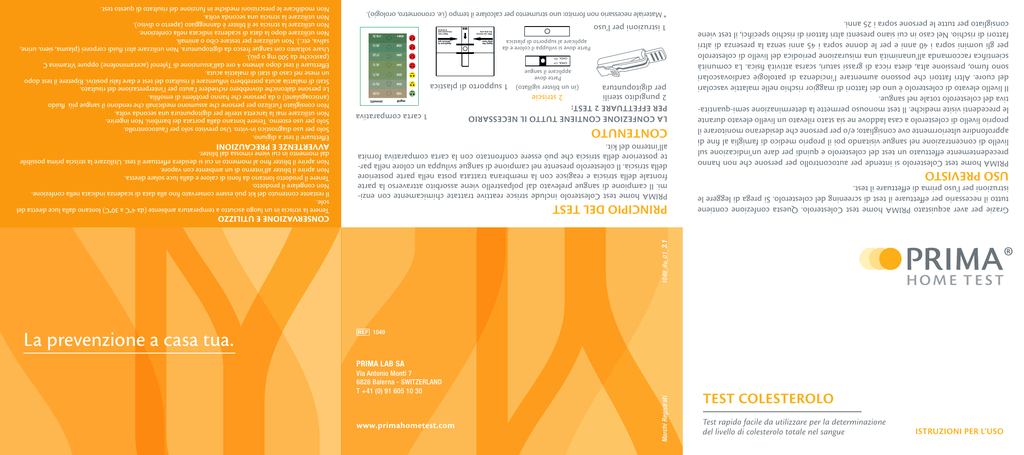 www.primahometest.com Via Antonio Monti 7 6828 Balerna - SWITZERLAND T +41 (0) 91 605 10 30 Marchi Registrati La prevenzione a casa tua. Test rapido facile da utilizzare per la determinazione del livello di colesterolo totale nel sangue ISTRUZIONI PER L’USO TEST COLESTEROLO PRIMA LAB SA 1049 1049_ifu_01_3.1 ® Grazie per aver acquistato PRIMA home test Colesterolo. Questa confezione contiene tutto il necessario per effettuare il test di screening del colesterolo. Si prega di leggere le istruzioni per l’uso prima di effettuare il test. USO PREVISTO PRIMA home test Colesterolo si intende per autocontrollo per persone che non hanno precedentemente effettuato un test del colesterolo e quindi per dare un’indicazione sul livello di concentrazione nel sangue visitando poi il proprio medico di famiglia al fine di approfondire ulteriormente ove consigliato; e/o per persone che desiderano monitorare il proprio livello di colesterolo a casa laddove ne sia stato rilevato un livello elevato durante le precedenti visite mediche. Il test monouso permette la determinazione semi-quantitativa del colesterolo totale nel sangue. Il livello elevato di colesterolo è uno dei fattori di maggior rischio nelle malattie vascolari del cuore. Altri fattori che possono aumentare l’incidenza di patologie cardiovascolari sono fumo, pressione alta, dieta ricca di grassi saturi, scarsa attività fisica. La comunità scientifica raccomanda all’unanimità una misurazione periodica del livello di colesterolo per gli uomini sopra i 40 anni e per le donne sopra i 45 anni senza la presenza di altri fattori di rischio. Nel caso in cui siano presenti altri fattori di rischio specifici, il test viene consigliato per tutte le persone sopra i 25 anni. CONSERVAZIONE E UTILIZZO PRINCIPIO DEL TEST PRIMA home test Colesterolo include strisce reattive trattate chimicamente con enzimi. Il campione di sangue prelevato dal polpastrello viene assorbito attraverso la parte frontale della striscia e reagisce con la membrana trattata posta nella parte posteriore della striscia. Il colesterolo presente nel campione di sangue sviluppa un colore nella parte posteriore della striscia che può essere confrontato con la carta comparativa fornita all’interno del kit. CONTENUTO LA CONFEZIONE CONTIENE TUTTO IL NECESSARIO PER EFFETTUARE 2 TEST: 2 striscie 2 pungidito sterili per digitopuntura (in un blister sigillato) Parte dove applicare il sangue 1 carta comparativa mg/dl 1 supporto di plastica Apply the strip here After use remove the strip only Applicare la striscia qui Dopo l'uso rimuovere solo la striscia (mmol/l) (5,7) 220 (5,1) 200 (3,9) 150 240 CHOL CHOL Parte dove si sviluppa il colore e da applicare al supporto di plastica 1 istruzioni per l’uso (6,1) (9,1) 350 (7,2) 280 400+ (10,3) * Materiale necessario non fornito: uno strumento per calcolare il tempo (i.e. cronometro, orologio). Tenere la striscia in un luogo asciutto a temperatura ambiente (da 4°C a 30°C) lontano dalla luce diretta del sole. Il restante contenuto del kit può essere conservato fino alla data di scadenza indicata nella confezione. Non congelare il prodotto. Tenere il prodotto lontano da fonti di calore e dalla luce solare diretta. Non aprire il blister all’interno di un ambiente con vapore. Non aprire il blister fino al momento in cui si desidera effettuare il test. Utilizzare la striscia prima possibile dal momento in cui viene rimossa dal blister. AVVERTENZE E PRECAUZIONI Effettuare il test a digiuno. Solo per uso diagnostico in-vitro. Uso previsto solo per l’autocontrollo. Solo per uso esterno. Tenere lontano dalla portata dei bambini. Non ingerire. Non utilizzare mai la lancetta sterile per digitopuntura una seconda volta. Non consigliato l’utilizzo per persone che assumono medicinali che rendono il sangue più fluido (anticoagulanti) o da persone che hanno problemi di emofilia. Le persone daltoniche dovrebbero richiedere l’aiuto per l’interpretazione del risultato. Stati di malattia acuta potrebbero influenzare il risultato del test e dare falsi positivi. Ripetere il test dopo un mese nel caso di stati di malattia acuta. Effettuare il test dopo almeno 4 ore dall’assunzione di Tylenol (acetaminofene) oppure Vitamina C (pasticche da 500 mg o più). Usare soltanto con sangue fresco da digitopuntura. Non utilizzare altri fluidi corporei (plasma, siero, urine, saliva, etc.). Non utilizzare per testare cibo o animali. Non utilizzare dopo la data di scadenza indicata nella confezione. Non utilizzare la striscia se il blister è danneggiato (aperto o diviso). Non utilizzare la striscia una seconda volta. Non modificare le prescrizioni mediche in funzione del risultato di questo test. PROCEDURA 1) Lavare le mani con acqua calda ed asciugarle accuratamente. Se le mani sono fredde è consigliato massaggiarle al fine di aumentare il flusso sanguigno verso la punta delle dita. Aprire il blister e rimuovere la striscia. fig. A Disporre il supporto di plastica su un piano asciutto rivolto verso la parte dove è indicato “applicare qui la striscia”. Applicare la striscia sul supporto come indicato nella fig. B. fig. A fig. B 6) Applicare la goccia di sangue sulla striscia all’interno della zona verde indicata dalla freccia. Assicurarsi che la goccia copra completamente l’area reattiva all’interno della zona verde. - fig. H Aspettare 40 secondi. 7) Dopo 40 secondi girare velocemente il supporto di plastica e comparare il colore sviluppato sulla striscia con ciascun foro della carta comparativa. Questa operazione deve essere fatta entro i successivi 25 secondi. Il valore numerico indicato accanto al colore corrispondente indica il vostro livello di colesterolo. - fig. I fig. H fig. I VALORE ALTO: SOPRA 240 mg/dL (6.1 mmol/L) Area di alto rischio. Dovreste contattare il vostro medico per un consulto. RISULTATO NON VALIDO Il test non è valido se non si sviluppa il colore verde. Le cause di un test non valido posso essere attribuite ad una errata e