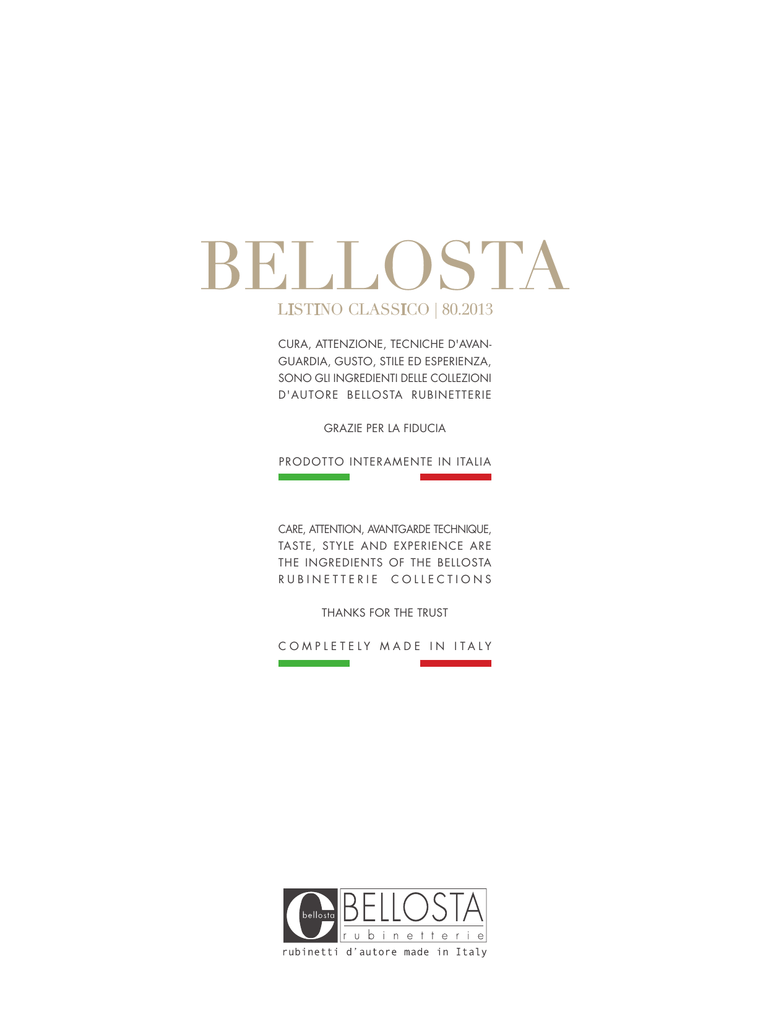 LISTINO CLASSICO | 80.2013 CURA, ATTENZIONE, TECNICHE D'AVANGUARDIA, GUSTO, STILE ED ESPERIENZA, SONO GLI INGREDIENTI DELLE COLLEZIONI D'A U TOR E B E LL O STA R UB I NE T T E R IE GRAZIE PER LA FIDUCIA PRODOTT O I NT E R AM E N T E IN I TA LI A CARE, ATTENTION, AVANTGARDE TECHNIQUE, TASTE, STYLE AND EXPERIENCE ARE THE INGREDIENTS OF THE BELLOSTA RUBINETTERIE COLLECTIONS THANKS FOR THE TRUST C O M P L E T E LY M A D E I N I TA LY ROMINA EQB DESIGN 253 BIDET 255 DOCCIA incasso incasso termostatico esterno esterno termostatico 256 261 263 264 VASCA 265 COMPLEMENTI 268 COMPOSIZIONI DOCCIA 273 INDICE RICAMBI 274 ROMINA LAVABO 247 INFO ROMINA FINITURE DI SERIE - COLLEZIONE ROMINA 01 06 12 16 cromo chrome rame vecchio old copper ottone lucido polished brass bianco / cromo white / chrome 02 cromo / oro chrome / gold 04 07 vecchio argento old silver 08 13 ottone naturale natural brass 14 dorato gold canna fucile gun barrel bianco white 72 bronzo opaco mat bronze 10 19 23 27 verderame verdigris nero black marrone / cromo brown / chrome cromo sat / oro satin chrome / gold 11 20 24 28 nero antracite anthracite black avorio / cromo ivory / chrome arancio / cromo orange / chrome nickel satinato satin nickel 31 nickel c/prot / oro prot nickel / gold 32 36 nickel c/prot / cromo prot nickel / chrome nickel spazzolato / oro brushing nickel / gold 56 avorio ivory 57 canna fucile / cromo gun barrel / chrome azzurro light blue arancio orange nero opaco mat black 61 68 rosso red rame opaco mat copper 05 09 15 bronzo satinato satin bronze canna fucile / oro gun barrel / gold bianco / oro white / gold B.COLORS! 03 18 22 26 30 34 54 oro / argento gold / silver nero / cromo black / chrome verdino / cromo light green / chrome cromo sat / cromo satin chrome / chrome nickel c/prot prot nickel cromo spazzolato brushing chrome cromo / leva cromo sat chrome / sat chrome lever 58 verdino light green 63 69 nickel nickel argento opaco mat silver nickel spazzolato brushing nickel 35 55 nickel sat / oro satin nickel / gold 59 66 marrone brown 71 60 67 75 bianco opaco mat white oro opaco mat gold 17 21 25 29 33 53 nero / oro black / gold azzurro / cromo light blue / chrome rosso / cromo red / chrome nickel sat / cromo satin nickel / chrome cromo satinato satin chrome dorato spazzolato brushing gold Per ogni esigenza progettuale, è possibile richiedere una finitura non presente di serie nella collezione scelta, grazie al team PROGETTO SU MISURA, che realizzerà ad hoc il prodotto. Per informazioni e richieste PROGETTI SU MISURA: [email protected] For every requirements is possible to ask a finished that is not presented in the catalogue thanks to the team of PROGETTO SU MISURA, that will make the project. ATTENZIONE: ATTENTION: For informations and PROJECTS “SU MISURA” requests: [email protected] Dal presente listino la collezione ROMINA prevede esclusivamente la dotazione di vitone ceramico. Please note that the ROMINA collection is supplied with ceramic discs only. OPTIONAL: OPTIONAL: tutta la serie ROMINA viene fornita di serie con la placchetta in metallo, ma è disponibile anche con placchetta porcellana C/F, per l’abbinamento con il colore della rubinetteria e l’ordine vedi seguente tabella: The whole ROMINA collection is provided both with metallic and porcelain indicies H/C. To combine the indices to the finishing of the taps, please look through the following table: Riferimento colore rubinetteria placchetta porcellana placchetta porcellana C F 01-034011 04-034011 04-034011 05-034011 06-034011 07-034011 08-034011 01-034012 04-034012 04-034012 05-034012 06-034012 07-034012 08-034012 cromato cromo / oro dorato bronzo satinato rame vecchio vecchio argento canna fucile prezzo 9,56 15,31 15,31 13,86 13,86 13,86 13,86 Riferimento colore rubinetteria canna fucile / oro ottone lucido ottone naurale bianco bianco / oro bianco / cromo bronzo opaco placchetta porcellana placchetta porcellana C F 04-034011 12-034011 13-034011 14-034011 04-034011 01-034011 72-034011 04-034012 12-034012 13-034012 14-034012 04-034012 01-034012 72-034012 prezzo 15,31 12,91 10,51 12,91 15,31 9,56 13,86 CONSIGLIO TECNICO: TECHNICAL ADVICE: tutti gli articoli della collezione ROMINA vengono collaudati nel loro funzionamento al momento dell’assemblaggio. Per garantire la durata dei vitoni nel tempo, si consiglia di spurgare bene l’impianto idraulico prima del montaggio (per rimuovere eventuali detriti) e di installare: per i monofori Rubinetti sottolavabo con filtro art. 020 (vedi pag. 545) oppure art. 020/1 (vedi pag. 546) per i tre fori Rubinetti sottolavabo con filtro art. 020 (vedi pag. 545) Tubetti di collegamento con calotta art. 029 (vedi pag. 547). N.B.: Qualora il piano lavabo avesse uno spessore superiore a 2,5 cm specificare misura al momento dell’ordine. all mixers of the ROMINA collection are perfectly tested. To guarantee the perfect functionality of the gland for a long time, we advise to clean the sanitary plant before installing the mixer. Moreover we advise to install: for single hole mixers Angle valve with filter art. 020 (see page 545) or art. 020/1 (see page 546) for three holes mixers Angle valve with filter art. 020 (see page 545) Pipes with nut 1/2” F art. 029 (see page 547). Attention: If the lavatory top is more than cm 2,5 thick, please point it out when placing the order. 248 INDICE FOTOGRAFICO ROMINA LAVABO Art. 0305/C p. 253 Batteria per lavabo 3 fori c/ salterello 3 holes basin mixer with popup waste Art. 0305/4/C p. 253 Batteria per lavabo 3 fori c/salterello e bocca erogazione girevole 3 holes basin mixer with swinging spout and pop-up waste Art. 0305/1/C p. 253 Monoforo per lavabo tipo fuso c/salterello Single hole basin mixer with fixed spout and pop-up waste Art. 0305/5/C p. 253 Monoforo per lavabo tipo fuso bocca erogazione alta, c/salterello Single hole basin mixer with fixed high spout and pop-up waste Art. 0305/6/C p. 254 Gruppo per lavabo a muro c/bocca erogazione Wall mounted basin mixer with 