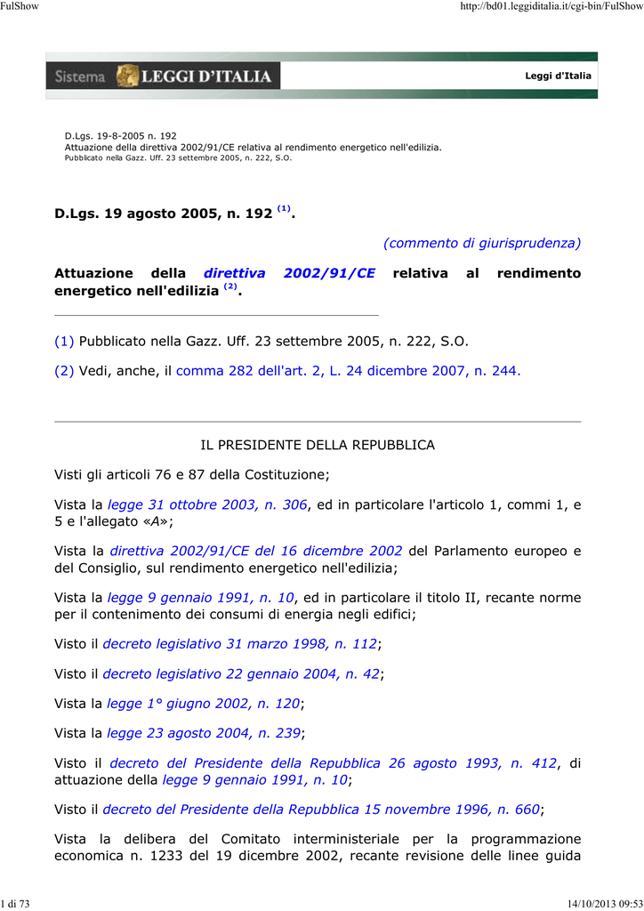 FulShow 1 di 73 http://bd01.leggiditalia.it/cgi-bin/FulShow Leggi d'Italia D.Lgs. 19-8-2005 n. 192 Attuazione della direttiva 2002/91/CE relativa al rendimento energetico nell'edilizia. Pubblicato nella Gazz. Uff. 23 settembre 2005, n. 222, S.O. D.Lgs. 19 agosto 2005, n. 192 (1) . (commento di giurisprudenza) Attuazione della direttiva (2) energetico nell'edilizia . 2002/91/CE relativa al rendimento (1) Pubblicato nella Gazz. Uff. 23 settembre 2005, n. 222, S.O. (2) Vedi, anche, il comma 282 dell'art. 2, L. 24 dicembre 2007, n. 244. IL PRESIDENTE DELLA REPUBBLICA Visti gli articoli 76 e 87 della Costituzione; Vista la legge 31 ottobre 2003, n. 306, ed in particolare l'articolo 1, commi 1, e 5 e l'allegato «A»; Vista la direttiva 2002/91/CE del 16 dicembre 2002 del Parlamento europeo e del Consiglio, sul rendimento energetico nell'edilizia; Vista la legge 9 gennaio 1991, n. 10, ed in particolare il titolo II, recante norme per il contenimento dei consumi di energia negli edifici; Visto il decreto legislativo 31 marzo 1998, n. 112; Visto il decreto legislativo 22 gennaio 2004, n. 42; Vista la legge 1° giugno 2002, n. 120; Vista la legge 23 agosto 2004, n. 239; Visto il decreto del Presidente della Repubblica 26 agosto 1993, n. 412, di attuazione della legge 9 gennaio 1991, n. 10; Visto il decreto del Presidente della Repubblica 15 novembre 1996, n. 660; Vista la delibera del Comitato interministeriale per la programmazione economica n. 1233 del 19 dicembre 2002, recante revisione delle linee guida 14/10/2013 09:53 FulShow 2 di 73 http://bd01.leggiditalia.it/cgi-bin/FulShow per le politiche e misure nazionali di riduzione delle emissioni dei gas serra, pubblicata nella Gazzetta Ufficiale della Repubblica italiana - serie generale - n. 68 del 22 marzo 2003; Considerato che l'articolo 1, comma 1, della legge 23 agosto 2004, n. 239, stabilisce che gli obiettivi e le linee della politica energetica nazionale, nonché i criteri generali per la sua attuazione, sono elaborati e definiti dallo Stato che si avvale anche dei meccanismi esistenti di raccordo e di cooperazione con le autonomie regionali; Considerato che le norme concernenti l'efficienza energetica degli edifici integrano esigenze di diversificazione delle fonti, flessibilità e sicurezza degli approvvigionamenti, sviluppo e qualificazione dei servizi energetici, concorrenza tra imprese, incolumità delle persone e delle cose, sicurezza pubblica e tutela dell'ambiente; Considerato che la legge 9 gennaio 1991, n. 10, ed il decreto del Presidente della Repubblica 26 agosto 1993, n. 412, attuano, per una parte, la direttiva 2002/91/CE; Ritenuto di dover procedere, ai fini dell'attuazione della direttiva 2002/91/CE a introdurre modifiche, integrazioni e aggiornamenti alla disciplina vigente in materia, al fine di evitare disarmonie con le nuove normative, fatte salve le materie oggetto di delegificazione ovvero i procedimenti oggetto di semplificazione amministrativa; Vista la preliminare deliberazione del Consiglio dei Ministri, adottata nella riunione del 27 maggio 2005; Acquisito il parere della Conferenza unificata di cui all'articolo 8 del decreto legislativo 28 agosto 1997, n. 281, reso nella seduta del 30 giugno 2005; Acquisito il parere delle competenti Commissioni della Camera dei deputati e del Senato della Repubblica; Vista deliberazione del Consiglio dei Ministri, adottata nella riunione del 29 luglio 2005; Sulla proposta del Ministro per le politiche comunitarie e del Ministro delle attività produttive, di concerto con i Ministri degli affari esteri, della giustizia, dell'economia e delle finanze, dell'ambiente e della tutela del territorio, delle infrastrutture e dei trasporti e per gli affari regionali; Emana il seguente decreto legislativo: TITOLO I Principi generali. 14/10/2013 09:53 FulShow 3 di 73 http://bd01.leggiditalia.it/cgi-bin/FulShow 1. Finalità (3) . 1. Il presente decreto promuove il miglioramento della prestazione energetica degli edifici tenendo conto delle condizioni locali e climatiche esterne, nonché delle prescrizioni relative al clima degli ambienti interni e all'efficacia sotto il profilo dei costi. 2. Il presente decreto definisce e integra criteri, condizioni e modalità per: a) migliorare le prestazioni energetiche degli edifici; b) favorire lo sviluppo, la valorizzazione e l'integrazione delle fonti rinnovabili negli edifici; b-bis) determinare i criteri generali per la certificazione della prestazione energetica degli edifici e per il trasferimento delle relative informazioni in sede di compravendita e locazione; b-ter) effettuare le ispezioni periodiche degli impianti per la climatizzazione invernale ed estiva al fine di ridurre il consumo energetico e le emissioni di biossido di carbonio; c) sostenere la diversificazione energetica; d) promuovere la competitività dell'industria nazionale attraverso lo sviluppo tecnologico; e) coniugare le opportunità offerte dagli obiettivi di efficienza energetica con lo sviluppo di materiali, di tecniche di costruzione, di apparecchiature e di tecnologie sostenibili nel settore delle costruzioni e con l'occupazione; f) conseguire gli obiettivi nazionali in materia energetica e ambientale; g) razionalizzare le procedure nazionali e territoriali per l'attuazione delle normative energetiche al fine di ridurre i costi complessivi, per la pubblica amministrazione e per i cittadini e per le imprese; h) applicare in modo omogeneo e integrato la normativa su tutto il territorio nazionale; h-bis) assicurare l'attuazione e la vigilanza sulle norme in materia di prestazione energetica degli edifici, anche attraverso la raccolta e l'elaborazione di informazioni e dati; h-ter) promuovere l'uso razionale dell'energia l'informazione e la sensibilizzazione degli utenti finali. anche attraverso (3) Articolo prima modificato dalla lettera a) del comma 1 dell’art. 13, D.Lgs. 3 marzo 2011, n. 28, a decorrere dal 29 marzo 2011, ai sensi di quanto disposto dal comma 1 dell