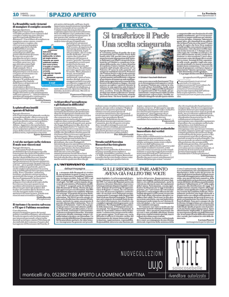 10 SABATO 7 MARZO 2015 La Provincia SPAZIO APERTO La Brambilla vuole vietarmi di mangiare il coniglio: assurdo Egregio direttore, leggo che l’onorevole Brambilla vorrebbe proibire l’uso culinario del coniglio e subito mi sono chiesta: questo è periodo di libertà o di dittatura?. Uno è libero di scegliere se mangiare carne o pesce, essere vegeteriano o vegano, ma che io non possa mangiare coniglio perché lo decide la Brambilla è assurdo. Faccio presente agli animalisti incalliti che grazie alla fortuna di avere la casa con un piccolo giardino ho avuto: cani (e relative cucciolate) gatti, uccellini, pesci ecc, ecc. per abituare i miei figli all’amore e al rispetto degli animali. Ora si rasenta il fanatismo, si va dal panettiere con il cane e così pure al ristorante o in qualsiasi negozio, farmacie comprese. E’ igienico? E quelle persone che girano fra i banchi delle fiere o al mercato col cane al guinzaglio strattonato a destra e a manca fanno davvero il bene del loro amico a quattro zampe o sarebbe meglio lasciarlo a casa spaparanzato sulla sua coperta? (...) lascerò liberi in giardino gli animali e continuerò a mangiare conigli quando voglio. Lettera firmata (Cremona) ...................................................................................... . Le plateali ma inutili sparate di Salvini Egregio direttore, non è una sorpresa il plateale verdetto con modo teatrale: «Servo sciocco di Bruxelles». Riferente al caso di sfida, con il suo diretto avversario politico. Plateale il suo «vaffa...» rivolto a Alfano. Aggettivo che non ha fatto presa, soprattutto perché ‘sparato’ da un avventuriero politico che non ha il senso della visione concreta di una vera politica seria, soprattutto concreta! Egisto Antoniotti (Cremona) ...................................................................................... . A voi che navigate nella violenza Il male non vincerà mai Egregio direttore, (...) Giovanni Paolo II con tutta probabilità deve la propria vita alle conoscenze che tiene in Paradiso e non certo alla scorta di cui era dotato. Anche i denti di Berlusconi, benché ben protetti non poterono evitare quella miniatura del duomo milanese, e fortunatamente per lui quel tizio era solo inc...ato e quindi si limitò a sfogare la sua rabbia in quel modo, poteva anche andarci più pesante e la scorta non avrebbe potuto farci proprio un bel nulla. Non c’è bunker, armatura, fortilizio, giubbotto antiproiettile o protezione che tenga, se qualcuno ha deciso d’ammazzarti, la tua sorte è segnata. Ma ci sono uomini che pongono i loro ideali al di sopra della loro stessa vita e per quanti se ne uccidano altrettanti ne nasceranno. Ora è toccato al rivale politico del leader al Cremlino Boris Nemtsov, ma voi che navigate nella violenza mettetevi il cuore in pace, il male non riuscirà mai a trionfare sul bene. Giulio Roveda (Pizzighettone) ...................................................................................... . Il turismo è la nostra salvezza e l’Expo è l’ultima occasione Caro direttore, mentre la maggior parte dei nostri politici continua a litigare, ad utilizzare il ruolo ricoperto solo esclusivamente per interessi personali, a farsi turbe mentali se inviare o meno l’Ortolano di Arcimboldo di Cremona o l’aratro del Lavagnone di Desenzano del Garda, il più antico del mondo, ad Expo, la più importante manifestazione mondiale si sta avvicinando al suo esordio. E’ l’ultimo treno da non perdere se vogliamo rilanciare la nostra Nazione. Non solo Milano o la Lombardia come ancora crede qualche benpensante. E’ per questo che, anche se un po’ anacronistico in tema ambientale, ma andrà vista solo per il significato metaforico, proporrei l’installazione, nei pressi dell’evento, di una torre di estrazione petrolifera, la classica Derrick, la più alta possibile, che si ‘veda anche da Roma’, per far capire che è giunto il momento di estrarre il nostro ‘petrolio’ facendo lo sgambetto a tutti quei poteri forti che non vogliono la crescita del nostro Paese. Ne abbiamo per tutti i gusti e per tutte le tasche. Mari, pianure e monti, monumenti architettonici ed ambientali, opere d’arte, moda e design, percorsi enogastronomici tra i più eccellenti e suggestivi al mondo snodati tra i nostri borghi di rara bellezza, e tanto altro ancora. Questa è l’Italia. Il turismo, la nostra salvezza. Ma solo se ben organizzato. Francesco Chiavegato (Desenzano del Garda) www.laprovinciacr.it IL CASO Commenta su www.laprovinciadicremona.it/spazioailettori Si trasferisce il Pacle Una scelta sciagurata Egregio direttore, le vorremmo parlare di quello che si sta prospettando per l’Istituto Pacle della nostra città. Già, perché come se non bastasse la recente aggregazione dell’Istituto Beltrami (con relativi strascichi di polemiche) al Ghisleri a complicare la gestione della scuola, ora c’è pure chi pensa di trasferire l’intero Istituto Pacle spostandolo dall’attuale ubicazione di via Palestro 29 verso la sede centrale sita sempre in via Palestro ma al 35. Premesso che l’Istituto Pacle svolge proficuamente le sue attività nella palazzina al civico 29, è praticamente autosufficiente e dispone al suo interno di numerose aule multimediali con lavagne interattive nonché di laboratori di informatica e lingue, i docenti possono accogliere i genitori durante le udienze in una apposita aula dotata di computer per l’accesso al registro elettronico, eccetera. Viene da chiedersi: cui prodest una simile scelleratezza? Insomma, il Pacle così com’è funziona, ed anche piuttosto bene. Dà forse fastidio a qual- Il Ghisleri-Vacchelli-Beltrami cuno avere una scuola funzionante? Forse cè chi non pensa a tutto questo e vorrebbe spostare l’Istituto per cederne le relative aule al liceo Scientifico Aselli, senza pensare che ciò aggraverebbe la situazione organizzativa del Vacchelli, già pesantemente compromessa dalla recente aggregazione sopraccita