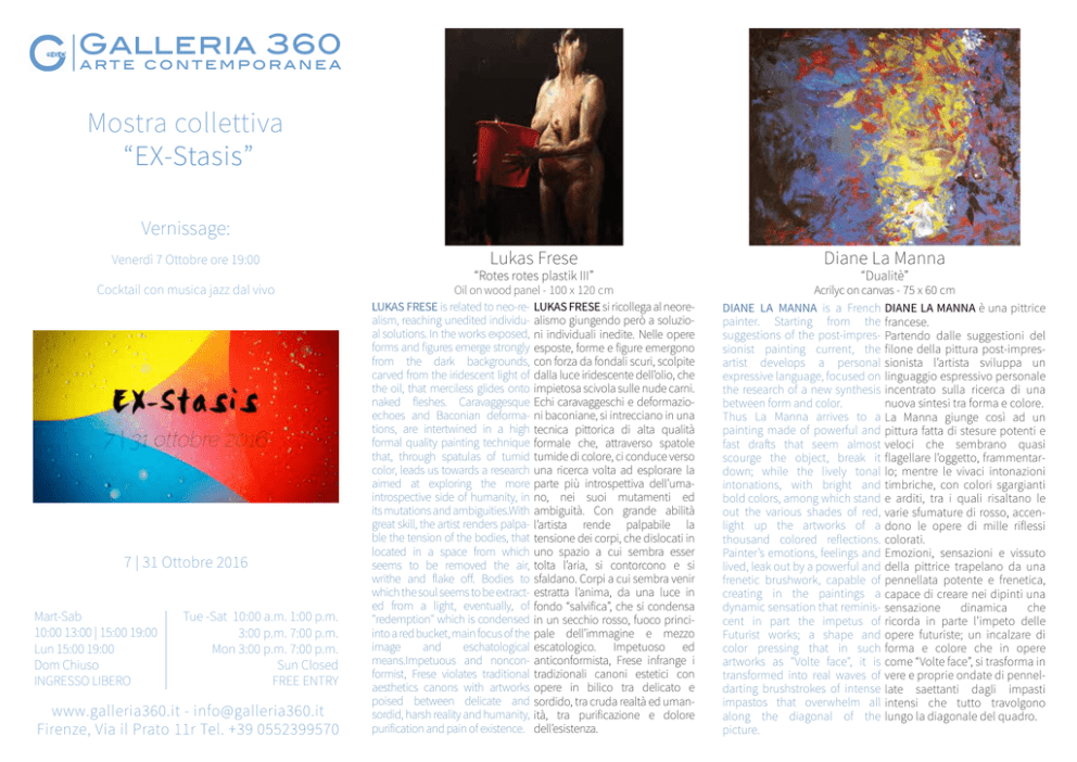 Galleria 360 arte co nte m p o ran ea Mostra collettiva “EX-Stasis” Vernissage: Venerdì 7 Ottobre ore 19:00 Cocktail con musica jazz dal vivo 7 | 31 Ottobre 2016 Mart-Sab 10:00 13:00 | 15:00 19:00 Lun 15:00 19:00 Dom Chiuso INGRESSO LIBERO Tue -Sat 10:00 a.m. 1:00 p.m. 3:00 p.m. 7:00 p.m. Mon 3:00 p.m. 7:00 p.m. Sun Closed FREE ENTRY www.galleria360.it - [email protected] Firenze, Via il Prato 11r Tel. +39 0552399570 Lukas Frese Diane La Manna Oil on wood panel - 100 x 120 cm LUKAS FRESE is related to neo-re- LUKAS FRESE si ricollega al neorealism, reaching unedited individu- alismo giungendo però a soluzioal solutions. In the works exposed, ni individuali inedite. Nelle opere forms and figures emerge strongly esposte, forme e figure emergono from the dark backgrounds, con forza da fondali scuri, scolpite carved from the iridescent light of dalla luce iridescente dell’olio, che the oil, that merciless glides onto impietosa scivola sulle nude carni. naked fleshes. Caravaggesque Echi caravaggeschi e deformazioechoes and Baconian deforma- ni baconiane, si intrecciano in una tions, are intertwined in a high tecnica pittorica di alta qualità formal quality painting technique formale che, attraverso spatole that, through spatulas of tumid tumide di colore, ci conduce verso color, leads us towards a research una ricerca volta ad esplorare la aimed at exploring the more parte più introspettiva dell’umaintrospective side of humanity, in no, nei suoi mutamenti ed its mutations and ambiguities.With ambiguità. Con grande abilità great skill, the artist renders palpa- l’artista rende palpabile la ble the tension of the bodies, that tensione dei corpi, che dislocati in located in a space from which uno spazio a cui sembra esser seems to be removed the air, tolta l’aria, si contorcono e si writhe and flake off. Bodies to sfaldano. Corpi a cui sembra venir which the soul seems to be extract- estratta l’anima, da una luce in ed from a light, eventually, of fondo “salvifica”, che si condensa "redemption" which is condensed in un secchio rosso, fuoco princiinto a red bucket, main focus of the pale dell’immagine e mezzo image and eschatological escatologico. Impetuoso ed means.Impetuous and noncon- anticonformista, Frese infrange i formist, Frese violates traditional tradizionali canoni estetici con aesthetics canons with artworks opere in bilico tra delicato e poised between delicate and sordido, tra cruda realtà ed umansordid, harsh reality and humanity, ità, tra purificazione e dolore purification and pain of existence. dell’esistenza. Acrilyc on canvas - 75 x 60 cm DIANE LA MANNA is a French DIANE LA MANNA è una pittrice painter. Starting from the francese. suggestions of the post-impres- Partendo dalle suggestioni del sionist painting current, the filone della pittura post-impresartist develops a personal sionista l’artista sviluppa un expressive language, focused on linguaggio espressivo personale the research of a new synthesis incentrato sulla ricerca di una between form and color. nuova sintesi tra forma e colore. Thus La Manna arrives to a La Manna giunge così ad un painting made of powerful and pittura fatta di stesure potenti e fast drafts that seem almost veloci che sembrano quasi scourge the object, break it flagellare l’oggetto, frammentardown; while the lively tonal lo; mentre le vivaci intonazioni intonations, with bright and timbriche, con colori sgargianti bold colors, among which stand e arditi, tra i quali risaltano le out the various shades of red, varie sfumature di rosso, accenlight up the artworks of a dono le opere di mille riflessi thousand colored reflections. colorati. Painter’s emotions, feelings and Emozioni, sensazioni e vissuto lived, leak out by a powerful and della pittrice trapelano da una frenetic brushwork, capable of pennellata potente e frenetica, creating in the paintings a capace di creare nei dipinti una dynamic sensation that reminis- sensazione dinamica che cent in part the impetus of ricorda in parte l’impeto delle Futurist works; a shape and opere futuriste; un incalzare di color pressing that in such forma e colore che in opere artworks as "Volte face", it is come “Volte face”, si trasforma in transformed into real waves of vere e proprie ondate di penneldarting brushstrokes of intense late saettanti dagli impasti impastos that overwhelm all intensi che tutto travolgono along the diagonal of the lungo la diagonale del quadro. picture. “Rotes rotes plastik III” “Dualitè” Hilda Kleyn Alen Silva Edith Jung Oil on canvas - 50 x 50 cm HILDA KLEYN is a painter of HILDA KLEYN è una pittrice di Dutch nationality. nazionalità olandese. Nei dipinti In the paintings exposed, the in mostra, le impressioni personpersonal impressions, derived ali tratte dalla vita quotidiana e from everyday life and travels, dai viaggi, sono rielaborate are reworked through an attraverso un linguaggio astratto, abstract language, characterized connotato da una cifra stilistica by a own stylistic signature. fortemente personale. Hilda Kleyn builds through thin Hilda Kleyn costruisce attraverso layers of color, expressive and strati sottili di colore, linee bold lines, eye-catching combi- espressive ed audaci, combinazinations and harmonious color oni accattivanti ed armoniose di tones, warm or cold. Full-bodied toni cromatici caldi o freddi. colors, of materic quality, which Colori corposi, di qualità materiranging over the burning red ca, che spaziando dalle gamme and brown tones, darken in accese del rosso e del marrone, those of ultramarine blue, gray incupiscono in quelle del blu and black. The particular oltremare, grigio e nero. chromatic perception is testimo- La particolare sensibilità cromatny of an attentive and receptive ica è testimonianza di un occhio eye, able to gather the physical attento e ricettivo, capace di and psychological effect that the cogliere l’effetto fisico e psicologflanked colors produce. ico che i col