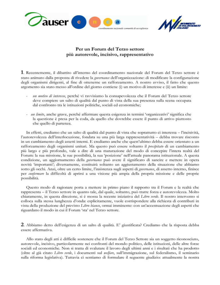 Per un Forum del Terzo settore più autorevole, incisivo, rappresentativo 1. Recentemente, il dibattito all’interno del coordinamento nazionale del Forum del Terzo settore è stato animato dalla proposta di rivedere la governance dell’organizzazione: di modificare la configurazione degli organismi dirigenti, al fine di ottenerne un rafforzamento. A nostro avviso, il fatto che questo argomento sia stato messo all’ordine del giorno contiene (i) un motivo di interesse e (ii) un limite: - un motivo di interesse, perché vi ravvisiamo la consapevolezza che il Forum del Terzo settore deve compiere un salto di qualità dal punto di vista della sua presenza sulla scena occupata dal confronto tra le istituzioni politiche, sociali ed economiche; - un limite, anche grave, perché affermare questa esigenza in termini ‘organizzativi’ significa che la questione è presa per la coda, da quello che dovrebbe essere il punto di arrivo piuttosto che quello di partenza. In effetti, crediamo che un salto di qualità dal punto di vista che soprattutto ci interessa – l’incisività, l’autorevolezza dell’interlocuzione, fondata su una più larga rappresentatività – debba trovare risconto in un cambiamento degli assetti interni. E crediamo anche che quest’ultimo debba essere orientato a un rafforzamento degli organismi unitari. Ma questo può essere soltanto il precipitato di un cambiamento più largo e più profondo, vale a dire di una maturazione del modo di concepire l’intera realtà del Forum: la sua missione, le sue possibilità, la sua ‘posizione’ nell’attuale panorama istituzionale. A questa condizione, un aggiornamento della governance può avere il significato di sancire e mettere in opera novità ‘importanti’; diversamente, costituirà soltanto un aggiustamento della situazione che abbiamo sotto gli occhi. Anzi, oltre un certo limite, l’insistenza sugli aspetti di governance, di assetto interno, finisce per confermare la difficoltà di aprirsi a una visione più ampia della propria missione e delle proprie possibilità. Questo modo di ragionare porta a mettere in primo piano il rapporto tra il Forum e la realtà che rappresenta – il Terzo settore in quanto tale, dal quale, soltanto, può trarre forza e autorevolezza. Molto chiaramente, in questa direzione, si è mossa la recente iniziativa del Libro verde. Il nostro intervento si colloca sulla stessa lunghezza d’onda: esplicitamente, vuole corrispondere alla richiesta di contributi in vista della produzione del previsto Libro bianco, ormai imminente: con un’accentuazione degli aspetti che riguardano il modo in cui il Forum ‘sta’ nel Terzo settore. 2. Abbiamo detto dell’esigenza di un salto di qualità. E’ giustificata? Crediamo che la risposta debba essere affermativa. Allo stato degli atti è difficile sostenere che il Forum del Terzo Settore sia un soggetto riconosciuto, autorevole, incisivo, particolarmente nei confronti del mondo politico, delle istituzioni, delle altre forze sociali ed economiche. Non si tratta di svalutare il lavoro degli ultimi anni e i risultati che ha prodotto (oltre al già citato Libro verde, i documenti sul welfare, sull’immigrazione, sul federalismo, il seminario sulla riforma legislativa). Tuttavia ci sentiamo di formulare il seguente giudizio: attualmente la nostra organizzazione vive una situazione di ‘galleggiamento’, al di sotto del ruolo che potrebbe e che dovrebbe assumere. A livello nazionale manca una vera e propria strategia di interlocuzione politica, quasi che l’accesso agli uffici dei ministeri possa costituire un sufficiente livello di riconoscimento. Gli stessi risultati ai quali abbiamo fatto cenno non sono stati adeguatamente ‘sostenuti’ nel dibattito, come un patrimonio comune da valorizzare con determinazione. Nei territori, la partecipazione al disegno delle politiche sociali, che i Forum regionali dovrebbero ottenere, resta un eccezione rara, piuttosto che la regola. Eppure, il Terzo settore, come tale, è una realtà importante. Contribuisce per l’1,6% alla formazione del PIL, assorbe il 3,5% dell’occupazione, raccoglie adesioni presso il 23,1% della popolazione italiana, contro il 12,1 dei sindacati e il 3,8 dei partiti1. A livello locale, il coinvolgimento delle organizzazioni di Terzo settore nella gestione dei servizi (se non nel disegno delle politiche) costituisce ormai una realtà tipica, di fatto prevalente, tanto che il welfare locale, si potrebbe dire, riposa ormai sulle loro spalle più che su quelle delle istituzioni pubbliche. Sul piano delle idee, il principio di sussidiarietà – del quale il Terzo settore è un naturale interprete – riceve fin troppa attenzione. La stessa ipotesi di una ‘Costituente’ testimonia il rilievo attributo al ruolo che il non profit può assumere nell’attuale situazione sociale ed economica – e casomai, per tornare al problema, colpisce il fatto che non sia nata da una riflessione autonoma, che nel Forum dovrebbe avere una sede del tutto naturale e confacente, ma sia stata avanzata dall’esterno, da un esponente del governo. Dunque, in sintesi, siamo in presenza di un divario, piuttosto vistoso, tra la consistenza, il ruolo, le potenzialità del Terzo Settore e il peso della sua organizzazione di rappresentanza. Ragionevolmente, chiunque abbia a cuore le sorti tanto del Terzo Settore quanto del suo Forum non può ignorare che le cose stanno in questi termini. Nell’ultima riunione del Consiglio nazionale, del resto, molto voci hanno rivendicato la necessità di uno “scarto” nell’azione del Forum: in questa sede vogliamo continuare a riflettere su questo argomento. 3. Senza dubbio, le difficoltà che sperimentiamo dipendono anche da condizionamenti esterni. Pesante, in particolare, è quello costituito dalla compressione degli spazi di partecipazione e di dialogo con le istituzioni dovuta all’affermazione di un modello di democrazia che – nonostante tutti i discorsi sulla s