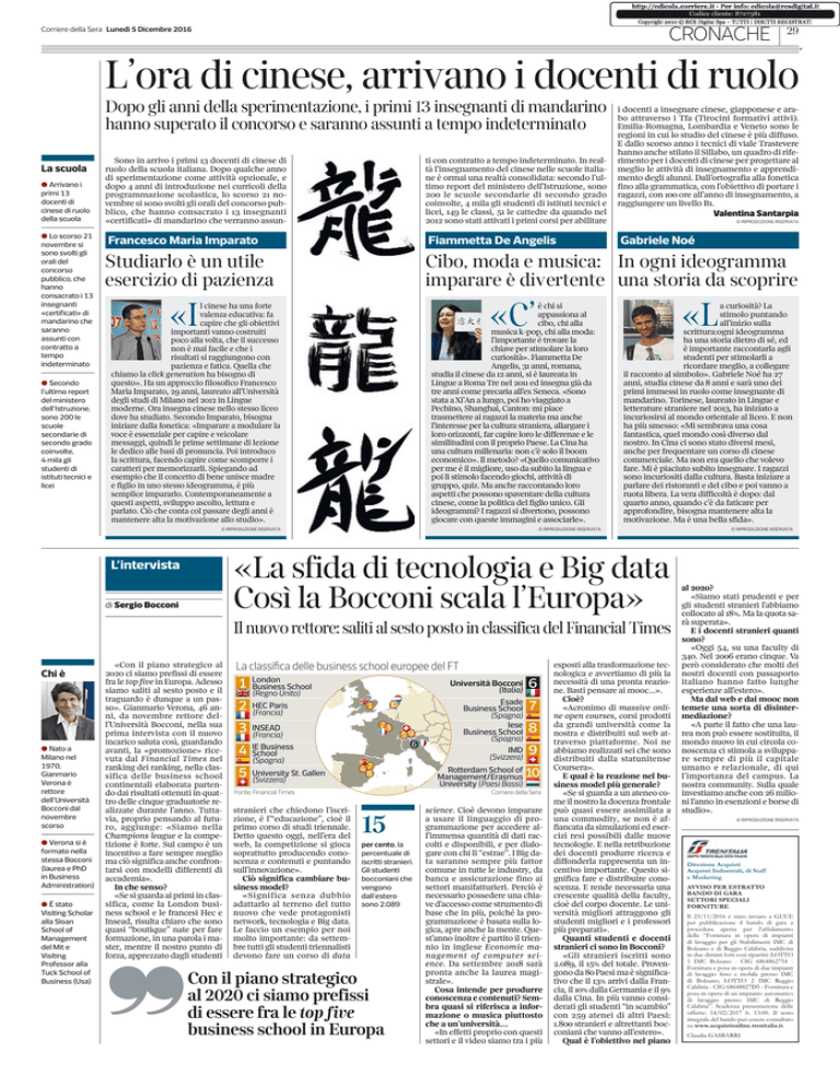 Codice cliente: 8727381 CRONACHE Corriere della Sera Lunedì 5 Dicembre 2016 29 # L’ora di cinese, arrivano i docenti di ruolo Dopo gli anni della sperimentazione, i primi 13 insegnanti di mandarino hanno superato il concorso e saranno assunti a tempo indeterminato La scuola Arrivano i primi 13 docenti di cinese di ruolo della scuola Lo scorso 21 novembre si sono svolti gli orali del concorso pubblico, che hanno consacrato i 13 insegnanti «certificati» di mandarino che saranno assunti con contratto a tempo indeterminato Secondo l’ultimo report del ministero dell’Istruzione, sono 200 le scuole secondarie di secondo grado coinvolte, 4 mila gli studenti di istituti tecnici e licei Sono in arrivo i primi 13 docenti di cinese di ruolo della scuola italiana. Dopo qualche anno di sperimentazione come attività opzionale, e dopo 4 anni di introduzione nei curricoli della programmazione scolastica, lo scorso 21 novembre si sono svolti gli orali del concorso pubblico, che hanno consacrato i 13 insegnanti «certificati» di mandarino che verranno assun- ti con contratto a tempo indeterminato. In realtà l’insegnamento del cinese nelle scuole italiane è ormai una realtà consolidata: secondo l’ultimo report del ministero dell’Istruzione, sono 200 le scuole secondarie di secondo grado coinvolte, 4 mila gli studenti di istituti tecnici e licei, 149 le classi, 51 le cattedre da quando nel 2012 sono stati attivati i primi corsi per abilitare i docenti a insegnare cinese, giapponese e arabo attraverso i Tfa (Tirocini formativi attivi). Emilia-Romagna, Lombardia e Veneto sono le regioni in cui lo studio del cinese è più diffuso. E dallo scorso anno i tecnici di viale Trastevere hanno anche stilato il Sillabo, un quadro di riferimento per i docenti di cinese per progettare al meglio le attività di insegnamento e apprendimento degli alunni. Dall’ortografia alla fonetica fino alla grammatica, con l’obiettivo di portare i ragazzi, con 100 ore all’anno di insegnamento, a raggiungere un livello B1. Valentina Santarpia © RIPRODUZIONE RISERVATA Francesco Maria Imparato Fiammetta De Angelis Studiarlo è un utile esercizio di pazienza Cibo, moda e musica: In ogni ideogramma imparare è divertente una storia da scoprire «I «C’ Gabriele Noé è chi si appassiona al cibo, chi alla musica k-pop, chi alla moda: l’importante è trovare la chiave per stimolare la loro curiosità». Fiammetta De Angelis, 31 anni, romana, studia il cinese da 12 anni, si è laureata in Lingue a Roma Tre nel 2011 ed insegna già da tre anni come precaria all’ex Seneca. «Sono stata a Xi’An a lungo, poi ho viaggiato a Pechino, Shanghai, Canton: mi piace trasmettere ai ragazzi la materia ma anche l’interesse per la cultura straniera, allargare i loro orizzonti, far capire loro le differenze e le similitudini con il proprio Paese. La Cina ha una cultura millenaria: non c’è solo il boom economico». Il metodo? «Quello comunicativo per me è il migliore, uso da subito la lingua e poi li stimolo facendo giochi, attività di gruppo, quiz. Ma anche raccontando loro aspetti che possono spaventare della cultura cinese, come la politica del figlio unico. Gli ideogrammi? I ragazzi si divertono, possono giocare con queste immagini e associarle». a curiosità? La stimolo puntando all’inizio sulla scrittura:ogni ideogramma ha una storia dietro di sé, ed è importante raccontarla agli studenti per stimolarli a ricordare meglio, a collegare il racconto al simbolo». Gabriele Noé ha 27 anni, studia cinese da 8 anni e sarà uno dei primi immessi in ruolo come insegnante di mandarino. Torinese, laureato in Lingue e letterature straniere nel 2013, ha iniziato a incuriosirsi al mondo orientale al liceo. E non ha più smesso: «Mi sembrava una cosa fantastica, quel mondo così diverso dal nostro. In Cina ci sono stato diversi mesi, anche per frequentare un corso di cinese commerciale. Ma non era quello che volevo fare. Mi è piaciuto subito insegnare. I ragazzi sono incuriositi dalla cultura. Basta iniziare a parlare dei ristoranti e del cibo e poi vanno a ruota libera. La vera difficoltà è dopo: dal quarto anno, quando c’è da faticare per approfondire, bisogna mantenere alta la motivazione. Ma è una bella sfida». © RIPRODUZIONE RISERVATA © RIPRODUZIONE RISERVATA © RIPRODUZIONE RISERVATA «La sfida di tecnologia e Big data Così la Bocconi scala l’Europa» L’intervista di Sergio Bocconi Il nuovo rettore: saliti al sesto posto in classifica del Financial Times Chi è Nato a Milano nel 1970, Gianmario Verona è rettore dell’Università Bocconi dal novembre scorso Verona si è formato nella stessa Bocconi (laurea e PhD in Business Administration) È stato Visiting Scholar alla Sloan School of Management del Mit e Visiting Professor alla Tuck School of Business (Usa) «L l cinese ha una forte valenza educativa: fa capire che gli obiettivi importanti vanno costruiti poco alla volta, che il successo non è mai facile e che i risultati si raggiungono con pazienza e fatica. Quella che chiamo la click generation ha bisogno di questo». Ha un approccio filosofico Francesco Maria Imparato, 29 anni, laureato all’Università degli studi di Milano nel 2012 in Lingue moderne. Ora insegna cinese nello stesso liceo dove ha studiato. Secondo Imparato, bisogna iniziare dalla fonetica: «Imparare a modulare la voce è essenziale per capire e veicolare messaggi, quindi le prime settimane di lezione le dedico alle basi di pronuncia. Poi introduco la scrittura, facendo capire come scomporre i caratteri per memorizzarli. Spiegando ad esempio che il concetto di bene unisce madre e figlio in uno stesso ideogramma, è più semplice impararlo. Contemporaneamente a questi aspetti, sviluppo ascolto, lettura e parlato. Ciò che conta col passare degli anni è mantenere alta la motivazione allo studio». «Con il piano strategico al 2020 ci siamo prefissi di essere fra le top five in Europa. Adesso siamo saliti al sesto posto e il tr