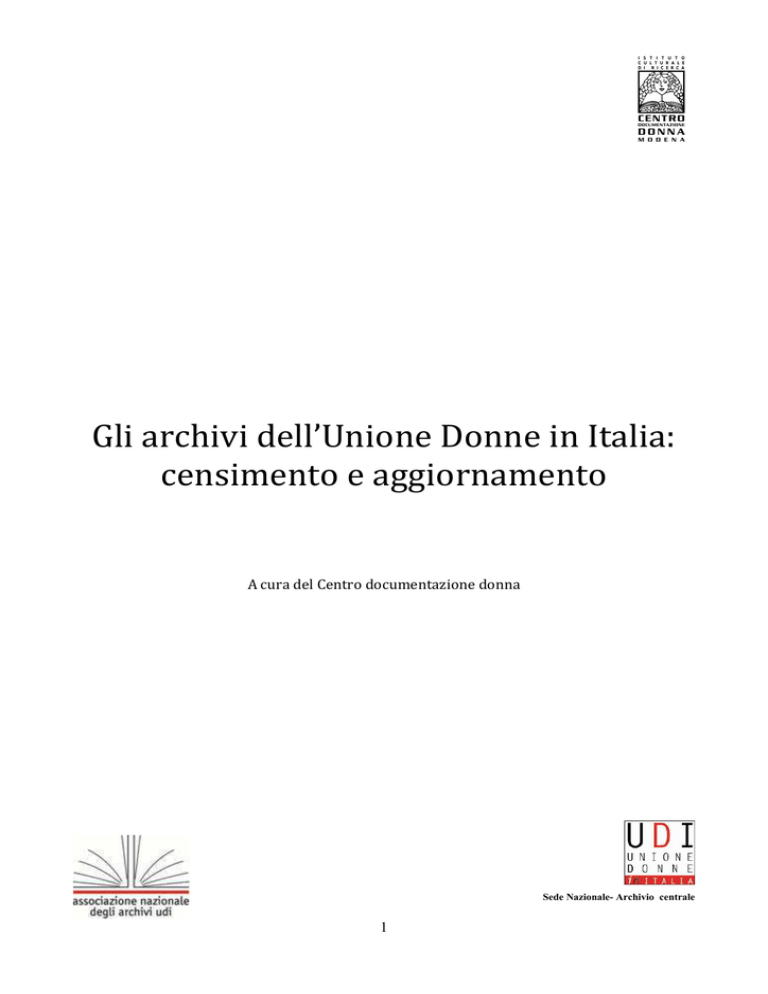 Gli archivi dell’Unione Donne in Italia: censimento e aggiornamento A cura del Centro documentazione donna Sede Nazionale- Archivio centrale 1 Il censimento e l’aggiornamento è il risultato di una ricerca finanziata dal Ministero per i Beni e le Attività Culturali - Direzione Generale per gli Archivi Questo lavoro ha visto la collaborazione di molte. Innanzitutto un particolare ringraziamento a tutte le donne che hanno compilato le schede, fornendo dati e notizie relativi ai diversi archivi, risulta impossibile nominarle tutte. Un particolare ringraziamento all’Associazione Nazionale degli Archivi Udi, alla sua presidente Rosanna Galli, a tutto il consiglio direttivo e alle collaboratrici Ilaria Scalmani e Enza Miceli che hanno sviluppato tutta la fase di ricerca. Per l’Archivio Centrale dell’Udi un sentito ringraziamento a Patrizia Gabrielli e Linda Giuva. Per il Centro documentazione donna Sara Verrini (per la consulenza archivistica e la rielaborazione delle schede) e Natascia Corsini (per il prezioso lavoro di verifica e controllo dei dati). La data di chiusura del censimento è dicembre 2012, con dati censimento fino al 2011. 2 Premessa L’intento del progetto “Gli archivi dell’Udi: aggiornamento censimento” è stato quello di aggiornare lo stato degli archivi dell’Udi presenti sul territorio nazionale, verificando da un lato le condizioni dei 40 archivi censiti nella “Guida agli Archivi dell’Unione Donne Italiane” (pubblicata nei Quaderni della Rassegna degli Archivi di Stato dal Ministero per i Beni e le Attività Culturali nel 2002) con un aggiornamento quantitativo e qualitativo dei materiali, la verifica delle sedi e dello stato di consultabilità; dall’altro la presenza di nuovi archivi non censiti in quella prima occasione. Il progetto – presentato dal Centro documentazione donna1 e dall’Associazione Nazionale degli Archivi dell’Udi2, in collaborazione con l’Archivio Centrale dell’Udi – al Ministero per i Beni e le Attività Culturali – Direzione Generale per gli Archivi, è stato finanziato nel 2010. Questo progetto ha costituito un primo passo verso l’obiettivo fondamentale di mettere in rete, dandone visibilità, i fondi conservati da tutti gli archivi dell’Udi, con la priorità di risolvere i problemi di accesso alla documentazione esistente. Obiettivo generale è il miglioramento della conservazione, della valorizzazione e della fruibilità degli archivi delle Udi locali e Centrale, attraverso la realizzazione di un sistema che, sviluppato e incrementato, potrebbe portare alla messa in rete degli inventari – con strumenti di comunicazione e diffusione delle informazioni, sperimentazioni didattiche di tipo multimediale dell’utilizzo delle fonti – garantendone l’apertura al pubblico, al fine di non disperdere la memoria storica locale e agevolare la comprensione dei processi attraverso cui la società civile e le culture politiche hanno determinato l’identità della nostra nazione. I fondi archivistici interessati dal progetto erano almeno un centinaio, molto diversi fra loro, conservati nei 40 archivi locali e nell’Archivio Centrale dell’Udi, ma l’aspettativa era di poter 1 Il Centro documentazione donna è un istituto culturale di ricerca con sede a Modena, dotato di una biblioteca specialistica (oltre 9000 volumi) e di una sezione archivi che conta circa 1850 buste di materiali archivistici - tra fondi personali e di associazioni (di particolare interesse il fondo Udi di Modena) che conservano la memoria dei percorsi di cittadinanza femminile dal dopoguerra ad oggi documentando in particolare il forte impegno delle donne nell’associazionismo, nei partiti e nei sindacati modenesi che, tra gli anni Sessanta e Settanta, furono tra i protagonisti della ridefinizione del “ruolo” della donna nella società italiana e interlocutori privilegiati dei movimenti portatori di importanti percorsi di modifica dell’identità femminile e delle soggettività. Il patrimonio è stato dichiarato di notevole interesse storico dalla Soprintendenza archivistica della Regione Emilia Romagna. 2 L’Associazione Nazionale degli Archivi dell’Udi è nata nel maggio 2001 con l’obiettivo, come istituito dall’articolo 3 dello Statuto, sia di valorizzare i percorsi femminili acquisendo, tutelando e diffondendo documenti e pubblicazioni, per la testimonianza del patrimonio della storia politica delle donne da tramandare alle future generazioni; sia di gestire, conservare, catalogare, informatizzare e mettere in rete il patrimonio archivistico per agevolarne al massimo la fruizione. 3 aggiungere a questi archivi già censiti anche altri di cui al momento del primo censimento non esistevano informazioni certe. La scelta di effettuare un aggiornamento della “Guida” del 2002 nasce dalla consapevolezza che la distribuzione dei fondi in una pluralità di sedi si può modificare, aumentando l’incertezza e l’instabilità dei dati, soprattutto possono cambiare le condizioni materiali di collocazione e di accesso; per tali motivi risulta utile verificare periodicamente la situazione. Infatti dal censimento effettuato nel 2002 risulta chiaramente come da parte delle donne dell’Udi ci sia stato un importante lavoro di “conservazione, salvaguardia, raccolta, riordino, attivazione di strade e strumenti per rendere fruibile ad altre donne, a studentesse e studiose così come a donne appassionate di politica delle donne, un patrimonio unico ed irripetibile nel panorama documentaristico italiano.”3 A questo attivismo non sempre è corrisposta una reale possibilità di valorizzare il patrimonio archivistico e renderlo fruibile, per numerose ragioni: mancanza di una sede dove conservare i documenti, carenza di risorse per avviare un sistematico riordino del materiale archivistico, presenza di volontarie che dedicano tanto tempo e buona volontà ma che spesso non hanno competenze tecniche, ecc. Nel dettaglio il progetto è stato art