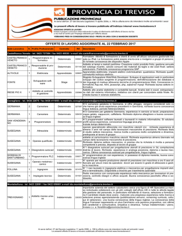 CRESPANO DEL GRAPPA OFFERTE DI LAVORO AGGIORNATE AL 22 FEBBRAIO 2017 Sede Lavorativa N. Profilo Professionale Contratto Rif. Descrizione Castelfranco Veneto - tel. 0423 737504 / fax 0423 49530 / e-mail [email protected] Formatore- Attività di formazione a clienti di avvio all'utilizzo soluzione gestionale baCASTELFRANCO Programmatore in330821 sata su iPad. La formazione potrà essere one-to-one o rivolgersi a gruppi di persone. 1 Determinato VENETO formatico Si richiede conoscenza dei dispositivi AppleAddetto ai tempi e metodi part/time- Creazione codici prodotto finito, gestione annuale CASTELFRANCO Responsabile di pro331140 del catalogo ricambi, calcolo consumi dei materiali da taglio e dei costi finali- settore 1 Determinato VENETO duzione calzaturiero- Preferibile conoscenza programma SAP Apprendista elettricista- impianti elettrici civili/industriali- quadristica- Richiesto qualifi328687 ALTIVOLE 1 Elettricista Apprendistato ca/maturità indirizzo elettrico. Stagista Sviluppatore Web/Web Developer- Sviluppo di applicazioni web in particolare sviluppo del codice sorgente di programmazione, dell'ottimizzazione dei database e Sviluppatore soft331118 dei linguaggi di markup attraverso tecniche di programmazione Web. Conoscenze inFONTE 1 Stage ware formatiche Asp.net, html, javascript, php, sqlserver mysql- Richiesta laurea settore informatico. Addetto alle analisi statistiche e contabilità bancali. Analisi dati in excel, estrapolazioAddetto al controllo 330966 ne dati dal sistema informativo, trattativa con clienti per concordare saldo finale. RiRIESE PIO X 1 Apprendistato di gestione chiesta laurea in scienze statistiche. Conegliano - tel. 0438 22675 / fax 0438 411055 / e-mail [email protected] N°2 cameriere gelateria in Germania, si offre alloggio, vengono considerati solo cv 327397 che hanno già avuto esperienze precedenti in Germania, richiesta buona conoscenza GERMANIA 2 Cameriere Determinato lingua tedesca, periodo febbraio/ottobre N°2 Cameriere per gelateria Germania, esperienza in servizio ai tavoli, preparazione 328430 coppe gelato, cappuccini, caffetteria. Richiesto diploma albeghiero e buona conocenGERMANIA 1 Cameriere Determinato za lingua inglese N°3 programmatori software laureati o laureandi in materie informatiche. Si valutano SAN VENDEMIA329330 profili senza esperienza, conoscenza linguaggi java,php. 3 Programmatore Determinato NO Iniziale tempo determinato. operaio specializzato attrezzista cnc macchine utensili cnc . richiesta esperienza di almeno 3 anni nel campo delle lavorazioni meccaniche di precisione. Richiesto titolo 329357 SUSEGANA 1 Attrezzista Indeterminato di studio settore meccanica. ricerca rivolta a persona molto comptetente e dinamica, predisposta al lavoro di gruppo addetto al carico/scarico macchine utensili. Richiesta esperienza almeno biennale nel campo delle lavorazione meccaniche di precisione. 329354 SUSEGANA 1 Operaio qualificato Indeterminato Richiesto diploma settore meccanico, si precisa che la richeista è rivolta a persona competente e precisa, disposta al lavoro di gruppo N°1 disegnatore autocad per progettazione utensili di precisione in 3d, compilazione 330054 distinte di lavoro. Richiesta esperienza in analoga posizione, diploma o laurea mecSUSEGANA 1 Disegnatore autocad Indeterminato canica. Ottima conoscenza autocad per progettazione, lingua inglese. GODEGA DI N° programmatore plc con esperienza, in possesso di diploma inerente, buona cono330071 1 Programmatore PLC Indeterminato SANT'URBANO scenza lingua inglese N° operaio per reparto produzione utensili di precisione con macchina a cnc 6 assi afOperaio metalmec329791 fiancato per alcuni mesi da operatore dovra' poi essere in grado di attrezzare e gestiSUSEGANA 1 Indeterminato canico re la macchina N° 1 neo laureato in ingegneria elettrica o meccanica per progettazione impianti elet331476 FOLLINA 1 Ingegnere Indeterminato trici e termoidraulici. Disponibile a tirocinio per inserimento aziendale Perito meccanico con comprovata esperienza nella meccanica per lavorazioni di pre331501 cisione, controllo disegni e ufficio acquisti. Buona conoscenza pacchetto office e soSUSEGANA 1 Impiegato tecnico Determinato lidworks. Montebelluna - tel. 0423 22091 / fax 0422 656601 e-mail [email protected] TREVIGNANO 1 Addetto risorse umane Indeterminato Importante azienda del settore calzaturiero cerca una figura di HR Specialist.La risorsa individuata collaborerà con gli altri colleghi dell'ufficio HR in tutte le attività legate alla gestione del personale, in particolare nell'attività di ricerca, selezione e formazione.Il candidato ideale deve avere:- maturato una pregressa esperienza nella ricerca e 330353 selezione presso agenzia/azienda (pubblicazione annunci, screening curricula, colloqui di selezione);- una buona conoscenza della lingua inglese. La conoscenza della lingua Francese rappresenta un plus.Cerchiamo una persona propositiva, con ottime doti caratteriali e comunicative, empatica e dinamica. Tempo Indeterminato / pieno. Inviare c.v. a: [email protected] Ai sensi dell'art. 27 del Decreto Legislativo 11 aprile 2006, n. 198 le offerte sono da intendersi rivolte ad entrambi i sessi Le presenti offerte di lavoro si trovano pubblicate all'indirizzo internet www.trevisolavora.it 1 ASOLO 1 Media Services MX / Off-Road Officer Determinato Ruolo: Media Services MX/Off-Road Officer, Principali responsabilità e requisiti per questo ruolo: 1. Passione e conoscenza approfondita del mondo Motocross, inclusi Piloti, Team Manager, Sponsor e principali Partner. 2. Esperienza lavorativa nel Motocross di almeno 4 anni in ambito Media & Communication.3. Abilità di comunicazione interpersonale, scritta e orale. Inglese e unaltra lingua Europea a livello fluente per uso professionale.4. Grande sicurezza e confidenza 331263 nel presentare e tenere discorsi difronte a piccoli e grandi gruppi di persone.5. Capacità di lavorare sotto stress e con scadenze ravvicinate.Abilità nel saper portare avant
