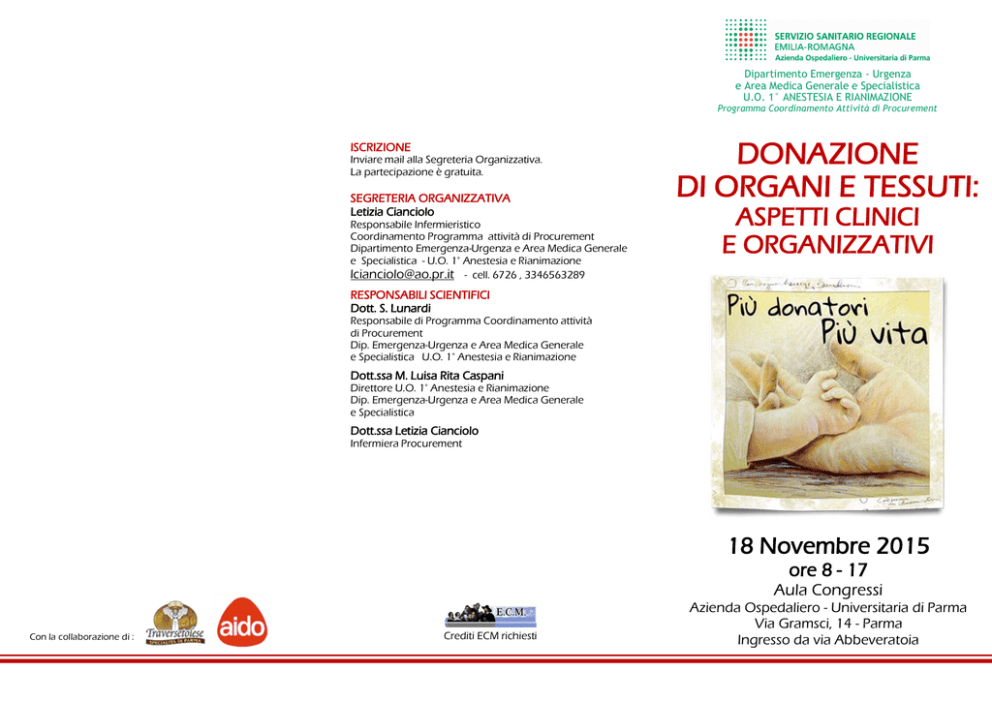 Dipartimento Emergenza - Urgenza e Area Medica Generale e Specialistica U.O. 1° ANESTESIA E RIANIMAZIONE Programma Coordinamento Attività di Procurement ISCRIZIONE Inviare mail alla Segreteria Organizzativa. La partecipazione è gratuita. SEGRETERIA ORGANIZZATIVA Letizia Cianciolo Responsabile Infermieristico Coordinamento Programma attività di Procurement Dipartimento Emergenza-Urgenza e Area Medica Generale e Specialistica - U.O. 1° Anestesia e Rianimazione [email protected] - cell. 6726 , 3346563289 DONAZIONE DI ORGANI E TESSUTI: ASPETTI CLINICI E ORGANIZZATIVI RESPONSABILI SCIENTIFICI Dott. S. Lunardi Responsabile di Programma Coordinamento attività di Procurement Dip. Emergenza-Urgenza e Area Medica Generale e Specialistica U.O. 1° Anestesia e Rianimazione Dott.ssa M. Luisa Rita Caspani Direttore U.O. 1° Anestesia e Rianimazione Dip. Emergenza-Urgenza e Area Medica Generale e Specialistica Dott.ssa Letizia Cianciolo Infermiera Procurement 18 Novembre 2015 ore 8 - 17 Aula Congressi Con la collaborazione di : Crediti ECM richiesti Azienda Ospedaliero - Universitaria di Parma Via Gramsci, 14 - Parma Ingresso da via Abbeveratoia DONAZIONE DI ORGANI E TESSUTI: ASPETTI CLINICI E ORGANIZZATIVI PROGRAMMA La chirurgia dei trapianti si definisce come una sicura ed insostituibile opportunità terapeutica capace di risolvere oggettive situazioni di pericolo e di danno per la vita o per la validità individuale, non altrimenti e/o non altrettanto efficacemente trattabili. Lo sviluppo quantitativo di questo impegno terapeutico, le cui controindicazioni e complicanze di indole clinica, sono sempre più contenute, è condizionato ormai, non solo da fattori tecnici ed organizzativi propri di ogni Sistema Sanitario gravato da specifici problemi di natura economica, superabili attraverso la programmazione delle iniziative rapportate alle risorse e alle attese sociali, ma anche, e soprattutto, dalla limitata disponibilità del materiale biologico utile per il trapianto. Tale difetto è particolarmente evidente in Italia ove si va accentuando il divario tra esigenze - attese terapeutiche e opportunità di intervento e ove pertanto, nonostante le soddisfacenti e talora eccellenti realizzazioni organizzative e tecnico - operative, annualmente si perdono migliaia di pazienti per i quali ogni speranza di sopravvivenza è confidata ad un possibile impianto di organo vitale. MATTINO POMERIGGIO 8:00 Registrazione Partecipanti 8:30 Saluti Autorità Moderatore S. Lunardi (Parma) Moderatori G. Sangiorgi (Bologna), M.L. Caspani (Parma) 14:30 Ruolo della Direzione Sanitaria, management del 9:00 Introduzione S.Lunardi (Parma) 9:30 Struttura Organizzativa della nuova Rete CNTO A. Montemurro (Roma) 10:00 Diagnosi e Accertamento della Morte Cerebrale S. V. Risolo (Parma) 10:30 Il Trattamento del Potenziale donatore E. Sani (Parma) Discussione 11:30 Valutazione di Idoneità del donatore, i livelli di rischio clinico, nuove linee guida. L’allocazione degli Organi e Tessuti G. Sangiorgi (Bologna) 12:30 Aspetti Medico-Legali del Processo Donazione, Prelievo D. Di Camillo (Parma) 13:00 Aspetti etici, religiosi e culturali nella Donazione L. Randis (Parma) Pausa pranzo Rischio clinico G. Campaniello (Parma) 15:00 Il Coordinamento Infermieristico nella Donazione: Il Procurement L. Cianciolo (Parma) 15:30 Il Ruolo dell’Infermiere in Rianimazione durante l’Accertamento di Morte con Criteri Neurologici V.M. Antonini (Parma) 16:00 Aspetti organizzativi del Prelievo di Organi da Donatore a cuore battente in sala operatoria C. Lazzari (Parma)