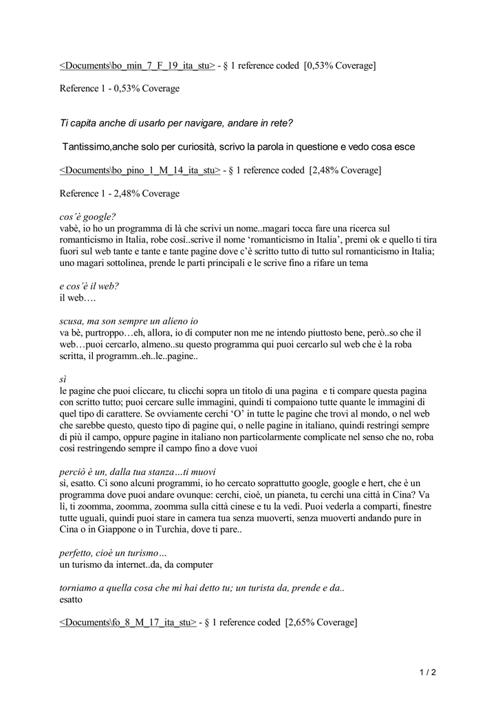 <Documents\bo_min_7_F_19_ita_stu> - § 1 reference coded [0,53% Coverage] Reference 1 - 0,53% Coverage Ti capita anche di usarlo per navigare, andare in rete? Tantissimo,anche solo per curiosità, scrivo la parola in questione e vedo cosa esce <Documents\bo_pino_1_M_14_ita_stu> - § 1 reference coded [2,48% Coverage] Reference 1 - 2,48% Coverage cos’è google? vabè, io ho un programma di là che scrivi un nome..magari tocca fare una ricerca sul romanticismo in Italia, robe così..scrive il nome ‘romanticismo in Italia’, premi ok e quello ti tira fuori sul web tante e tante e tante pagine dove c’è scritto tutto di tutto sul romanticismo in Italia; uno magari sottolinea, prende le parti principali e le scrive fino a rifare un tema e cos’è il web? il web…. scusa, ma son sempre un alieno io va bè, purtroppo…eh, allora, io di computer non me ne intendo piuttosto bene, però..so che il web…puoi cercarlo, almeno..su questo programma qui puoi cercarlo sul web che è la roba scritta, il programm..eh..le..pagine.. sì le pagine che puoi cliccare, tu clicchi sopra un titolo di una pagina e ti compare questa pagina con scritto tutto; puoi cercare sulle immagini, quindi ti compaiono tutte quante le immagini di quel tipo di carattere. Se ovviamente cerchi ‘O’ in tutte le pagine che trovi al mondo, o nel web che sarebbe questo, questo tipo di pagine qui, o nelle pagine in italiano, quindi restringi sempre di più il campo, oppure pagine in italiano non particolarmente complicate nel senso che no, roba così restringendo sempre il campo fino a dove vuoi perciò è un, dalla tua stanza…ti muovi sì, esatto. Ci sono alcuni programmi, io ho cercato soprattutto google, google e hert, che è un programma dove puoi andare ovunque: cerchi, cioè, un pianeta, tu cerchi una città in Cina? Va lì, ti zoomma, zoomma, zoomma sulla città cinese e tu la vedi. Puoi vederla a comparti, finestre tutte uguali, quindi puoi stare in camera tua senza muoverti, senza muoverti andando pure in Cina o in Giappone o in Turchia, dove ti pare.. perfetto, cioè un turismo… un turismo da internet..da, da computer torniamo a quella cosa che mi hai detto tu; un turista da, prende e da.. esatto <Documents\fo_8_M_17_ita_stu> - § 1 reference coded [2,65% Coverage] 1/2 Reference 1 - 2,65% Coverage Questa secondo me è la tecnologia degli ultimi anni questa è la tecnologia in generale, perché con il computer puoi fare di tutto in assoluto a me piace con il computer andare su internet, guardare i film, modificare i filmati con la macchina digitale che facciamo noi e creare i dvd, paciugare un po’ fare tutto e non fare niente. Ma hai imparato da solo? Io faccio il corso di grafico pubblicitario. Quindi un po’ anche a scuola A scuola insegnano solo la grafica, invece il computer computer l’ho imparato da solo, provando, facendo dei casini dentro il computer perché è già due volte che mi sono arrivati dei virus spaciugando, perché a provare perché uno non mi insegna mai e tu devi provare da solo a casa tua può darsi, ti può capitare che fai dei casini. <Documents\mo_2_M_16_ita_stu> - § 1 reference coded [1,65% Coverage] Reference 1 - 1,65% Coverage Tu la usi quindi la chat? Sì, sì, la uso, perché ormai, inserito nel mondo dell’informatica, le cose principali diciamo che sono queste, andare su un sito, navigare, scoprirlo tutto, poi ci sono le chat e l’e-mail, i servizi che ti può offrire internet gratuitamente, anche senza pagare, sì, ti sviluppa diciamo, in un certo senso, ti fa capire anche molte cose, perché non è detto che ci sono i siti porno e i siti… cioè, se uno ha l’intelligenza di sapere dividere tra le cose, diciamo, negative e le cose positive, il computer sarebbe anche in grado di darti una mano, però c’è gente anche sul computer che ci guadagna, perché, tra l’altro, è tutto un guadagno la pornografia, la pedofilia e tutto il resto ee, così, purtroppo ci sono anche degli aspetti negativi nel computer, ci sono aspetti positivi e negativi, così 2/2