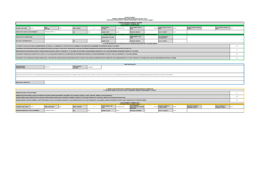 ALLEGATO 6 /ANNEX 6 SCHEMA DI COMUNICAZIONE AI SENSI DELL’ARTICOLO 152- octies, comma 7 FILING MODEL FOR DISCLOSURE OF TRANSACTIONS REFERRED TO ARTICLE 152- octies , paragraph 7 1. PERSONA RILEVANTE DICHIARANTE / DECLARER 1.1 DATI ANAGRAFICI / PERSONAL DATA PERSONA FISICA / IF NATURAL PERSON COGNOME / FAMILY NAME VECCHI DOMICILIO PER LA CARICA / PLACE OF RESIDENCE* NOME / FIRST NAME PIERO VIA BENIGNO CRESPI, 17 M SESSO / GENDER* CAP 20149 CODICE FISCALE / TAX CODE* COMUNE / PLACE* VCCPRI68C14F205F MILANO DATA DI NASCITA/ DATE OF 14/03/1968 BIRTH* PROVINCIA / PROVINCE* MI COMUNE DI NASCITA / PLACE OF BIRTH* STATO / COUNTRY * MILANO PROVINCIA DI NASCITA / PROVINCE OF BIRTH* MI STATO DI NASCITA / COUNTRY OF BIRTH* ITALIA ITALIA PERSONA GIURIDICA, SOCIETA’ DI PERSONE O TRUST / IF LEGAL PERSON, UNLIMITED PARTNERSHIP OR TRUST RAGIONE SOCIALE / CORPORATE NAME CODICE FISCALE / TAX CODE* SEDE LEGALE / REGISTERED OFFICE* CAP COMUNE / PLACE* FORMA GIURIDICA / LEGAL DATA DI COSTITUZIONE / FORM* DATE ESTABLISHED * PROVINCIA / PROVINCE* STATO / COUNTRY * 1.2. NATURA DEL RAPPORTO CON L’EMITTENTE QUOTATO / NATURE OF RELATIONSHIP WITH THE LISTED COMPANY C.1) SOGGETTO CHE SVOLGE FUNZIONI DI AMMINISTRAZIONE, DI CONTROLLO O DI DIREZIONE IN UN EMITTENTE QUOTATO/ MEMBER OF THE ADMINISTRATIVE, MANAGEMENT OR SUPERVISORY BODIES OF THE ISSUER NO C.2) DIRIGENTE CHE HA REGOLARE ACCESSO A INFORMAZIONI PRIVILEGIATE E DETIENE IL POTERE DI ADOTTARE DECISIONI DI GESTIONE CHE POSSONO INCIDERE SULL'EVOLUZIONE E SULLE PROSPETTIVE FUTURE DELL’EMITTENTE QUOTATO/ SI SENIOR EXECUTIVE HAVING REGULAR ACCESS TO INSIDE INFORMATION RELATING, DIRECTLY OR INDIRECTLY, TO THE ISSUER, AND THE POWER TO MAKE MANAGERIAL DECISIONS ON THE FUTURE DEVELOPMENTS AND BUSINESS PROSPECTS OF THE ISSUER C.3) SOGGETTO CHE SVOLGE LE FUNZIONI DI CUI AL PUNTO C1) O C.2) IN UNA SOCIETÀ CONTROLLATA, DALL’EMITTENTE QUOTATO/PERSON WHO PERFORM S THE FUNCTIONS REFERRED TO IN POINT C1 AND C2 IN A SUBSIDIARY OF THE LISTED COMPANIES NO C.4) SOGGETTO CHE DETIENE AZIONI IN MISURA ALMENO PARI AL 10 PER CENTO DEL CAPITALE SOCIALE DELL’EMITTENTE QUOTATO O SOGGETTO CHE CONTROLLA L'EMITTENTE QUOTATO/ PERSON WHO HOLD SHARES AMOUNTING TO AT LEAST 10 PER CENT OF THE SHARE CAPITAL AND ANY OTHER PERSON WHO CONTROL THE ISSUER NO 2. EMITTENTE QUOTATO RAGIONE SOCIALE / CORPORATE NAME CODICE FISCALE / TAX CODE* SORIN S.P.A. 04160490969 * informazioni da inserire solo nel caso in cui l’invio sia effettuato tramite sistemi telematici attuati dalla società di gestione dei mercati (che non sono oggetto di diffusione al pubblico da parte di quest’ultima) / information must be provided only if the form is disseminated through the telematics system provided by the market management company (these information will not be subject to public disclosure). ANNOTAZIONI / ANNOTATION 3. SOGGETTO CHE HA EFFETTUATO LE OPERAZIONI / PARTY WHICH EXECUTED THE TRANSACTION 3.1. NATURA DEL SOGGETTO CHE HA EFFETTUATO LE OPERAZIONI / REASON FOR RESPONSABILITY TO NOTIFY PERSONA RILEVANTE / RELEVANT PERSON SI PERSONA FISICA STRETTAMENTE LEGATE AD UN SOGGETTO RILEVANTE (CONIUGE NON SEPARATO LEGALMENTE, FIGLIO, ANCHE DEL CONIUGE, A CARICO, GENITORE, PARENTE O AFFINE CONVIVENTE) / NO NATURAL PERSON CLOSELY ASSOCIATED WITH A RELEVANT PERSON (SPOUSE, UNLESS LEGALLY SEPARATED, DEPENDENT CHILDREN OF THE RELEVANT PERSON OR OF THE SPOUSE, PARENTS, RELATIVES AND RELATIVES-IN-LAW) PERSONA GIURIDICA, SOCIETÀ DI PERSONE O TRUST STRETTAMENTE LEGATA AD UN SOGGETTO RILEVANTE O AD UNA PERSONA FISICA DI CUI AL PUNTO PRECEDENTE / LEGAL PERSON, UNLIMITED PARTNERSHIP OR TRUST CLOSELY ASSOCIATED WITH A RELEVANT PERSON NO 1 3.2 DATI ANAGRAFICI / PERSONAL DATA SE PERSONA FISICA / IF NATURAL PERSON COGNOME / FAMILY NAME VECCHI RESIDENZA ANAGRAFICA / PLACE OF RESIDENCE NOME / FIRST NAME VIA BENIGNO CRESPI, 17 PIERO SESSO / GENDER* CAP M 20149 CODICE FISCALE / TAX CODE* COMUNE / PLACE* VCCPRI68C14F205F DATA DI NASCITA (gg/mm/aaaa)/ DATE OF BIRTH (dd/mm/yyyy)* MILANO PROVINCIA / PROVINCE* 14/03/1968 MI COMUNE DI NASCITA / PLACE OF BIRTH* STATO / COUNTRY * MILANO ITALIA PROVINCIA DI NASCITA / PROVINCE OF BIRTH* MI STATO DI NASCITA / COUNTRY OF BIRTH* ITALIA SE PERSONA GIURIDICA, SOCIETA’ DI PERSONE O TRUST / IF LEGAL PERSON, UNLIMITED PARTNERSHIP OR TRUST RAGIONE SOCIALE / CORPORATE NAME SEDE LEGALE / REGISTERED OFFICE* CAP CODICE FISCALE / TAX CODE* FORMA GIURIDICA / LEGAL DATA DI COSTITUZIONE / DATE FORM* ESTABLISHED * COMUNE / PLACE* PROVINCIA / PROVINCE* STATO / COUNTRY * * informazioni da inserire solo nel caso in cui l’invio sia effettuato tramite sistemi telematici attuati dalla società di gestione dei mercati (che non sono oggetto di diffusione al pubblico da parte di quest’ultima) / information must be provided only if the form is disseminated through the telematics system provided by the market management company (these information will not be subject to public disclosure). DATA / DATE TIPO OPERAZIONE/ TYPE OF TRANSACTION 2 17/06/2013 V CODICE ISIN / ISIN CODE 3 IT0003544431 DENOMINAZIONE TITOLO / NAME OF SECURITY SORIN ORD. TIPO STRUMENTO FINANZIARIO/ TYPE OF 4.OPERAZIONI / TRANSACTIONS SEZIONE A): RELATIVA ALLE AZIONI E STRUMENTI FINANZIARI EQUIVALENTI E ALLE OBBLIGAZIONI CONVERTIBILI COLLEGATE / SECTION A): RELATED TO SHARES AND EQUIVALENT FINANCIAL INSTRUMENT AND ASSOCIATED CONVERTIBLE BOND MODALITÀ’ PREZZO (in €) / PRICE (in €) CONTROVALORE (in €) / DELL’OPERAZIONE / NOTE / NOTES 5 VALUE (in €) DESCRIPTION OF QUANTITÀ/ QUANTITY FINANCIAL INSTRUMENT 4 TRANSACTION 6 AZO 4590 2 TOTALE CONTROVALORE SEZIONE A (in €) / TOTAL AMOUNT SECTION A (in €) 9180 MERC-IT 9180,0000 SEZIONE B): RELATIVA AGLI ALTRI STRUMENTI FINANZIARI COLLEGATI ALLE AZIONI DI CUI ALL’ART. 152-sexies, comma 1, lett. b1 , b3 SECTION B): RELATED TO FINANCIAL INSTRUMENTS ASSOCIATED TO SHARE REFERRED TO IN ART. 152-sexies, paragraph 1, letters b1 , b3 DATA/ DATE TIPO STRUM. FINANZIARIO COLLEGATO / TIPO OPERAZIONE /