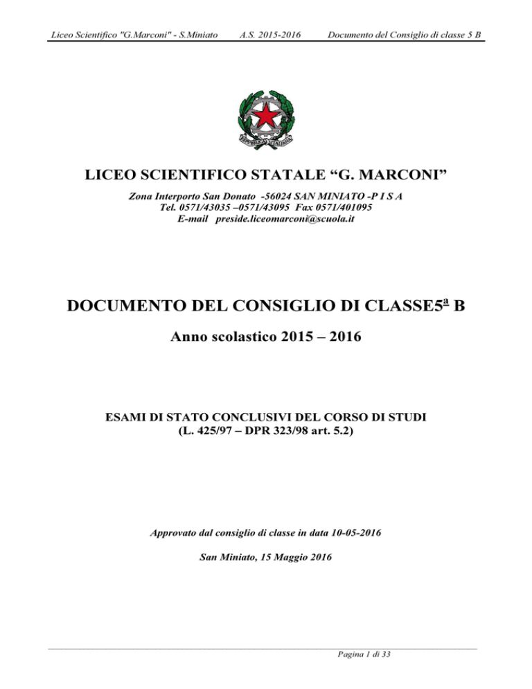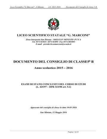 Liceo Scientifico "G.Marconi" - S.Miniato A.S. 2015-2016 Documento del Consiglio di classe 5 B LICEO SCIENTIFICO STATALE “G. MARCONI” Zona Interporto San Donato -56024 SAN MINIATO -P I S A Tel. 0571/43035 –0571/43095 Fax 0571/401095 E-mail [email protected] DOCUMENTO DEL CONSIGLIO DI CLASSE5a B Anno scolastico 2015 – 2016 ESAMI DI STATO CONCLUSIVI DEL CORSO DI STUDI (L. 425/97 – DPR 323/98 art. 5.2) Approvato dal consiglio di classe in data 10-05-2016 San Miniato, 15 Maggio 2016 ________________________________________________________________________________________________ Pagina 1 di 33 Liceo Scientifico "G.Marconi" - S.Miniato A.S. 2015-2016 Documento del Consiglio di classe 5 B CONTENUTO: ♦ Presentazione sintetica della classe ______________________________ ♦ Programmazione e obiettivi del Consiglio di classe ________________________ ♦ Metodi e strumenti di lavoro ___________________________________________ ♦ Attivitàextracurricolari________________________________________________ ♦ Attività pag. 3 pag. 4 pag. 5 pag.5 ♦ Verifiche e criteri di valutazione _______________________________________ pag. 7 ♦ Simulazioni delle prove d'esame________________________________________ pag 7 ♦ Griglie di valutazione _______________________________________________ pag. 8 ♦ Programmi delle singole discipline • Lingua e letteratura italiana ________________________________________ pag. 13 • •• Lingua e cultura latina ____________________________________________ pag. 16 Lingua e Letteratura Inglese ________________________________________ pag. 17 • Storia _________________________________________________________ pag. 19 • Filosofia _______________________________________________________ pag. 19 • Matematica _____________________________________________________ pag. 20 • Fisica _________________________________________________________ pag. 21 • •• Scienze _______________________________________________________ pag. 23 Disegno e storia dell’arte __________________________________________ pag. 25 • Scienze Motorie ________________________________________________ pag. 31 • Religione Cattolica _______________________________________________ pag. 32 ♦ Composizione del Consiglio di classe ___________________________________ pag. 33 ♦ Rappresentanti di classe ______________________________________________ pag. 33 ________________________________________________________________________________________________ Pagina 2 di 33 Liceo Scientifico "G.Marconi" - S.Miniato A.S. 2015-2016 Documento del Consiglio di classe 5 B PRESENTAZIONE SINTETICA DELLA CLASSE La classe 5aB si presenta al termine dell’attuale ciclo di studi composta da 27 allievi, 15 ragazze e 12 ragazzi. Tale composizione si è modificata in modo apprezzabile nell’arco del quinquennio: in prima la classe era composta da 31 alunni, dei quali 4 hanno cambiato indirizzo di studi (una durante l’anno scolastico, uno nel periodo estivo, due respinti). In seconda si sono aggiunti due studenti, uno proveniente dal nostro liceo, l’altro da un diverso istituto ed è stata respinta un'alunna. In terza si è iscritto un nuovo studente, che poi si è ritirato a metà anno, mentre alla fine dell’anno non è stata promossa un'altra alunna. Uno studente è stato respinto al termine della quarta ed un’altra ragazza ha cambiato scuola. Infine in quinta si sono inseriti due studenti provenienti dallo stesso indirizzo di questo Liceo. Anche la composizione del Consiglio di Classe si è molto modificata negli anni. La classe ha goduto della continuità didattica solo per Inglese, Scienze, Storia dell’Arte e Religione. Numerosi sono stati invece gli avvicendamenti nell’insegnamento delle altre discipline: Italiano (una insegnante al biennio e una al triennio), Latino ( una insegnante in prima, una in seconda, una in terza ed una negli ultimi due anni), Matematica ( una insegnante in prima, una in seconda, una in terza ed una negli ultimi due anni), Fisica ( un insegnante nel primo biennio, una nel triennio), Storia ( una insegnante in prima, una in seconda, una in terza ed uno negli ultimi due anni), Filosofia ( una insegnante in terza, due nel corso della classe quarta ed uno in quinta), Scienze Motorie ( una insegnante in prima, una in seconda, una in terza e quarta ed una in quinta). Nonostante tutti questi cambiamenti, la socializzazione tra gli studenti è cresciuta e maturata in modo continuo parallelamente alla loro crescita individuale. La classe si è dimostrata accogliente con i nuovi arrivi e disponibile al dialogo con gli insegnanti. Durante tutto il quinquennio, e in particolare in questi ultimi tre anni, i legami tra i ragazzi si sono formati e rafforzati e si può affermare che oggi si osservano rapporti corretti e improntati a senso di solidarietà e collaborazione. Nell’interazione con i docenti i ragazzi hanno di solito avuto un comportamentoaperto, spontaneo e rispettoso permettendo in genere un lavoro di classe sereno e collaborativo, anche se la mancanza di continuità didattica non ha certo favorito lo sviluppo di un metodo di lavoro efficace e di una visione globale delle discipline. Tuttavia gli studenti si sono mostrati in generale interessati e disponibili ad essere coinvolti nelle proposte educative, anche se un piccolo gruppo non sempre ha seguito con costanza e partecipazione attiva le lezioni e si è impegnato in maniera talvolta saltuaria. Di conseguenza il rendimento finale risente di tali differenze nei comportamenti: pur mostrando la classe un’immagine globalmente positiva, si possono individuare al suo interno quattro gruppi. Del primo gruppo fanno parte quegli studenti che si sono distinti per un impegno regolare in tutte le discipline, per un’attiva partecipazione al lavoro in classe, per la loro capacità di adattamento alle diverse richieste e per le apprezzabili capacità di analisi, sintesi e autonomia di giudizio, raggiungendo spesso ottimi risul