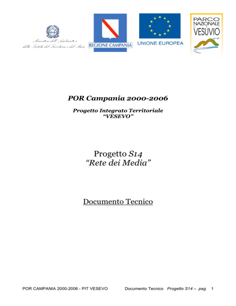 POR Campania 2000-2006 Progetto Integrato Territoriale “VESEVO” Progetto S14 “Rete dei Media” Documento Tecnico POR CAMPANIA 2000-2006 - PIT VESEVO Documento Tecnico Progetto S14 – pag 1 INDICE MOTIVAZIONI DEL PROGETTO .......................................................................... 2 DESCRIZIONE DELLE ATTIVITA' ....................................................................... 3 DESCRIZIONE DELLE REALIZZAZIONI ............................................................. 5 INTEROPERABILITA'........................................................................................... 7 PIANO DI ATTIVITA' .......................................................................................... 9 PIATTAFORMA TECNOLOGICA ......................................................................... 11 BANCHE DATI: PREESISTENZE, PROGETTAZIONE E CARICAMENTO ........ 12 INSTALLAZIONE ................................................................................................ 13 ADDESTRAMENTO ALLA CONDUZIONE E ALL’ UTILIZZO DEL SISTEMA .... 13 COLLAUDO E MESSA IN ESERCIZIO ............................................................... 14 MANUTENZIONE HARDWARE, SOFTWARE DI BASE E APPLICATIVO ....... 14 ALTRE DISPOSIZIONI GENERALI ................................................................... 14 ALLEGATO 1: DOTAZIONE HARDWARE & SOFTWARE ESISTENTE........... 17 ALLEGATO 2: SCHEDA TECNICA HARDWARE DA FORNIRE ....................... 18 POR CAMPANIA 2000-2006 - PIT VESEVO Documento Tecnico Progetto S14 – pag 2 MOTIVAZIONI DEL PROGETTO L’esigenza, sempre più forte ed avvertita negli ultimi anni, di offrire agli operatori ed ai fruitori del Parco Nazionale del Vesuvio, strumenti utili per rappresentare, esaltare, condividere e distribuire dati, informazioni e conoscenza, ha generato l’esigenza del Parco di dotarsi di una struttura informativa che realizzi un un’ infrastruttura di back office ed un database territoriale per la raccolta e la centralizzazione delle informazioni sul territorio e la messa in rete delle stesse. Il progetto “Rete dei Media” deve considerarsi un tassello all’interno del più vasto piano di sviluppo economico sociale dell’area di riferimento e vuole contribuire all’integrazione ed armonizzazione delle attività di definizione e programmazione degli interventi che si stanno coordinando e promuovendo sul territorio al fine della sua riqualificazione per soddisfare bisogni contingenti e futuri di fruizione, valorizzazione e promozione, con particolare riferimento al settore dei beni culturali ed ambientali. Per la realizzazione dell’idea-forza del PIT Vesevo è necessario valorizzare le risorse del patrimonio del parco nel suo insieme e nelle sue peculiarità paesaggistico/ambientali, culturali, storiche, archeologiche e tradizionali attraverso una “rete” capace di recuperare la forte “identità” del territorio che da sempre lo contraddistingue e lo rende unico al mondo. Il progetto rappresenta in particolare un lotto funzionale del progetto portante del PI VESEVO: “Cultura, Organizzazione e Strumenti per il Governo Ambientale del Parco (GAP)”. Pertanto nell’ambito dell’intervento ‘Rete dei Media’ l’Ente Parco Nazionale del Vesuvio intende attuare un intervento innovativo teso a realizzare servizi di qualità tramite l’applicazione di nuove tecnologie. L’intervento prevede la creazione di una rete informatica che, oltre a contribuire alla riuscita della strategia del PI, è funzionale allo scambio di informazioni tra i Comuni e alla divulgazione all’esterno, al più ampio target, delle peculiarità del Parco nazionale del Vesuvio.” Il progetto è stato formulato allo scopo di sviluppare, mediante interventi strutturati in termini di strumenti e servizi, opportuni sostegni informativi di comunicazione. POR CAMPANIA 2000-2006 - PIT VESEVO Documento Tecnico Progetto S14 – pag 3 DESCRIZIONE DELLE ATTIVITA’ Il Progetto prevede un insieme coordinato di interventi volti a realizzare servizi di qualità tramite l’applicazione di nuove tecnologie delle comunicazioni e telematiche, in grado di indurre più avvincenti e qualificate motivazioni di frequentazione di un territorio a vocazione turistica e costituire un’interfaccia moderna e ad alto valore aggiunto nella comunicazione finalizzata alla promozione del Parco Nazionale del Vesuvio. Innanzitutto si prevede la predisposizione e messa a punto dell' infrastrutturazione tecnologica (l’ allegato 1 riporta la dotazione hardware/software ed i servizi IT attualmente disponibili presso l’Ente Parco) e delle necessarie piattaforme hardware e software con cui poter assumere e portare avanti gli impegnativi compiti che il progetto si pone, in particolar modo predisponendo una rete, che a completamento ed integrazione di quella esistente, supporti l’interoperabilità dei dati e la tecnologia del Geographic Information System. Il progetto Rete dei Media progetta e realizza anche un database territoriale (da ora geodatabase), accessibile sia da progetti desktop GIS sia attraverso soluzioni WEBGIS, per la raccolta, la catalogazione e la informativo che comprenderà le gestione dei dati normalizzati relativi al patrimonio principali risorse e caratteristiche specifiche del territorio, anche attraverso la digitalizzazione e georeferenziazione delle diverse aree, rispetto alle due aree tematiche (Archivio informatizzato per la tutela ambientale e di promozione territoriale). L’ archivio informatizzato per la tutela ambientale sarà in grado di ottimizzare le attività di tutela e prevenzione e permetterà una perfetta integrazione ed elaborazione di dati geografici, amministrativi, statistici già in possesso dell’ Ente Parco nazionale del Vesuvio. L’obiettivo è quello di far confluire in un unico database i dati alfanumerici e geografici, la cartografia tecnica, i piani regolatori, le immagini storiche, ecc. per integrare le informazioni esistenti. L